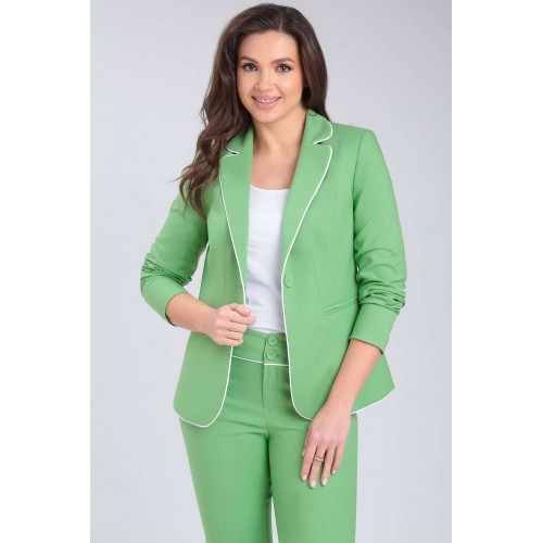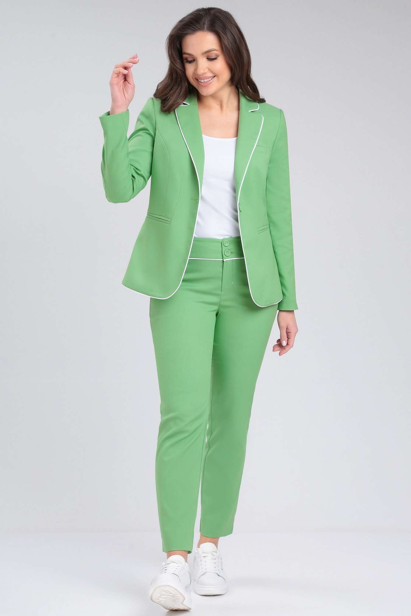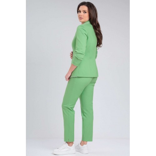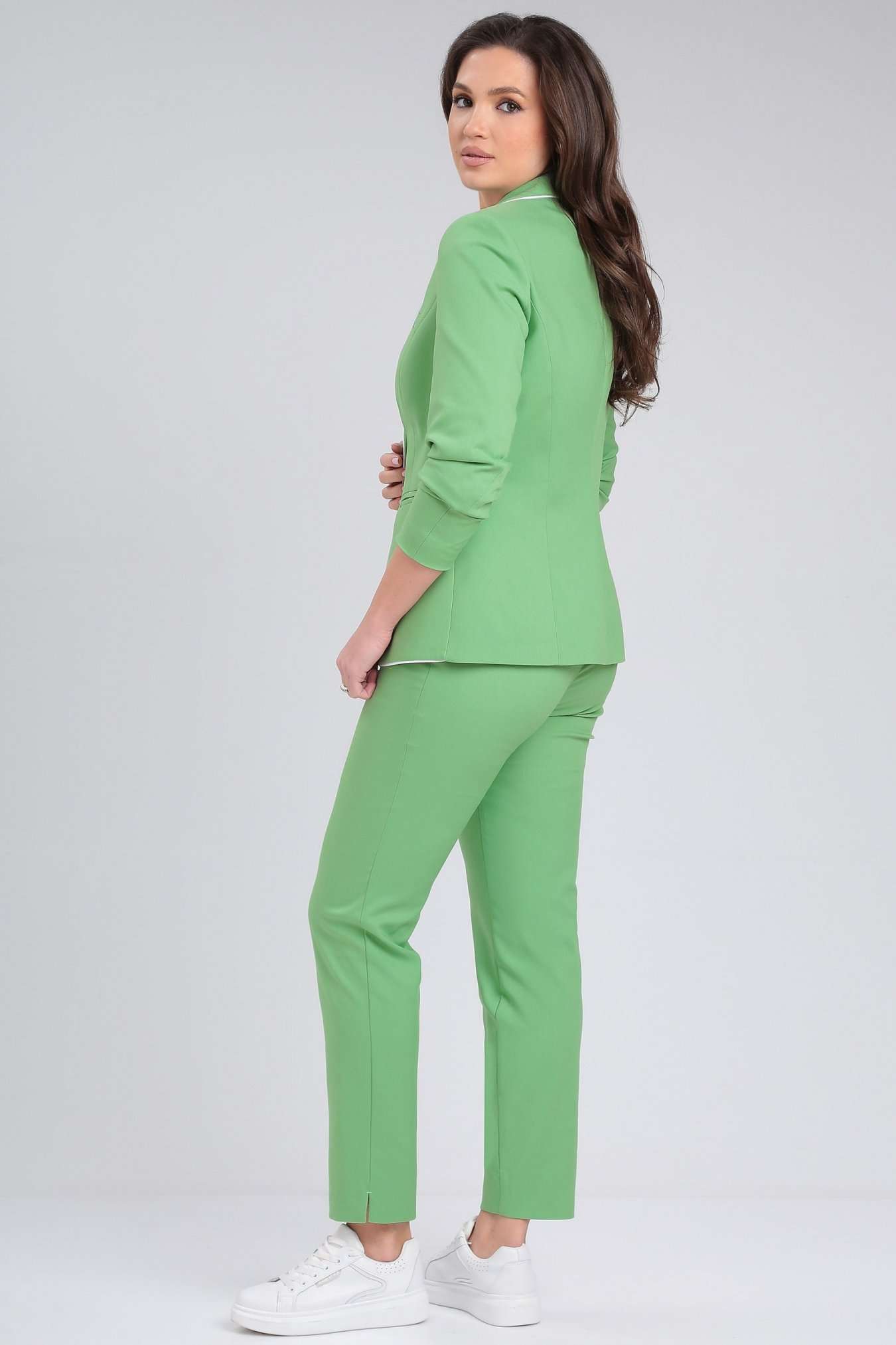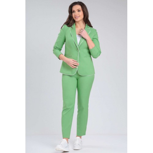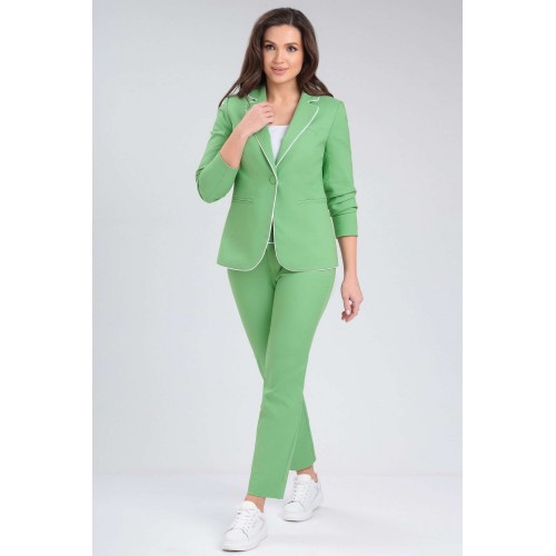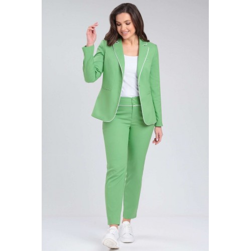 Комплект женский состоящий из жакета, джемпера и брюк. Жакет полуприлегающего силуэта на фирменной подкладке. По переду декоративные вытачки, рельефы и функциональные прорезные карманы в рамку, слева листочка-обманка. Воротник пиджачного типа с закругленными концами. Застежка центральная бортовая на петлю и обтяжную пуговицу. Рукав длинный втачной, двухшовный. Джемпер женский полуприлегающего силуэта без рукава, вырез горловины круглый. Брюки укороченные, зауженные к низу на притачной кокетке-поясе застегивающейся на петли и обтяжные пуговицы. По низу брюк разрезы. Воротник, борт, низ рукава и кокетка брюк с декоративным кантом из отделочного материала.