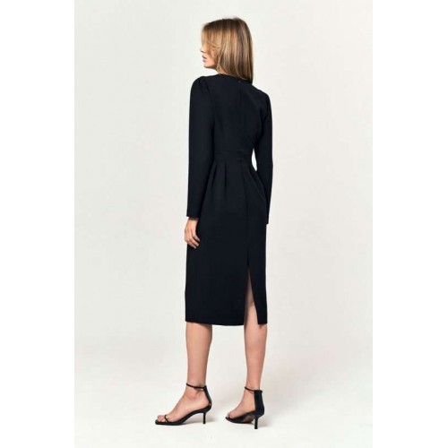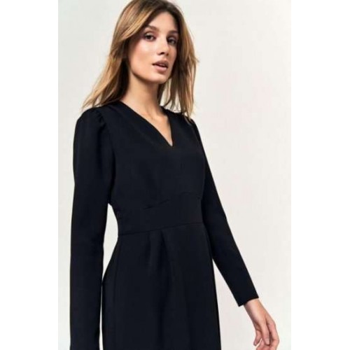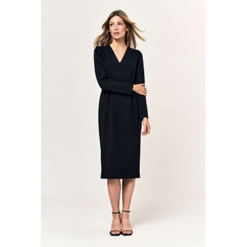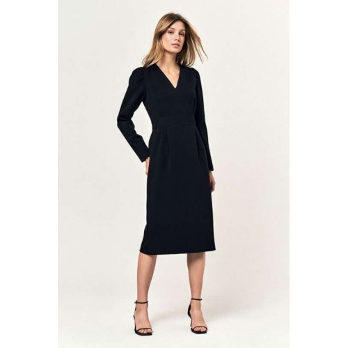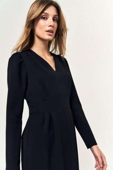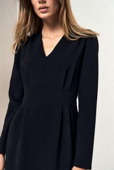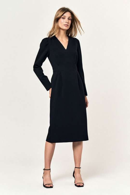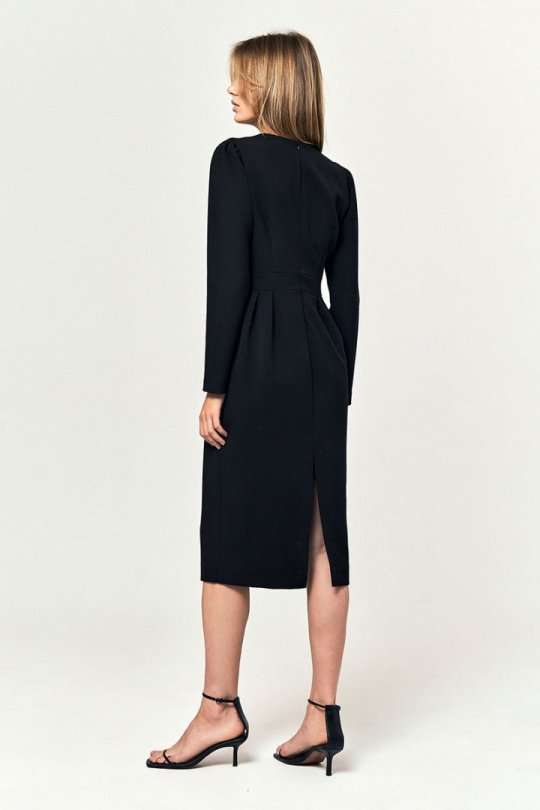 Платье женское приталенное длиной ниже линии колена на нежной эластичной подкладке. Вырез V-образный. Отрезное по линии талии. По переду ниже линии груди подрез с возвышение по центру, от горловины до подреза средний шов, на уровне вытачек от подреза вверх и вниз заложены по две односторонние складки. По плечевому срезу переда -сборка. Спинка со средним швом, с талиевыми вытачками выше линии подреза и двумя складками ниже линии подреза. В среднем шве спинки застежка на потайную тесьму-молнию и разрез. Рукав одношевный, втачной со сборкой по окату. Это платье будем чудесным решением для торжественного мероприятия или будет радовать Вас своим удобством в повседневной носке.