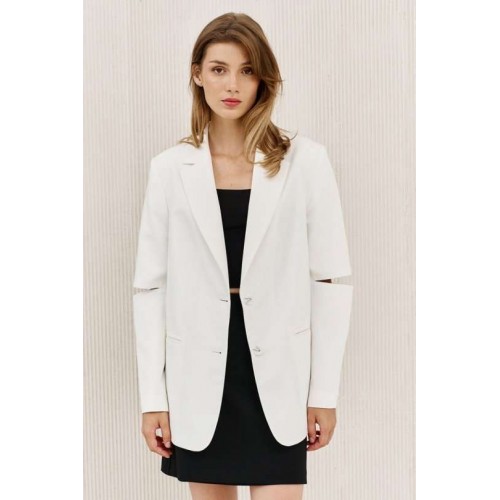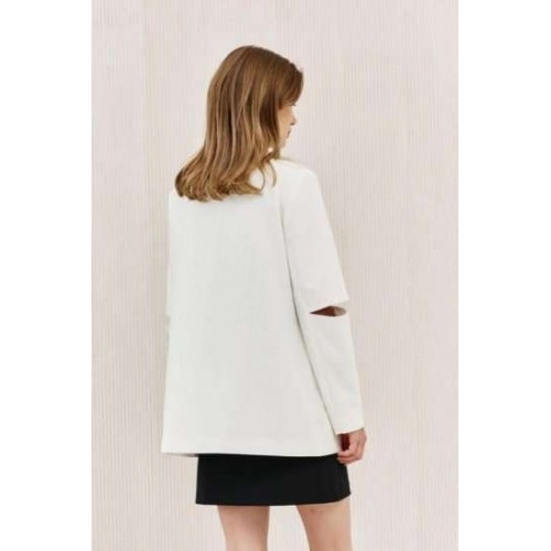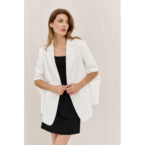 Жакет прямого силуэта на эластичной шелковистой подкладке. Перед с декоративными вытачками и функциональными карманами в рамку. Воротник пиджачного типа. Застежка центральная бортовая застегивающаяся на 2 декоративных пуговицы, край борта закруглен. Рукав длинный втачной с горизонтальным разрезом выше линии локтя.