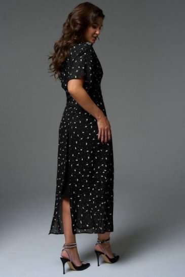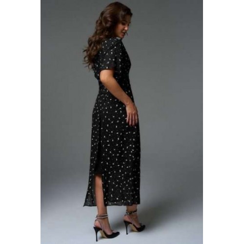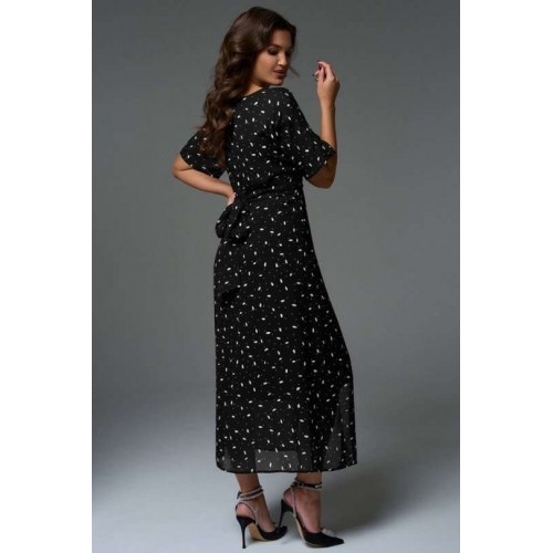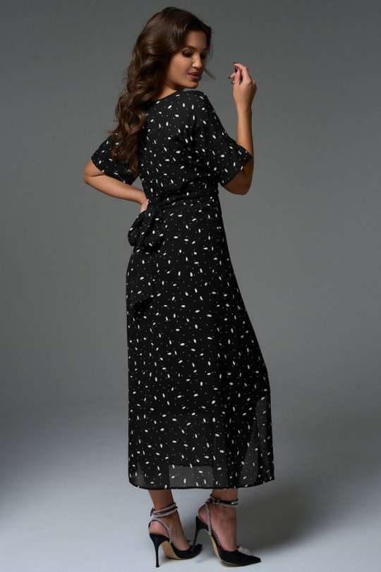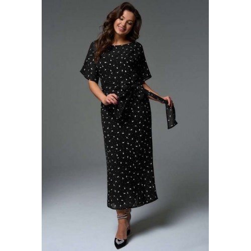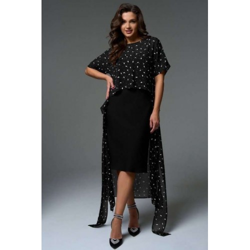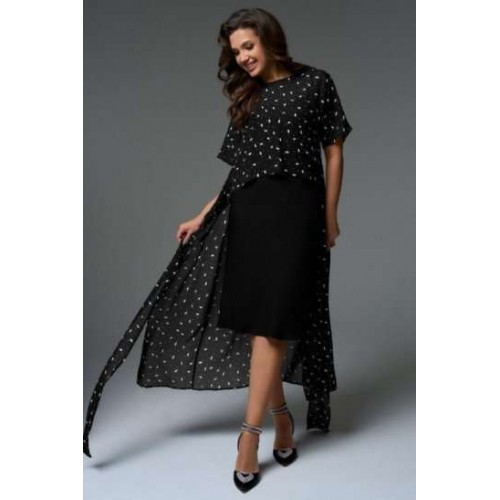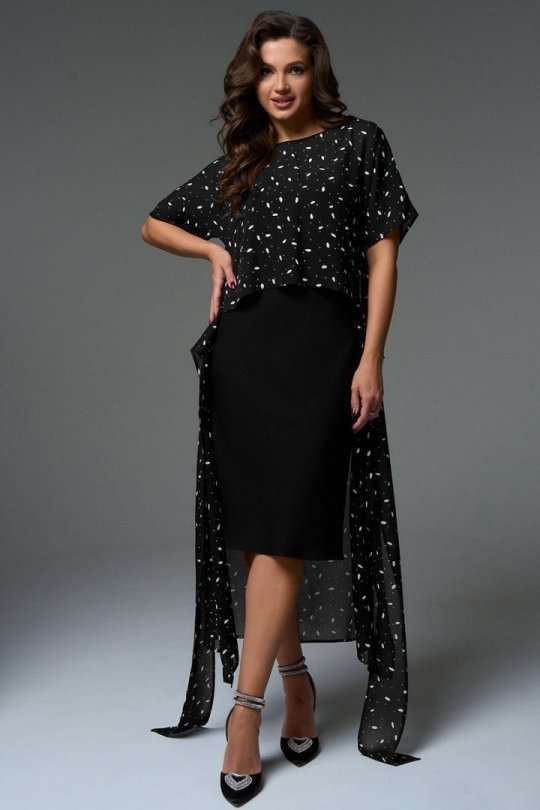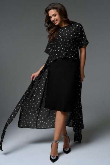 Комплект состоит из платья-кимоно и платья-комбинации. Платье-кимоно выполнено из вискозного шифона, прямого силуэта с цельнокроеными рукавами. Перед платья состоит из верхней укороченной части длиной чуть ниже линии талии и двух нижних частей с длинными цельнокроеными поясами, которые позволяют экспериментировать с образом. Платье-трансформер даёт возможность носить его как передом, так и спинкой, а также использовать, как тунику под брюки или юбку. Платье-комбинация, прямого силуэта с регулируемыми бретелями, длиной миди. Благодаря косому крою платье мягко подчеркнут изгибы фигуры, при этом не сковывая движения.