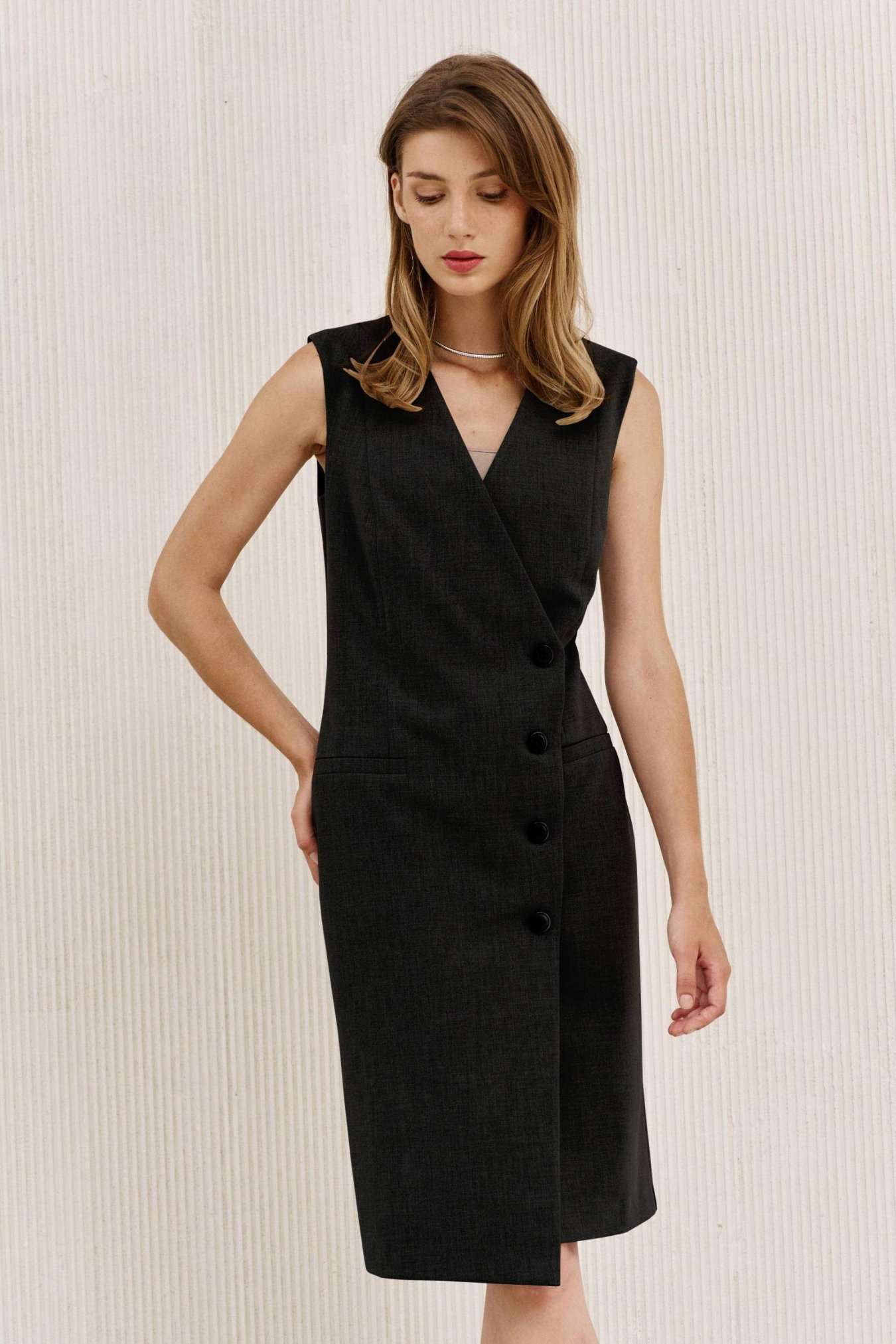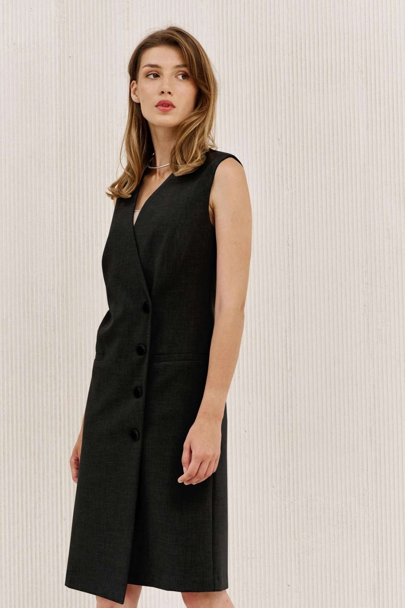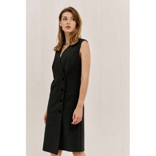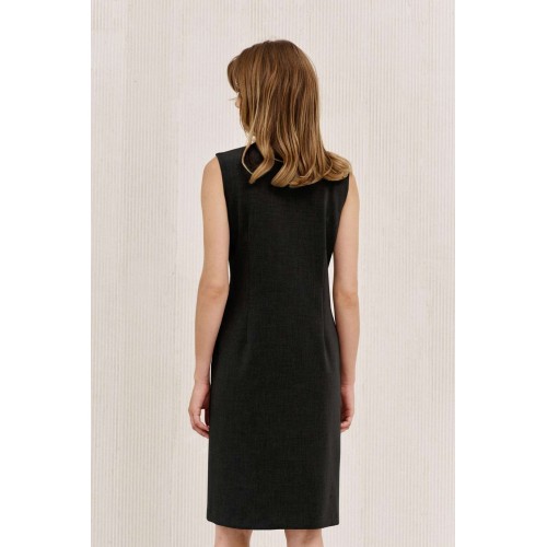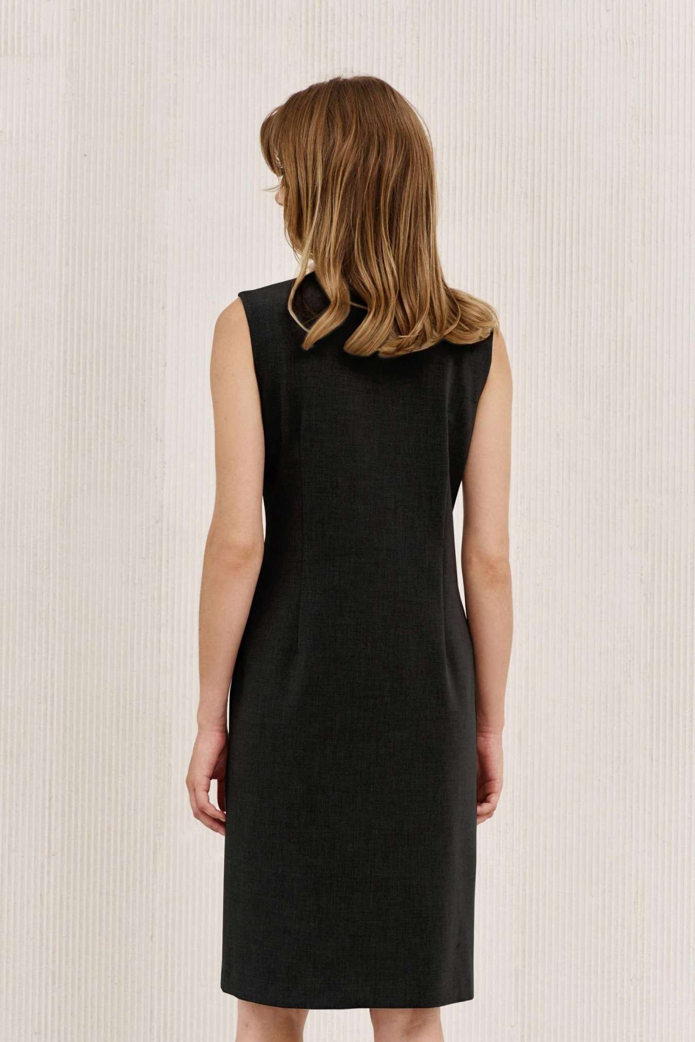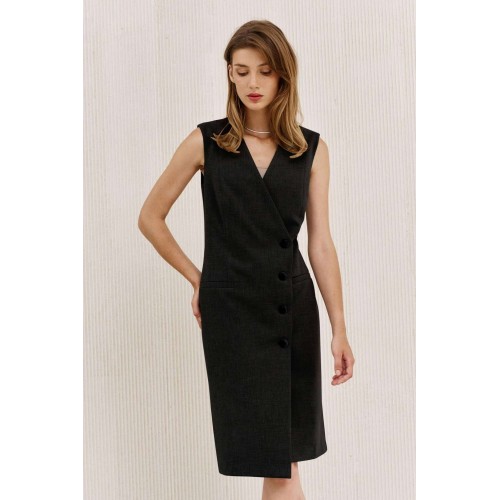 Платье на подкладке, полуприлегающего силуэта длиной ниже линии колена. По переду полурельеф из плечевого шва, прорезной карман с листочкой. Спинка с талиевыми вытачками. Вырез горловины V-образный. Застежка смещенная на петли и пуговицы и одну потайную кнопку.