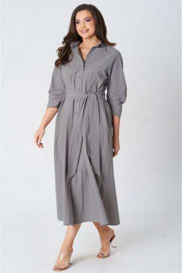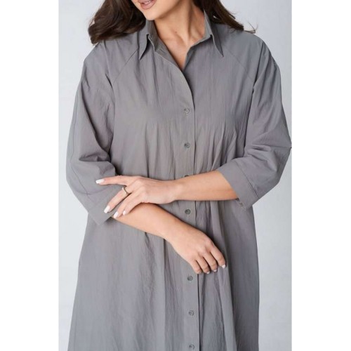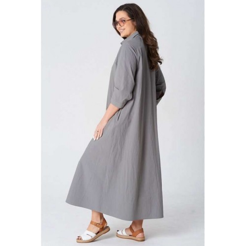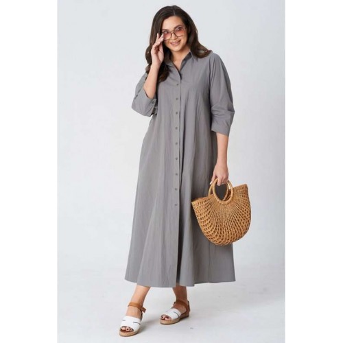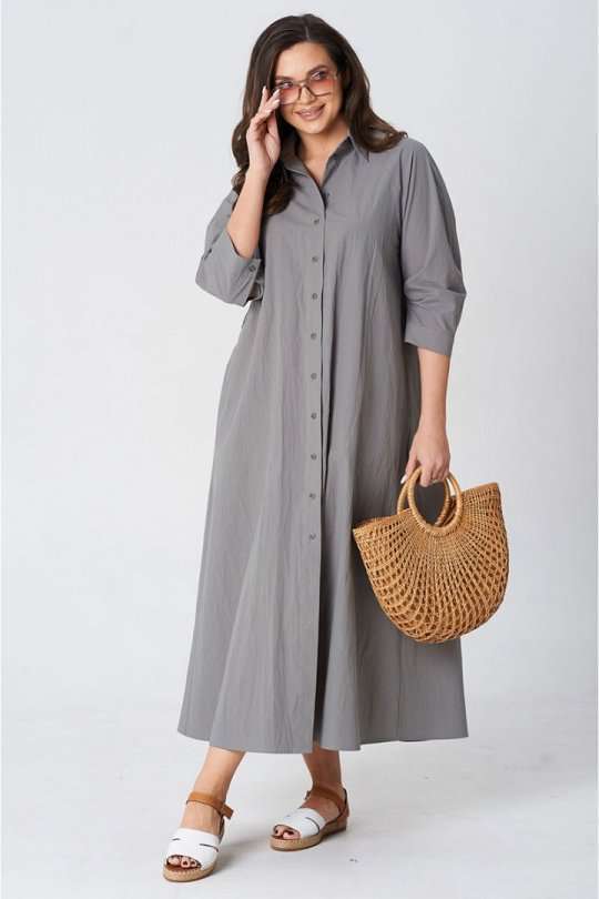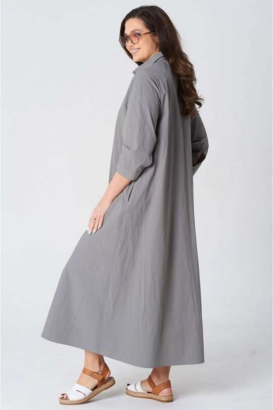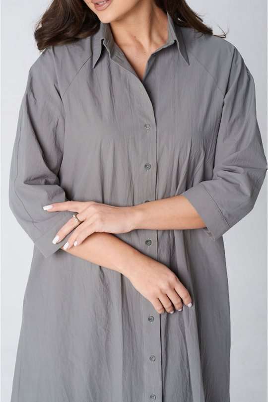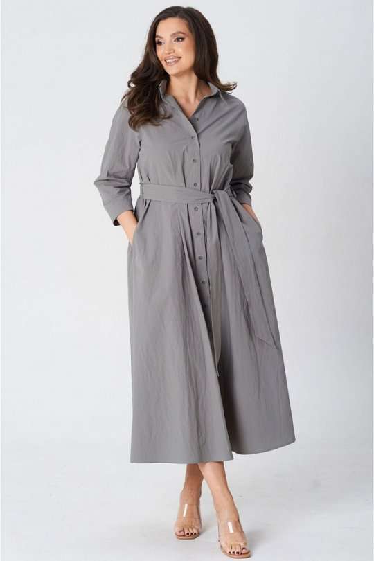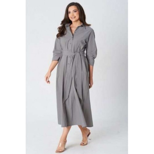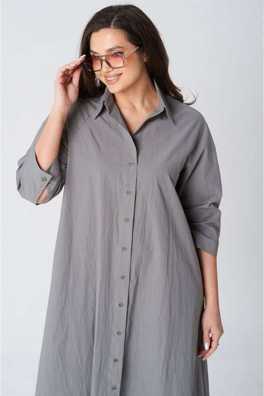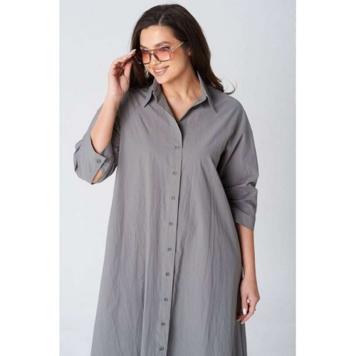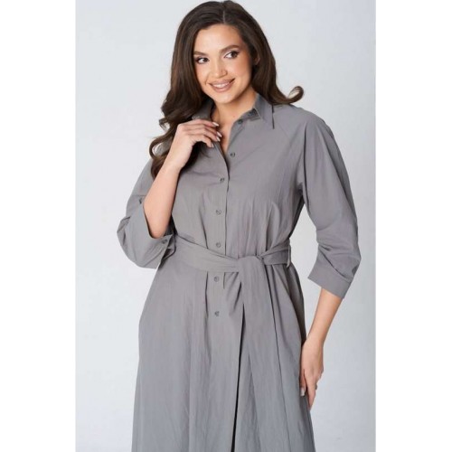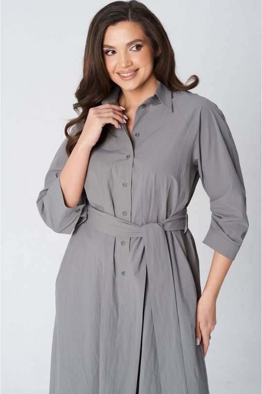 Платье покроя реглан, свободного силуэта, расширенное к низу. Застежка центральная бортовая на петли и пуговицы. Воротник рубашечный с отрезной стойкой. Рукав длиной ниже линии локтя на манжете застегивающейся на петлю и пуговицу. В боковых швах платья карманы. В комплект входит пояс из основной ткани.