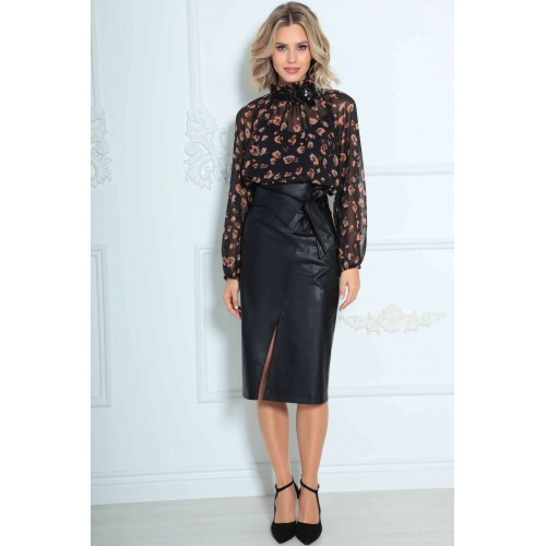 Юбка женская из кожи на подкладке, длиной ниже колена с завышенной линией талии. По переднему полотнищу функциональные прорезные карманы с листачкой, наклонным подрезом и разрезом в нем. По заднему полотнищу средний шов и вытачки. Юбка на притачном поясе со шлевками и декоративным отворотом. В комплект входит съемный пояс из основной ткани.