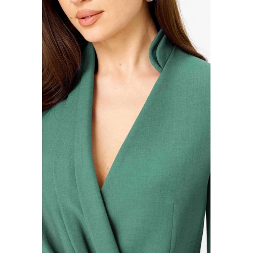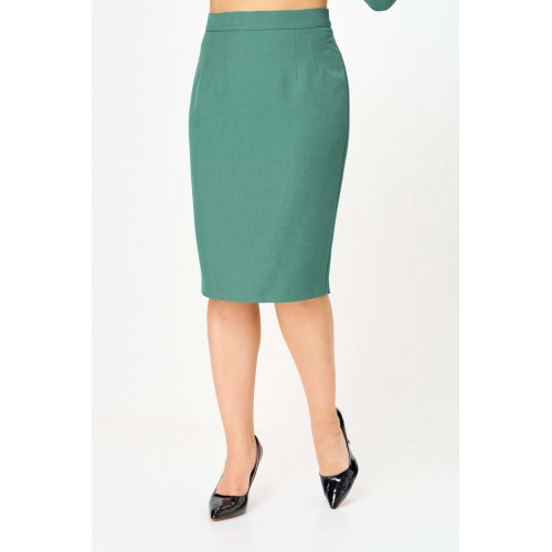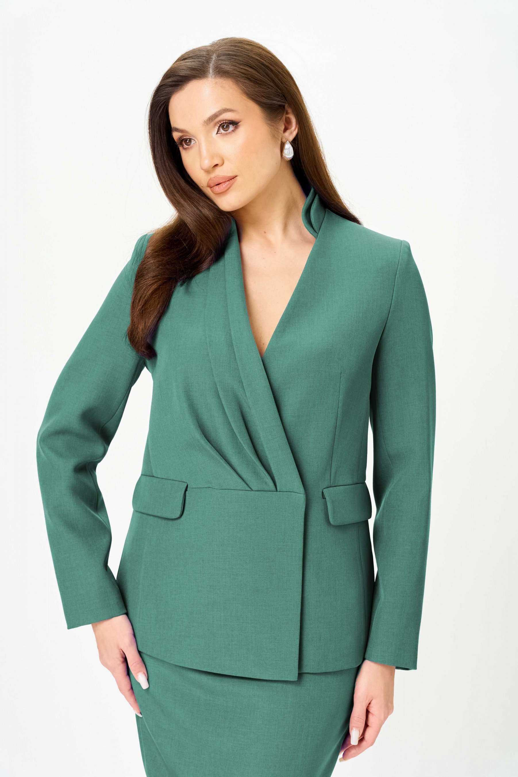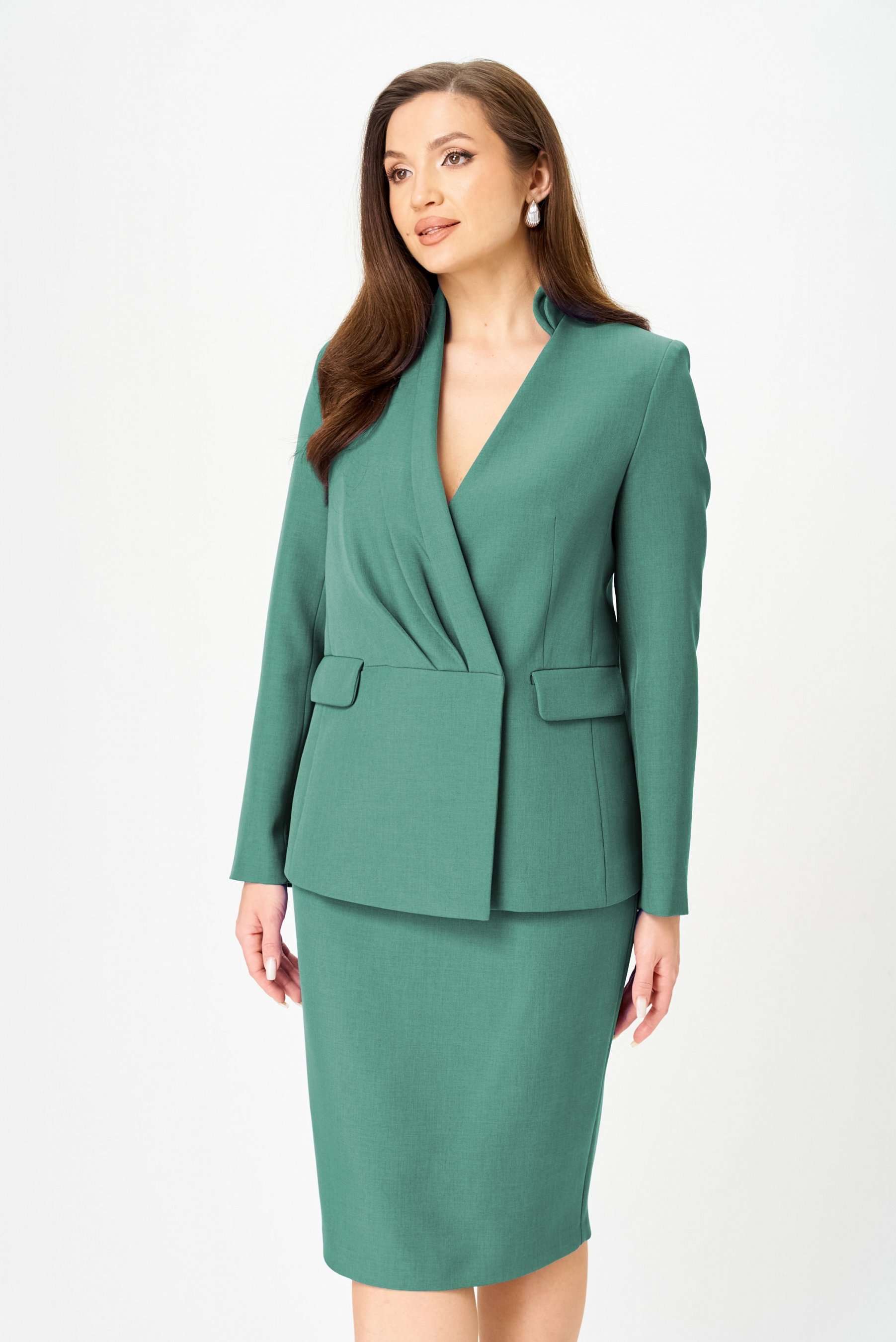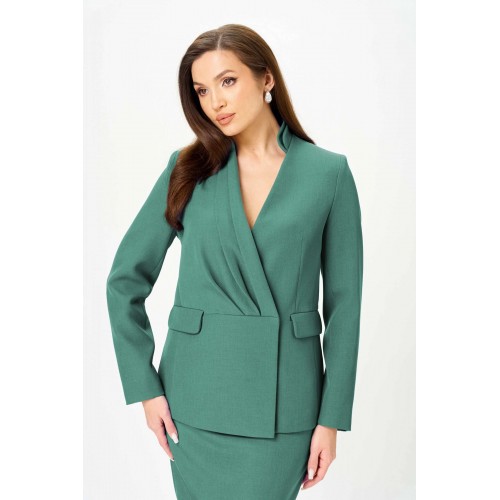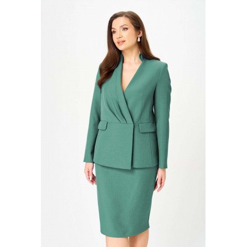 Комплект состоит из жакета и юбки. Жакет полуприлегающего силуэта на подкладке. По переду отрезные бочки, функциональные прорезные карманы с клапаном и асимметричный декоративный элемент в виде трёх мягких складок выходящих из подреза по талии по правой стороне переда, переходящий в двойной воротник-стойку по левой стороне переда. Спинка со средним швом и рельефами из проймы. Рукав длинный, втачной, двухшовный. Юбка на подкладке, со шлицей, зауженная к низу, с притачным поясом. В размерах 50-54 для комфорта в пояс по бокам вставлена резинка. Застежка в юбке на потайную тесьму-молнию в среднем шве заднего полотнища. Данная модель станет чудесным дополнением в Вашем гардеробе, выступая интересным офисным костюмом или, выполняя функцию сдержанного варианта для торжественных мероприятий.