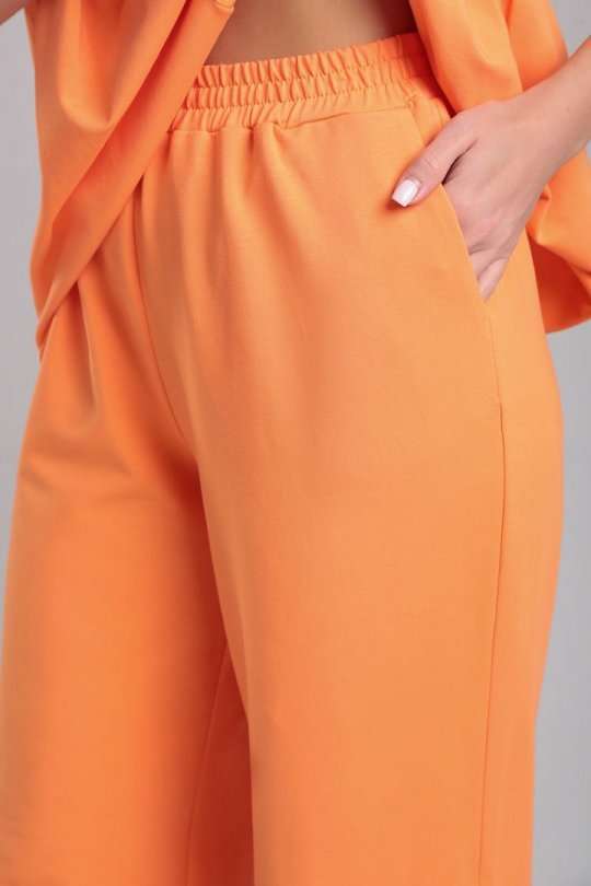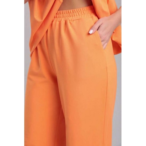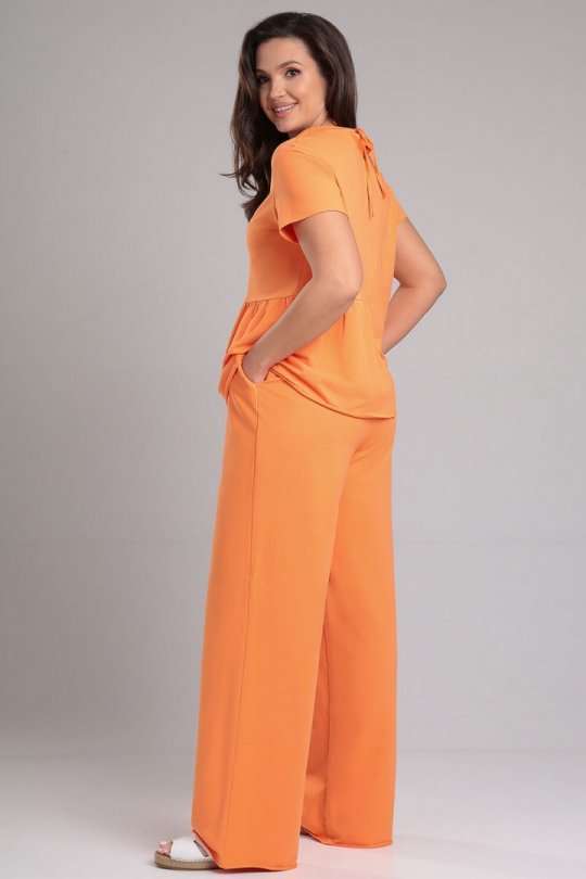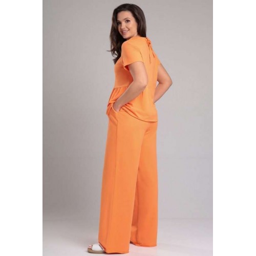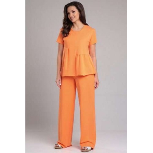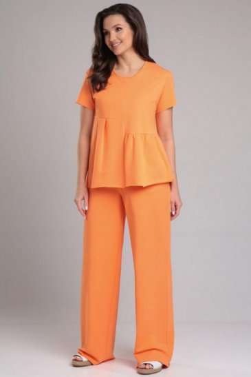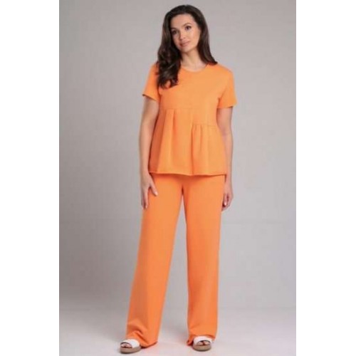 Комплект женский, состоящий из футболки и брюк. Футболка прямого силуэта со средним швом и асимметричными горизонтальными подрезами. Нижняя правая часть переда с одной складкой, по левой части переда сборка. Спинка со средним швом и горизонтальным подрезом на левой стороне, от подреза спроектирована сборка. Рукав втачной, одношовный, короткий. Вырез горловины круглый, окантован основной тканью, по горловине спинке завязки. Брюки прямые, на притачном поясе с резинкой, без застёжки. По переду расположены функциональные боковые карманы-хулиганы. Низ рукава, брюк и футболки не обработаны.