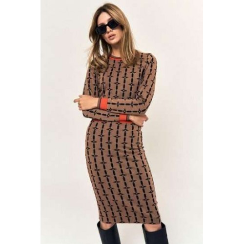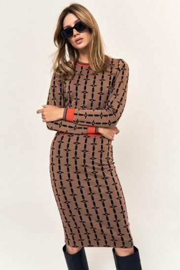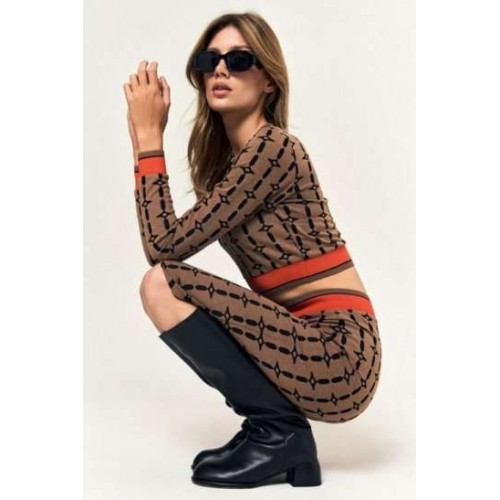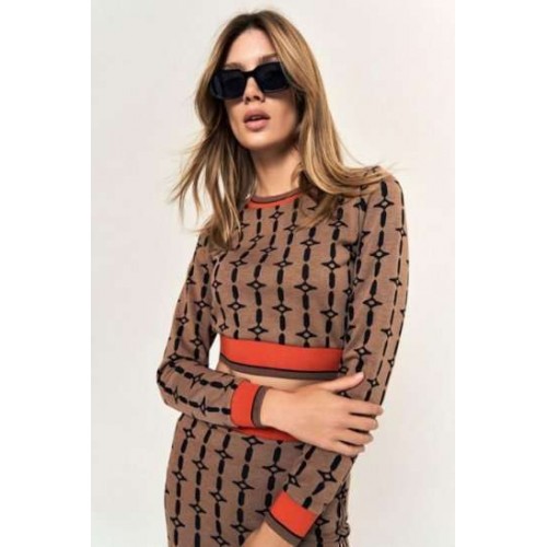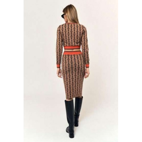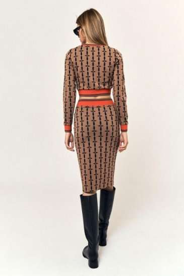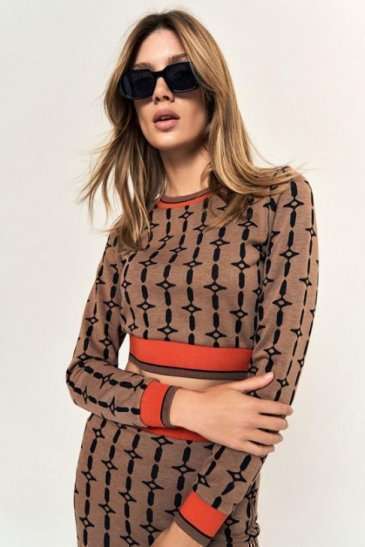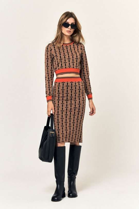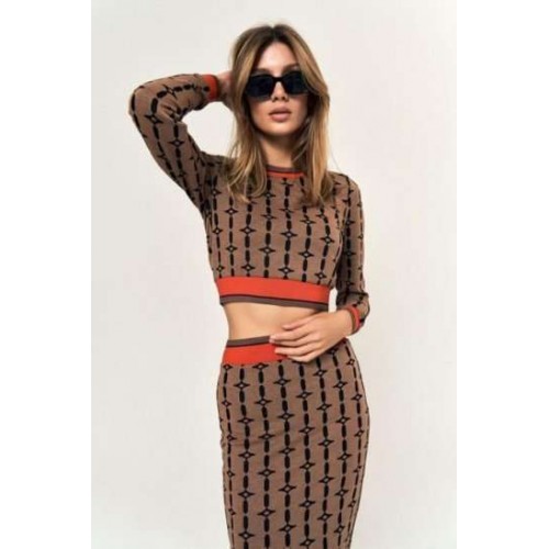 Комплект женский из трикотажного полотна состоящий из укороченного джемпера и юбки. Джемпер приталенного силуэта, втачного покроя. Вырез горловины круглый. Рукава длинные, одношовные. По низу рукава, низу изделия и горловине притачен довяз контрастного цвета. Юбка прямая с поясом, длиной ниже линии колена. Функцию пояса выполняет довяз, как на джемпере.