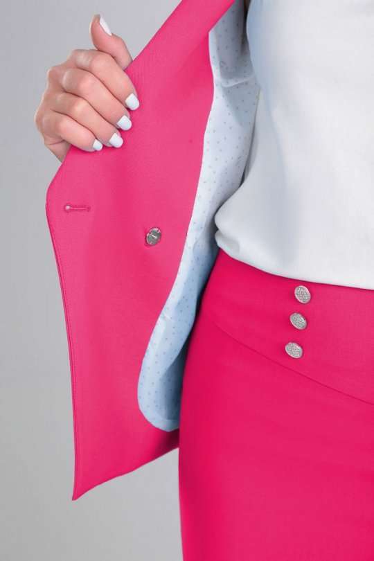 Комплект женский состоящий из жакета, юбки и блузки на бретелях. Жакет полуприлегающего силуэта на подкладке. По переду нагрудная выточка и прорезные функциональные карманы с клапаном. По спинке вертикальные рельефы из проймы и средний шов. Застежка ассиметричная (сверху двубортная, снизу однобортная) бортовая застегивающаяся на петли и декоративные пуговицы. Воротник пиджачного типа. Рукав втачной двухшовный длинный. Топ из трикотажного полотна на узких регулируемых бретелях. Юбка на подкладке зауженная к низу на обтачке (без пояса). По переду фигурная кокетка и средний шов с разрезом. Застежка на потайную тесьму-молнию в среднем шве спинки.