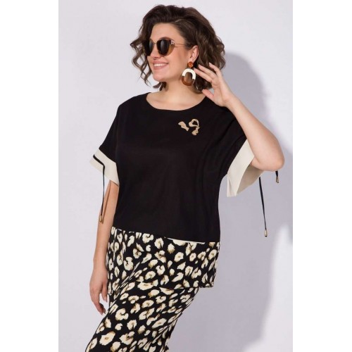 Шикарный летний женский костюм, состоящий из блузы и прямых брюк. Блузон с округлым вырезом горловины и спущенным цельнокроеным рукавом. Низ рукава оформлен фигурным манжетам из отделочной ткани с декоративными фестонами на шнуровке. Чуть ниже талии блузон отрезной с ассиметричной линией низа и небольшим кармашком в шве! Сбоку расположен разрез! Лиф украшен деревянной фурнитурой! В комплекте прямые свободные брюки, выполнены из креповой ткани с оригинальным дизайном! Брюки на притачном поясе с резинкой по кругу; в боковых швах брюк предусмотрены карманы! Данный костюм, в котором комфортно гулять даже в самую жаркую погоду, идеален для путешествия, прогулок, а также отлично подойдёт для повседневных образов! Длина блузона – 68-77см. (асимметрия), брюк – 104-106 см.