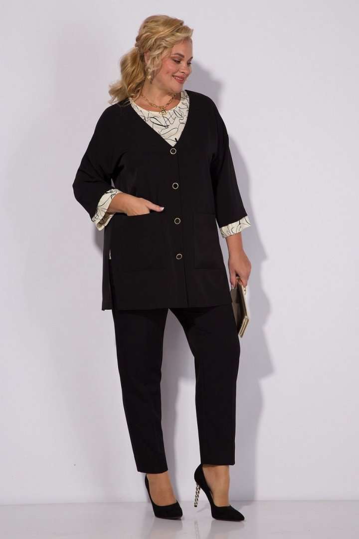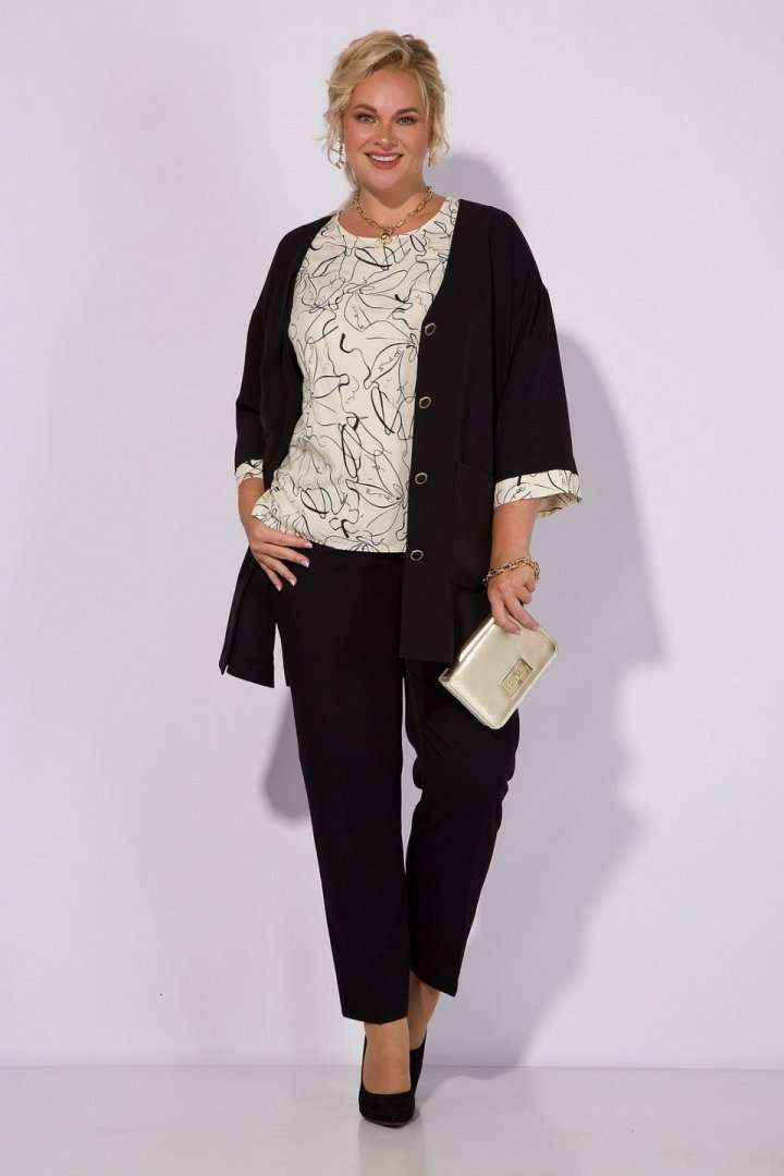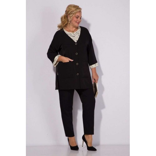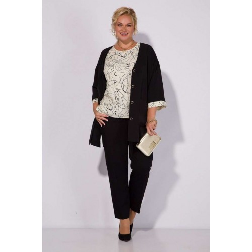 Стильный женский комплект 2-ка, состоит из облегченного кардигана и топа. Кардиган с v-образным вырезом горловины, с центральной бортовой застёжкой на пуговицы. Рукав на спущенном плече, длиной 4/4-ти с манжетами из отделочной ткани. По полочке расположены накладные карманы. По бокам предусмотрены разрезы для свободы движения. Изюминкой данной модели служит оригинальная спинка с подрезом и декоративным элементом в виде цепи. В комплект входит топ из вискозной ткани. Топ без рукавов, с округлым вырезом горловины, спинка длиннее чем перед. Классические женские брюки в комплекте, со средней посадкой, прямого покроя от бедра. Застежка – брючная тесьма-молния с обработанным гульфиком. Карманы боковые. Пояс притачной, в боковых участках вставлена резинка на свободу. По переду заутюжены канты. Спинка с Талиевыми выточками. Подгибка брюк –– 4 см. Длина кардигана – по спинке – 85 см, рукав – 75 см. Топ по спинке – 75 см, по переду 65 см. Брюки – 100 см+пояс.