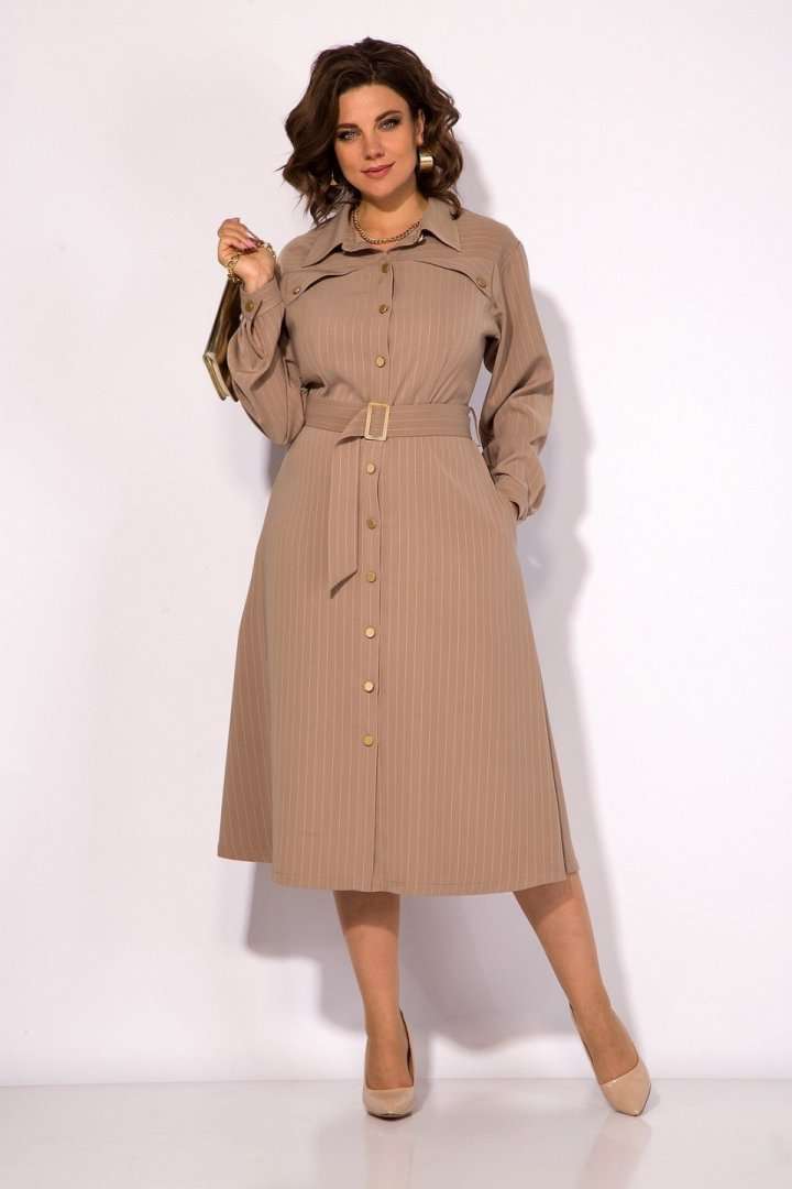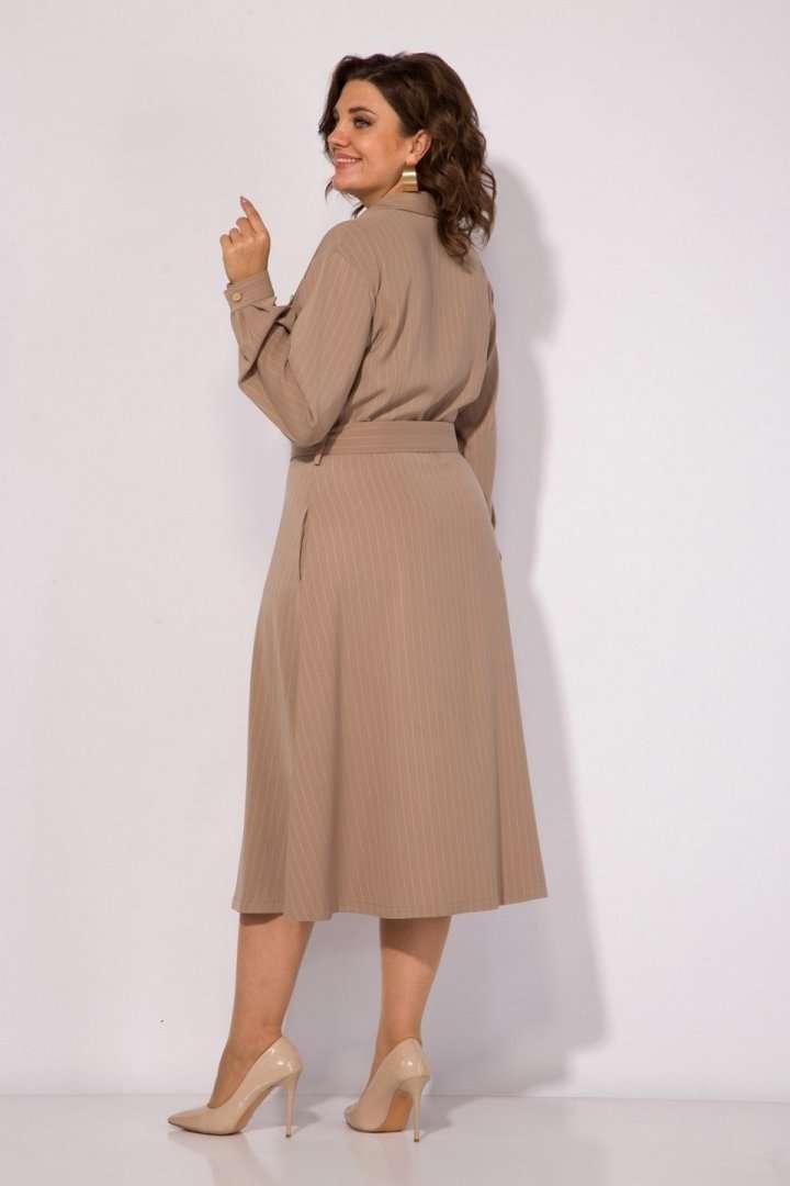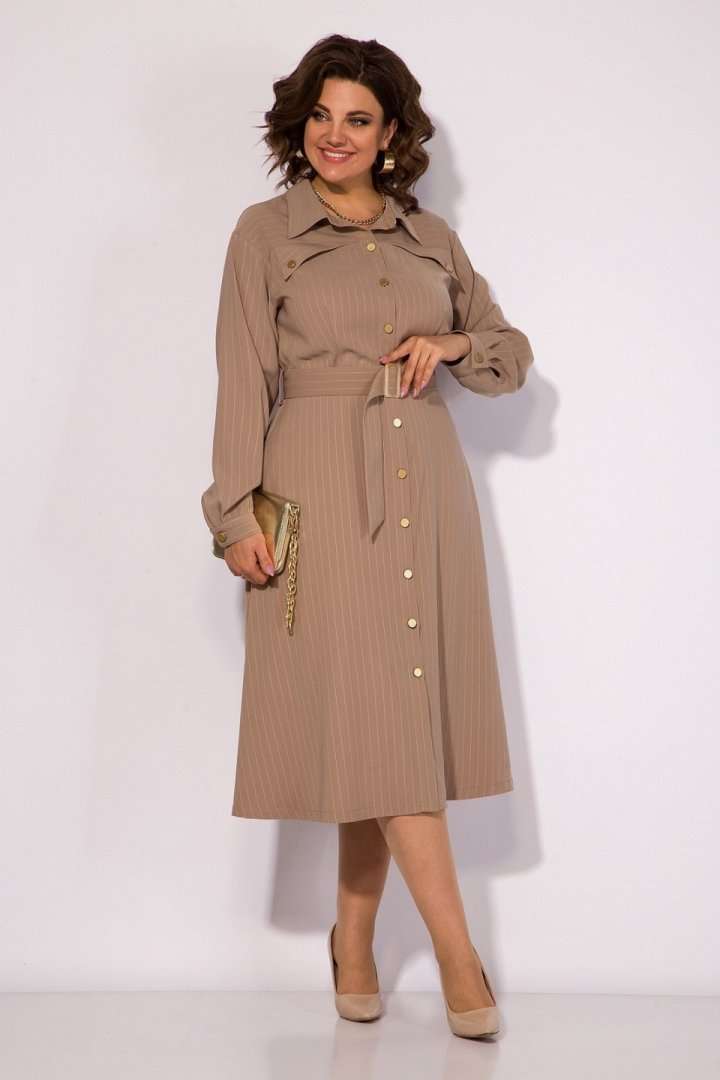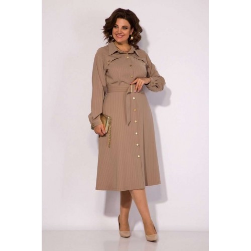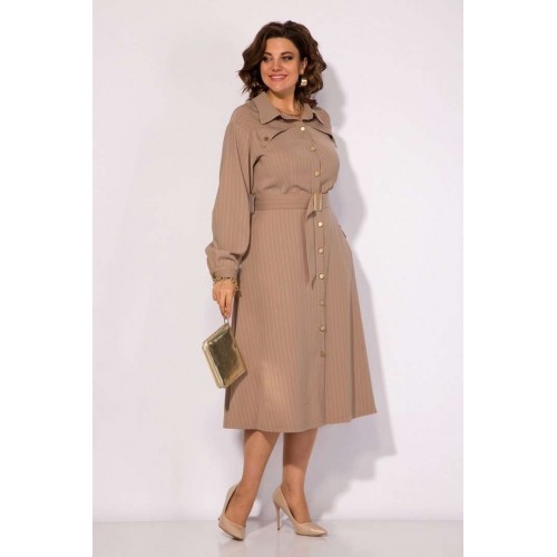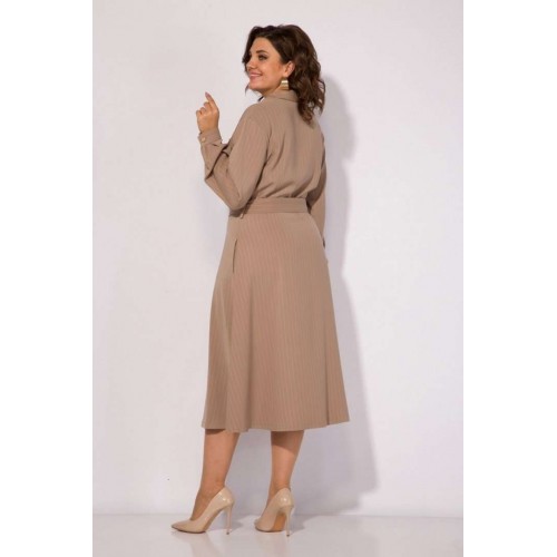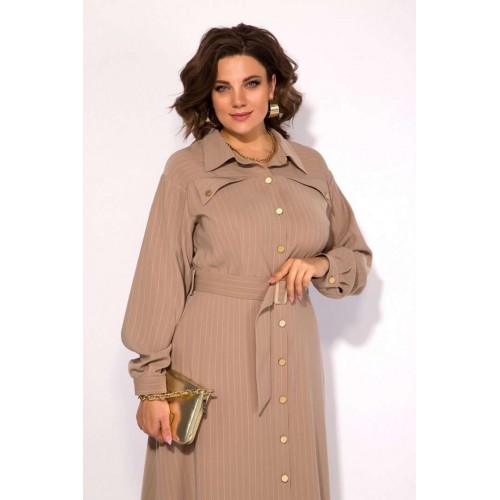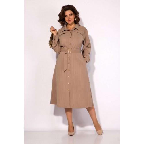 Эффектное платье в продольную полоску в элегантной расцветке хит этого сезона! Платье с центральной застежкой на цельнокроеной планке на петли и пуговицы. Воротник отложной, на стойке. Полочка на кокетке с декоративными клапанами. Платье по талии отрезное, с клешеной юбкой силуэта трапеция. В боковых швах предусмотрены карманы. Модель со спущенной линией плеча, с длинным рубашечным рукавом. Низ рукава оформлен манжетами с застежкой на петлю пуговицу. Спинка без особенностей. Широкий пояс-лента из основного материала выгодно подчёркивает линию талии. Образ можно дополнить актуальными ботфортами или классическими лодочками. Длина рукава – 62-63 см, платья – 112 см.