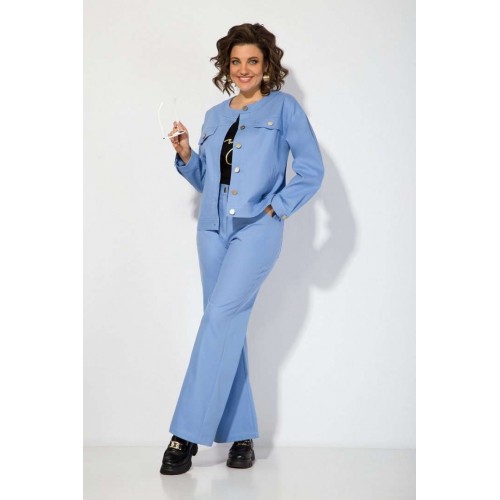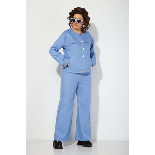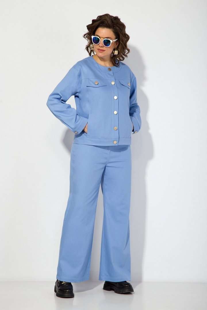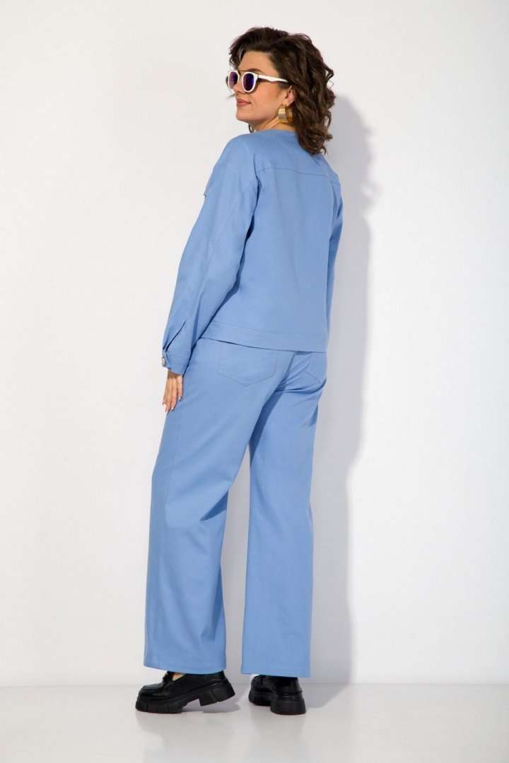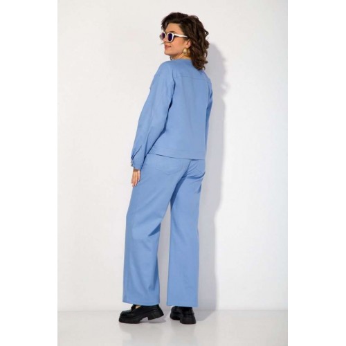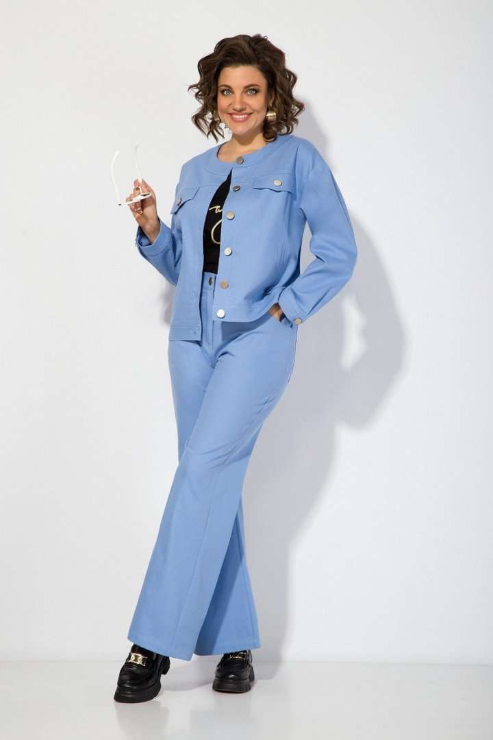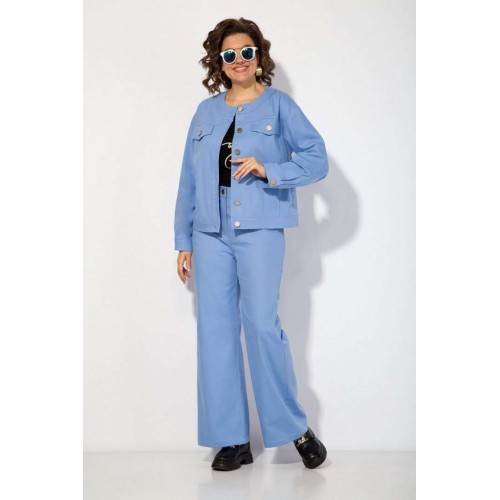 Эффектный комплект в стиле CASUAL, выполнен из хлопкового Джинса тифани! Модель состоит из облегченного жакета по типу джинсовки и брюк по типу брюк! Жакет свободного силуэта, с округлым вырезом горловины. Застежка центральная на петли и пуговицы. Плечевой пояс спущенный, рукав полной длины по низу предусмотрен манжет с застежкой. По полочке расположены продольные рельефы с карманами в шве. В комплект входят брюки по типу джинс, с завышенной посадкой. По переду расположены карманы. Застежка – брючная тесьма-молния с обработанным гульфиком. Брюки прямого кроя. Сзади расположены накладные карманы. Для более комфортного прилегания по спинке в пояс вставлена резинка. Отличный костюм для сезона весна-лето в размере плюс-сайз! Длина жакета – 60 см, рукав – 62 см. Брюки – 1014 см.