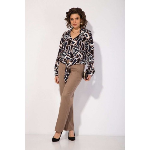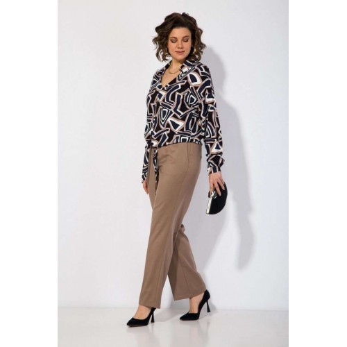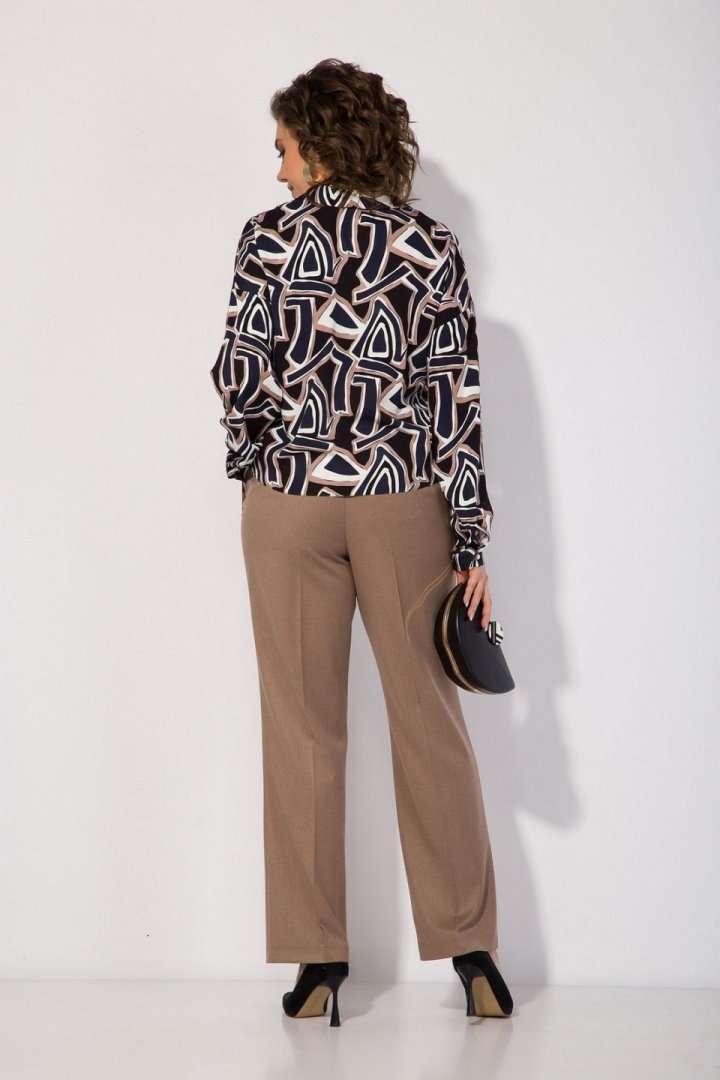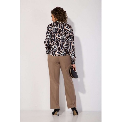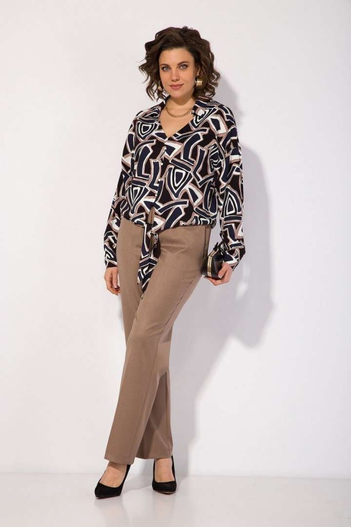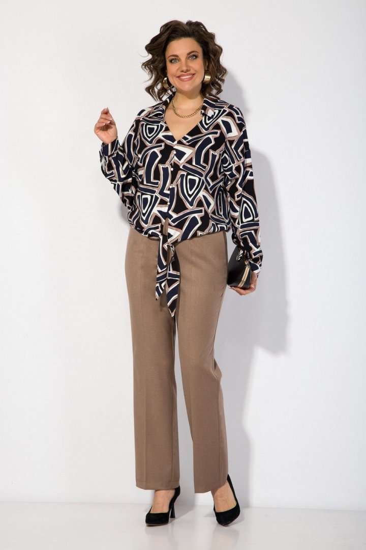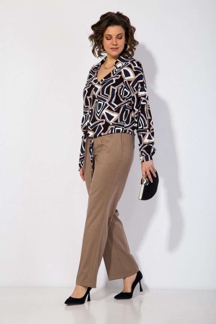 Блузка женская нарядная и для офиса идеальный выбор для женщин, ищущих комфорт и вечерний стиль в офисном образе! Модель с отложным воротником, переходящим в V-образный вырез горловины! По переду имитация застежки с навесными декоративными пуговками. Линия плеча спущена. Рукав полной длины, низ оформлен притачным манжетам с застежкой на пуговку. Изюминкой данной блузки является завязка по переду, которая драпирует линию живота и создает эффектный и неординарный образ! В комплекте классические женские брюки, со средней посадкой, прямого покроя от бедра. Застежка – брючная тесьма-молния с обработанным гульфиком. Карманы боковые. Пояс притачной, в боковых участках вставлена резинка на свободу. По переду заутюжены канты. Спинка с Талиевыми выточками. Подгибка брюк –– 4 см. Длина по спинке – 60 см, рукав – 62 см . Брюки – 104 см.