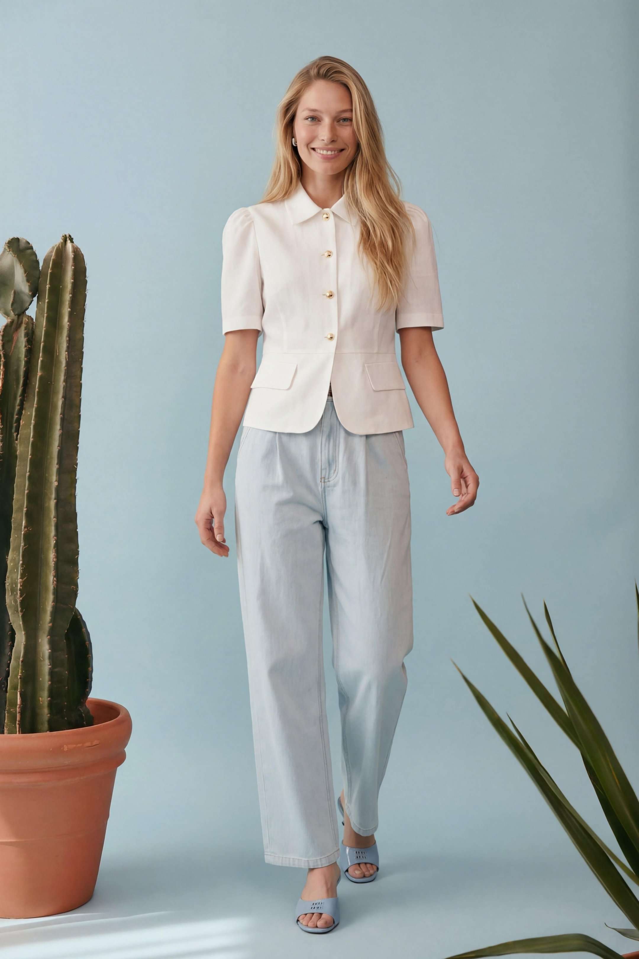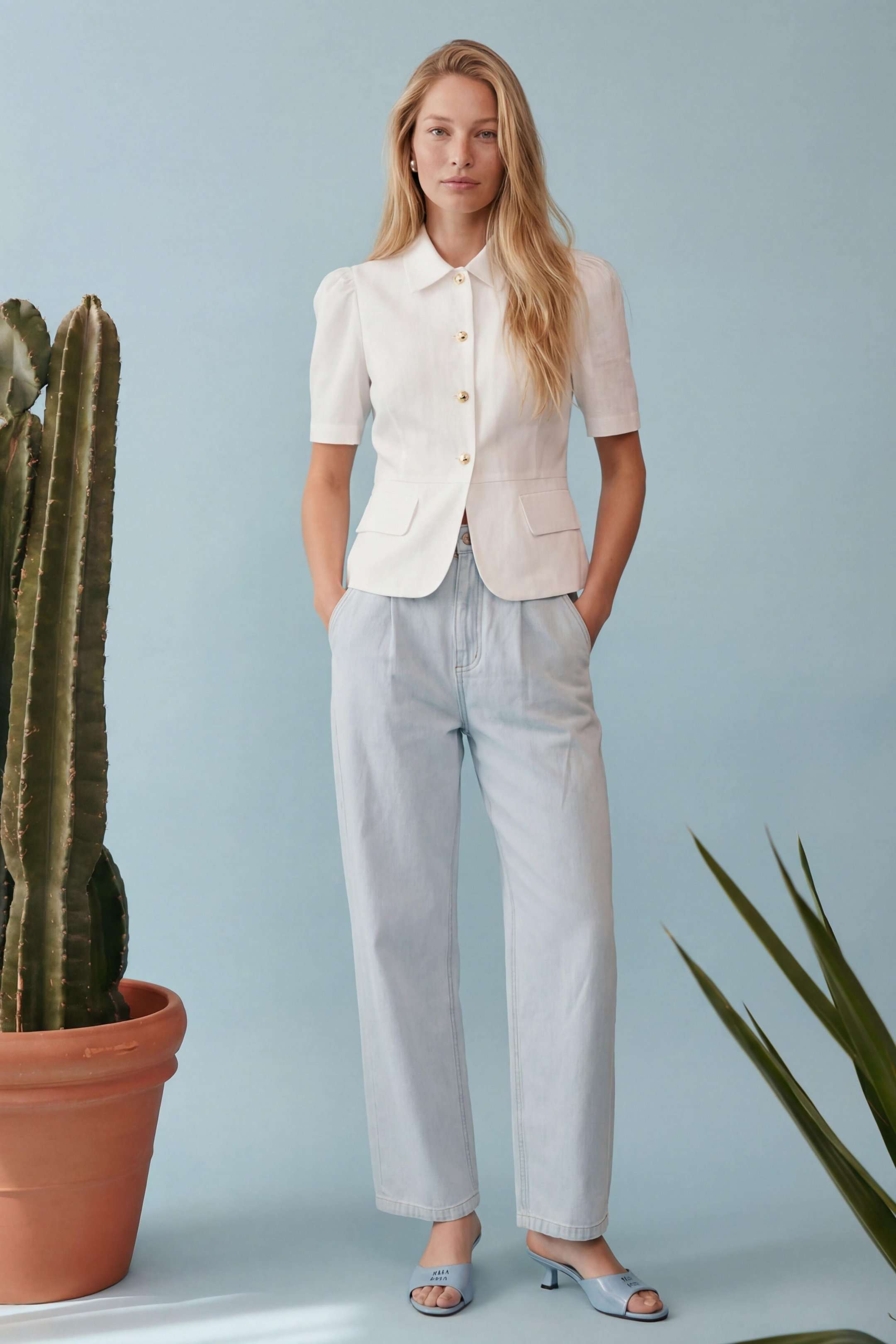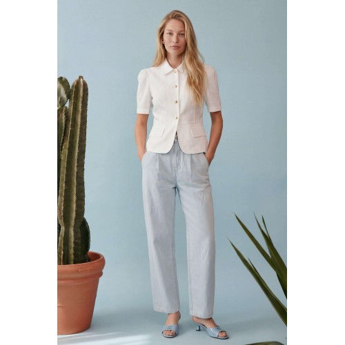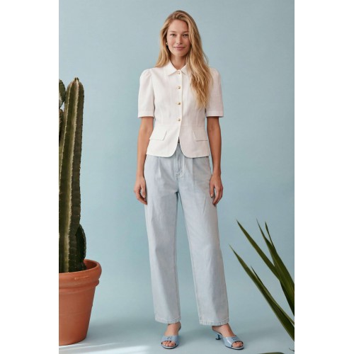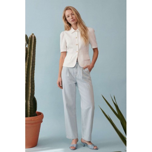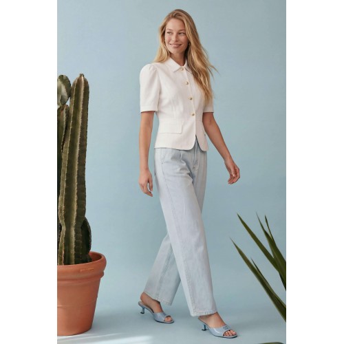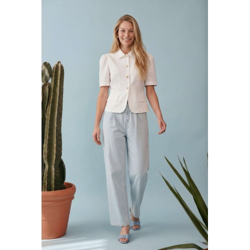 Элегантный полуприлегающий жакет, в котором сочетаются мягкость линий и четкая архитектура силуэта. Модель подчеркивает талию и формирует женственный, собранный образ с легким ретро-настроением. Жакет выполнен из льняной ткани, без подкладки. Рукав короткий со сборкой по окату. Классический рубашечный воротник на стойке, застёжка центральная на петли и пуговицы. По переду вертикальные рельефы, линия талии отрезная с притачной баской, которая мягко раскрывается книзу, создавая баланс между структурой и легкостью. По баске декоративные клапаны по бокам. По спинке: средний шов, рельефы и баска. Жакет легко комбинируется с брюками в тон, формируя современный костюм с утонченной эстетикой. Жакет: Длина по среднему шву спинки от основания горловины: 58 см ОГ: 86-90-94-98-102 см (размер 42-44-46-48-50) ОБ: 97-101-105-110-114 см (размер 42-44-46-48-50) ОТ: 80-84-88-92-96 см (размер 42-44-46-48-50) Обхват плеча: 36-38-40-42-44 см Длина рукава: 30 см