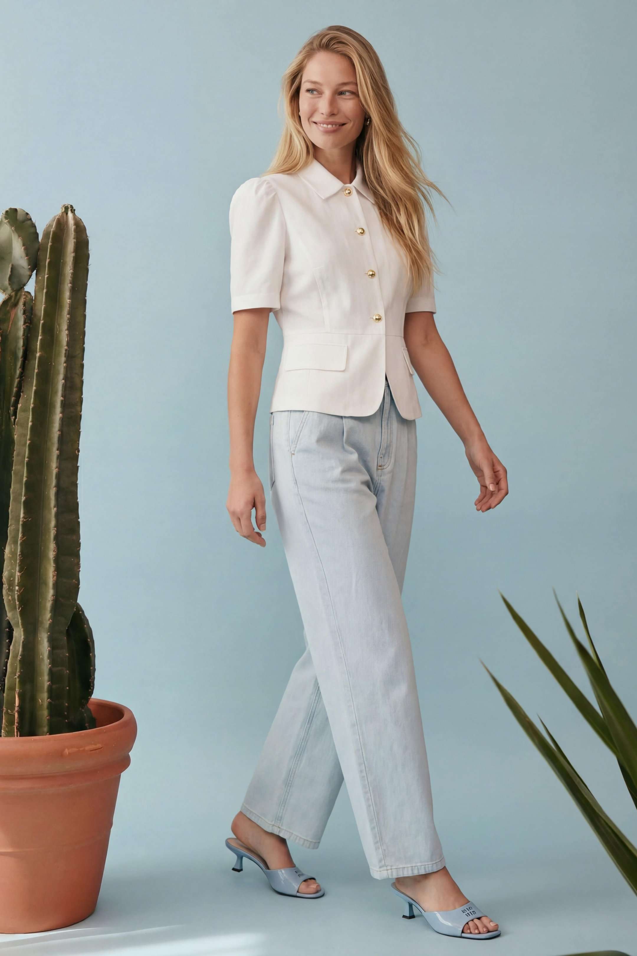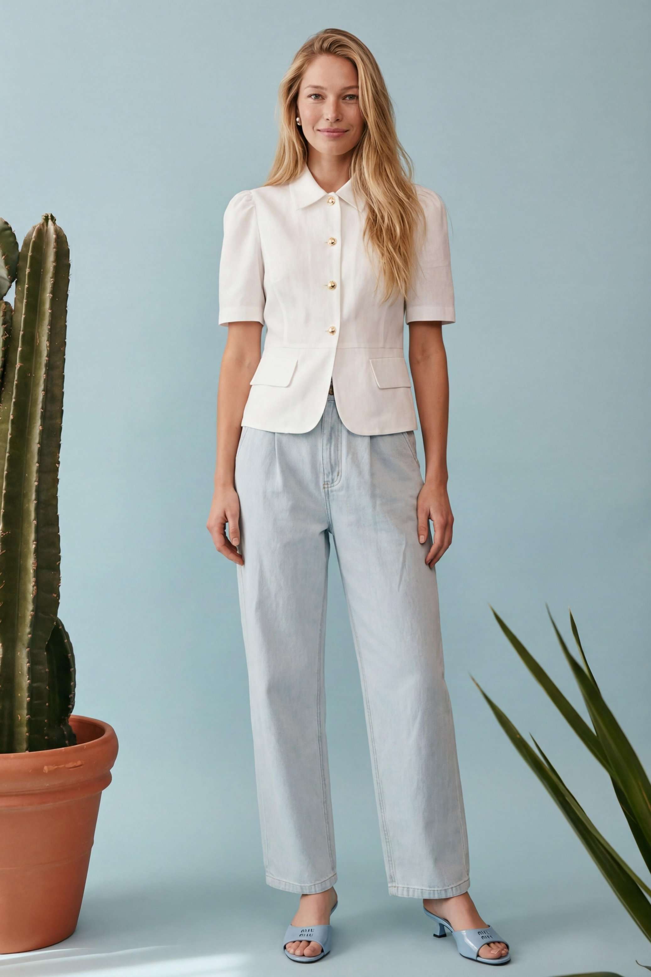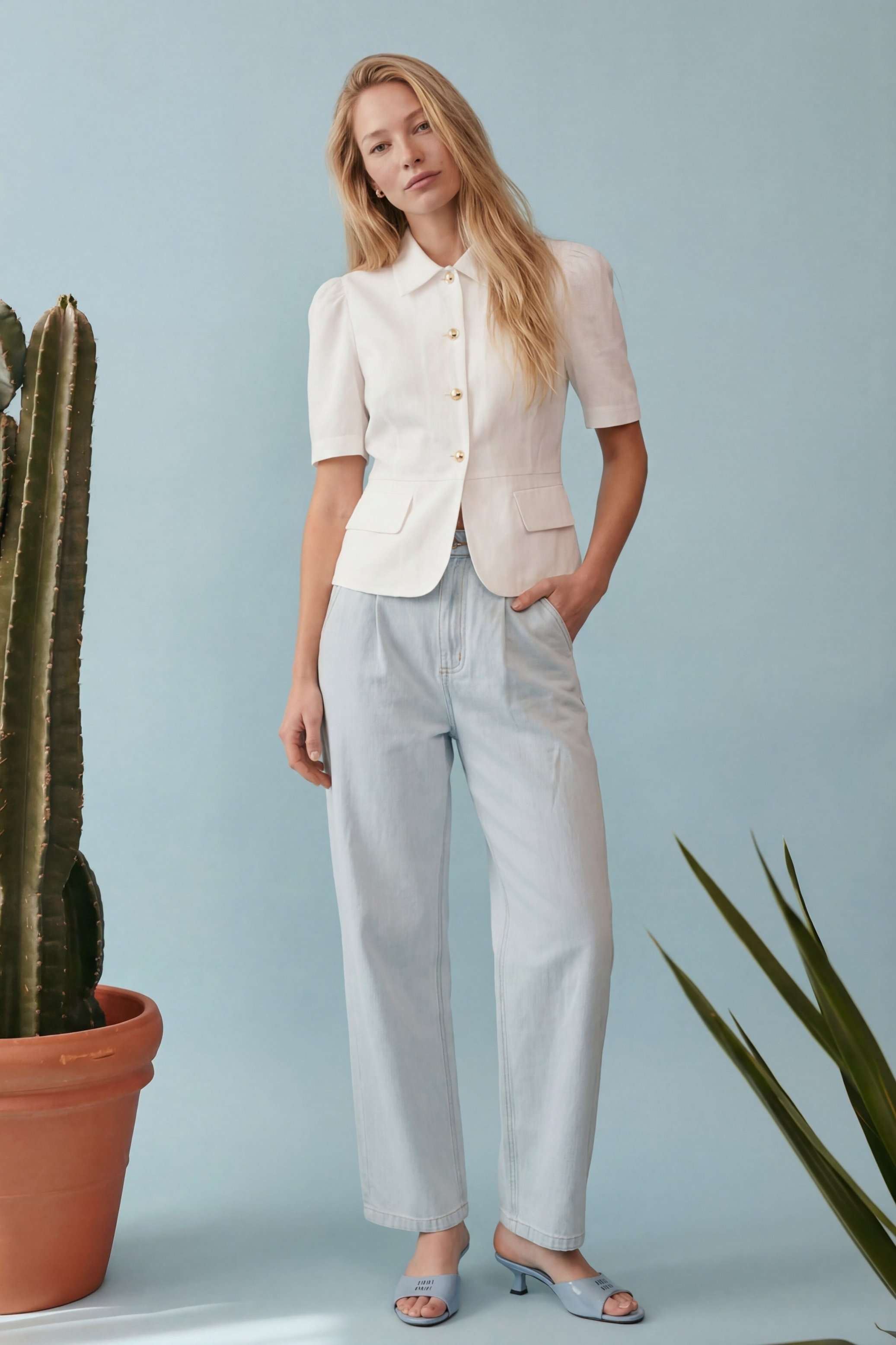 Элегантный полуприлегающий жакет, в котором сочетаются мягкость линий и четкая архитектура силуэта. Модель подчеркивает талию и формирует женственный, собранный образ с легким ретро-настроением. Жакет выполнен из льняной ткани, без подкладки. Рукав короткий со сборкой по окату. Классический рубашечный воротник на стойке, застёжка центральная на петли и пуговицы. По переду вертикальные рельефы, линия талии отрезная с притачной баской, которая мягко раскрывается книзу, создавая баланс между структурой и легкостью. По баске декоративные клапаны по бокам. По спинке: средний шов, рельефы и баска. Жакет легко комбинируется с брюками в тон, формируя современный костюм с утонченной эстетикой. Жакет: Длина по среднему шву спинки от основания горловины: 58 см ОГ: 86-90-94-98-102 см (размер 42-44-46-48-50) ОБ: 97-101-105-110-114 см (размер 42-44-46-48-50) ОТ: 80-84-88-92-96 см (размер 42-44-46-48-50) Обхват плеча: 36-38-40-42-44 см Длина рукава: 30 см