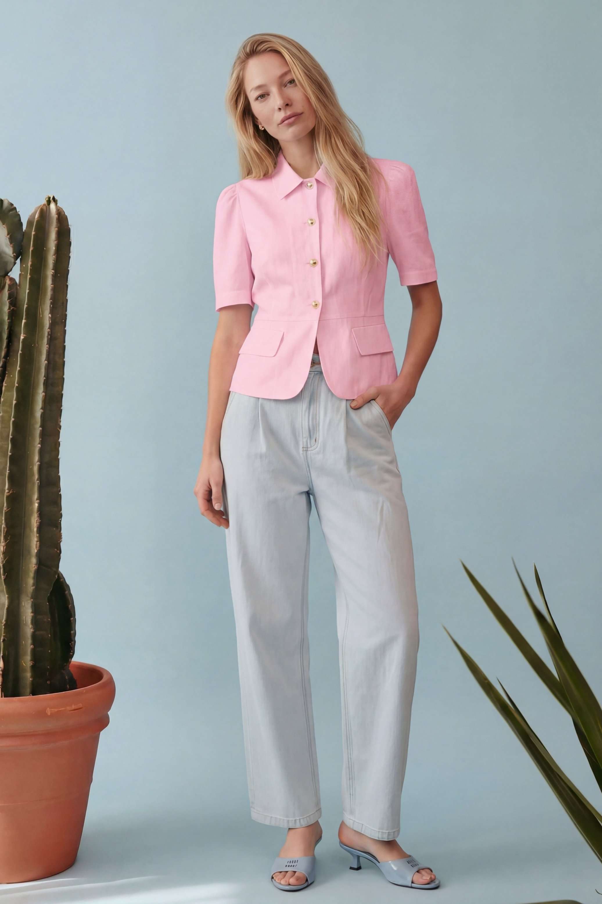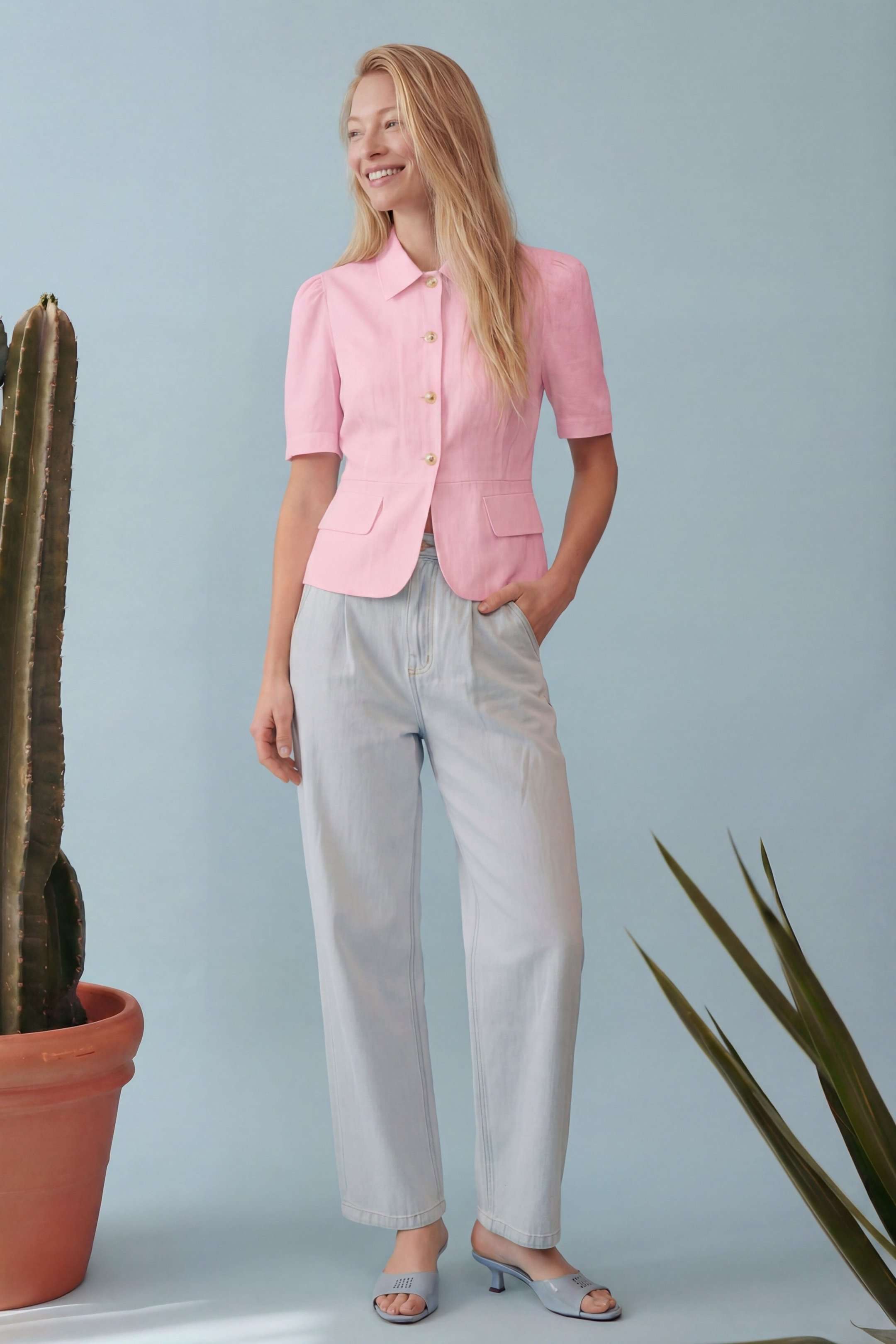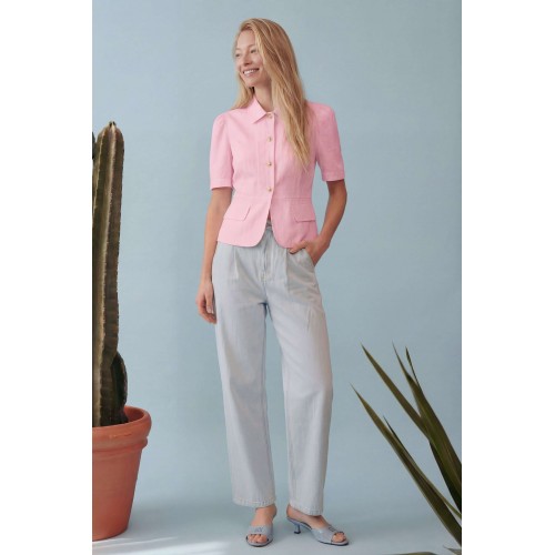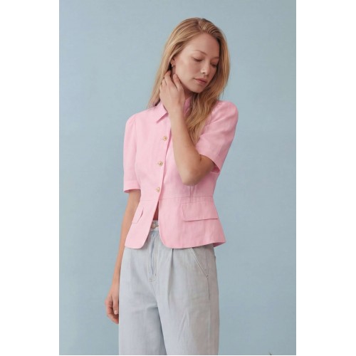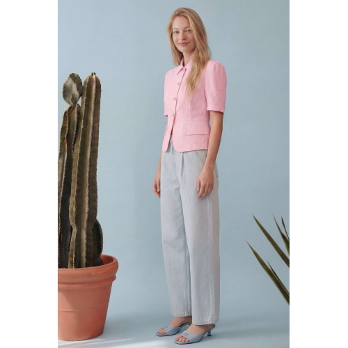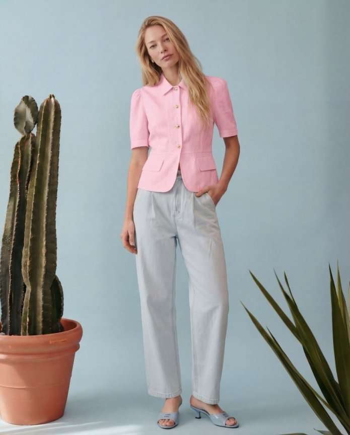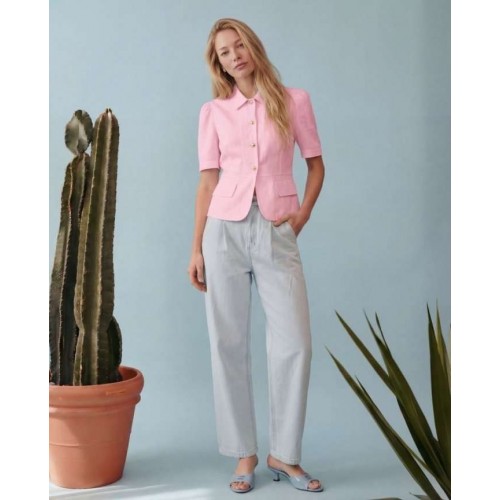 Элегантный полуприлегающий жакет, в котором сочетаются мягкость линий и четкая архитектура силуэта. Модель подчеркивает талию и формирует женственный, собранный образ с легким ретро-настроением. Жакет выполнен из льняной ткани, без подкладки. Рукав короткий со сборкой по окату. Классический рубашечный воротник на стойке, застёжка центральная на петли и пуговицы. По переду вертикальные рельефы, линия талии отрезная с притачной баской, которая мягко раскрывается книзу, создавая баланс между структурой и легкостью. По баске декоративные клапаны по бокам. По спинке: средний шов, рельефы и баска. Длина по среднему шву спинки от основания горловины: 58 см ОГ: 86-90-94-98-102 см (размер 42-44-46-48-50) ОБ: 97-101-105-110-114 см (размер 42-44-46-48-50) ОТ: 80-84-88-92-96 см (размер 42-44-46-48-50) Обхват плеча: 36-38-40-42-44 см Длина рукава: 30 см