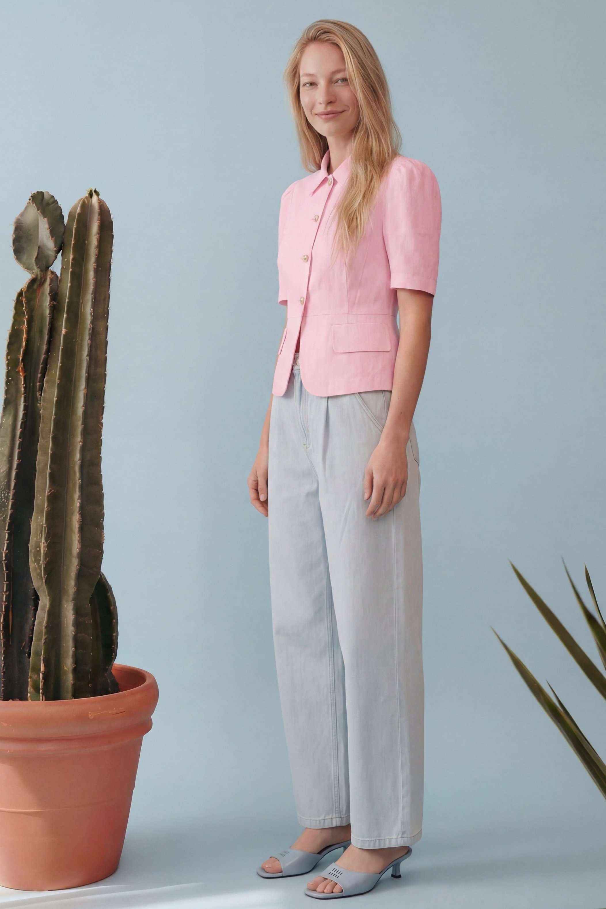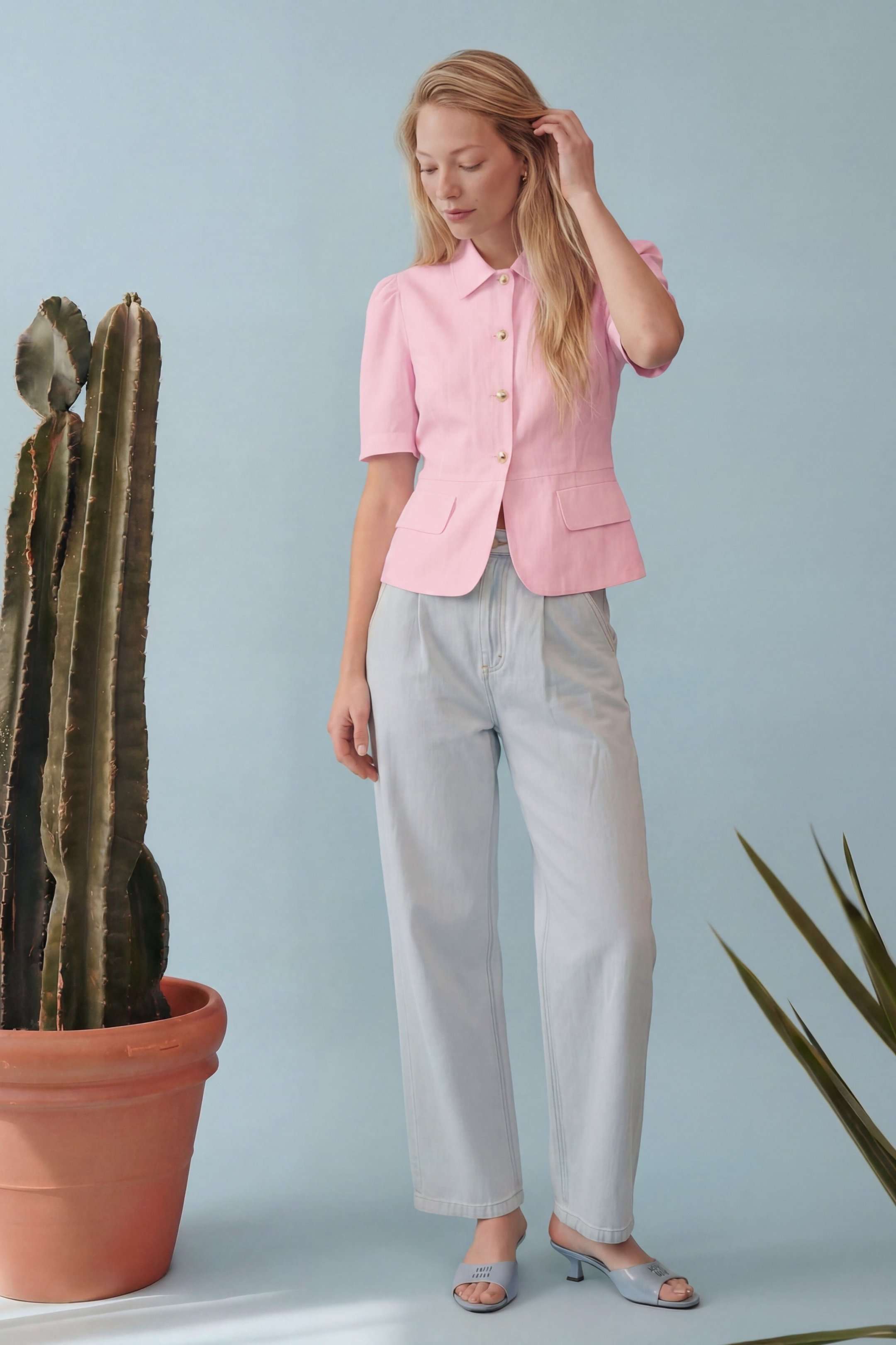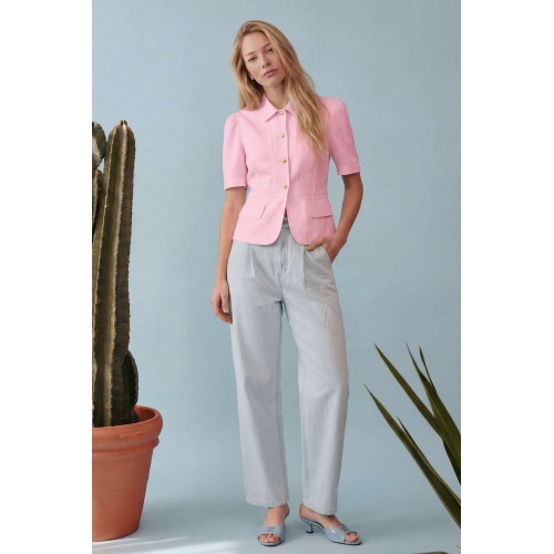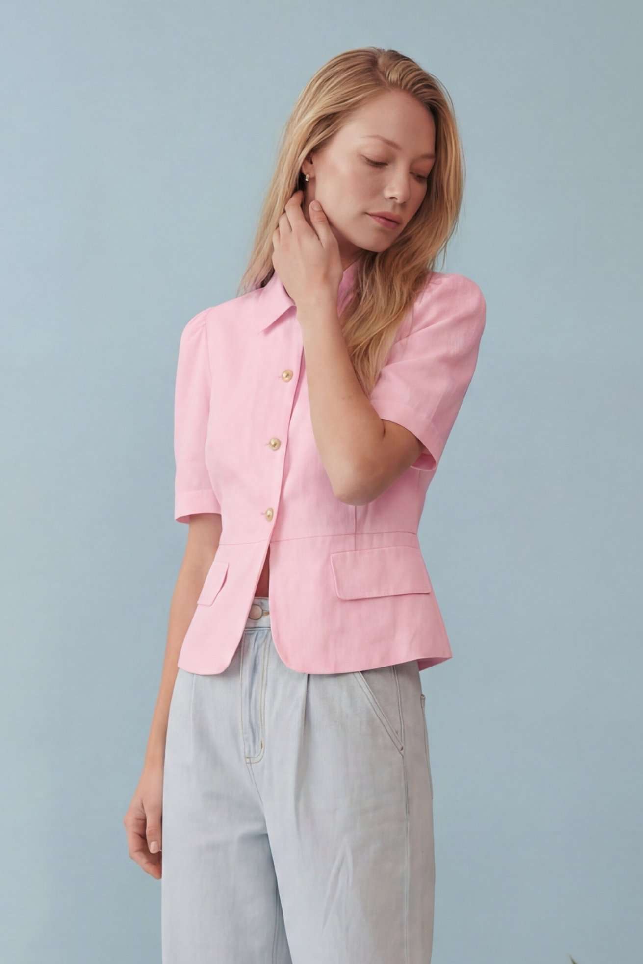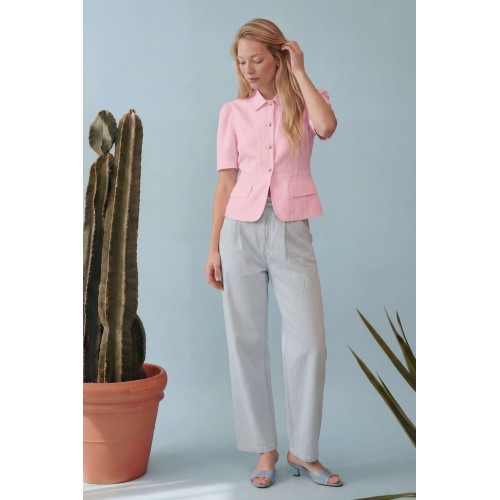 Элегантный полуприлегающий жакет, в котором сочетаются мягкость линий и четкая архитектура силуэта. Модель подчеркивает талию и формирует женственный, собранный образ с легким ретро-настроением. Жакет выполнен из льняной ткани, без подкладки. Рукав короткий со сборкой по окату. Классический рубашечный воротник на стойке, застёжка центральная на петли и пуговицы. По переду вертикальные рельефы, линия талии отрезная с притачной баской, которая мягко раскрывается книзу, создавая баланс между структурой и легкостью. По баске декоративные клапаны по бокам. По спинке: средний шов, рельефы и баска. Длина по среднему шву спинки от основания горловины: 58 см ОГ: 86-90-94-98-102 см (размер 42-44-46-48-50) ОБ: 97-101-105-110-114 см (размер 42-44-46-48-50) ОТ: 80-84-88-92-96 см (размер 42-44-46-48-50) Обхват плеча: 36-38-40-42-44 см Длина рукава: 30 см