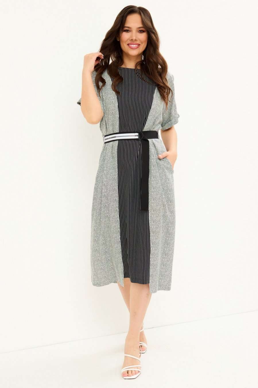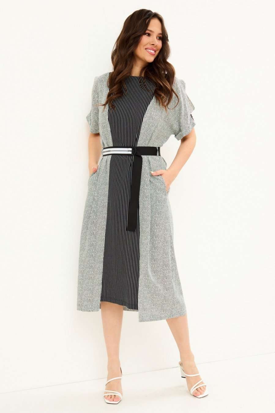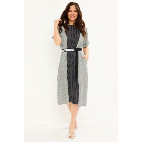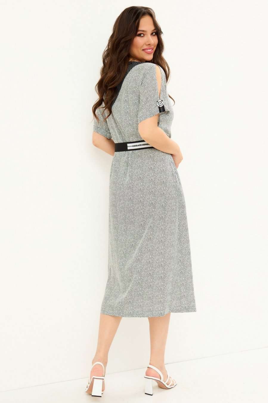 Стильное платье прямого силуэта, с цельнокроеными рукавом, дополненным пришивной патой с пуговицей. Платье приталено за счет съемного пояса (в комплекте). По спинке застежка на петлю-пуговицу. Длина платья от плечевого шва 122 см. Длина рукава 26 см