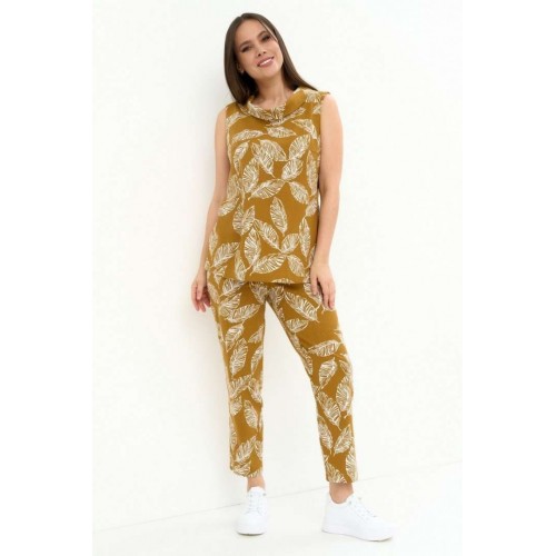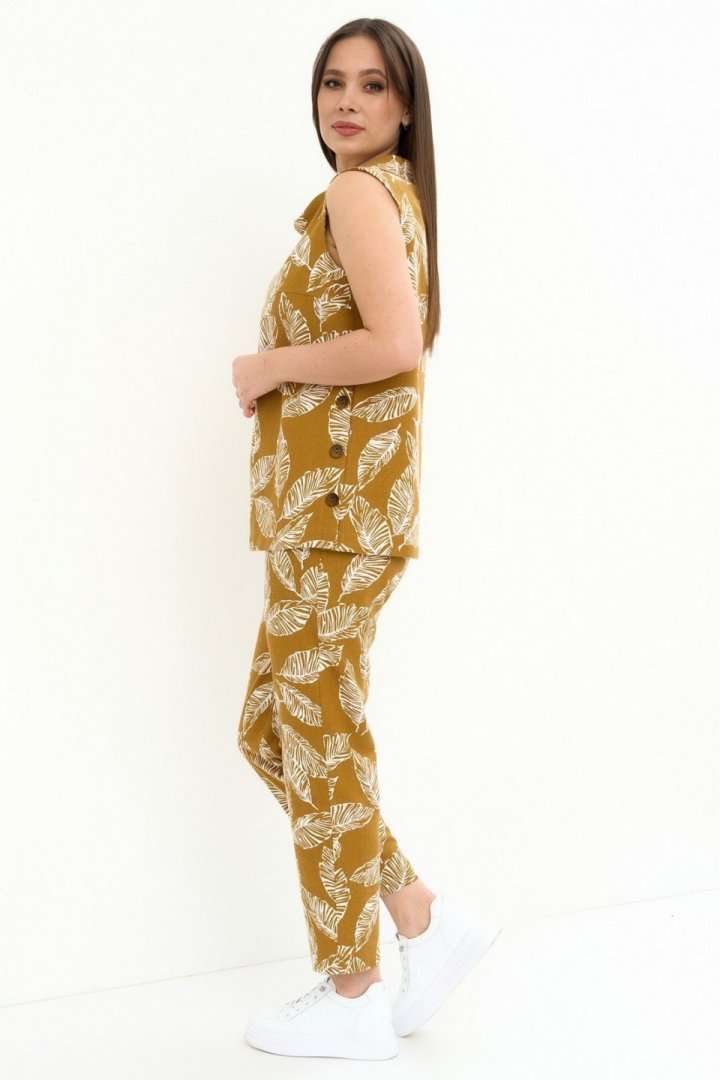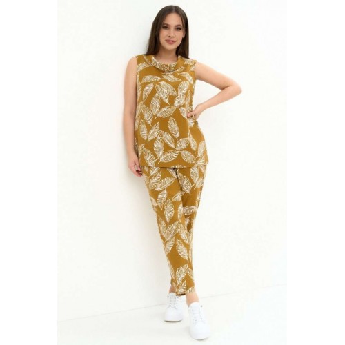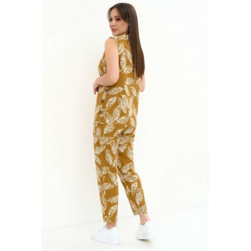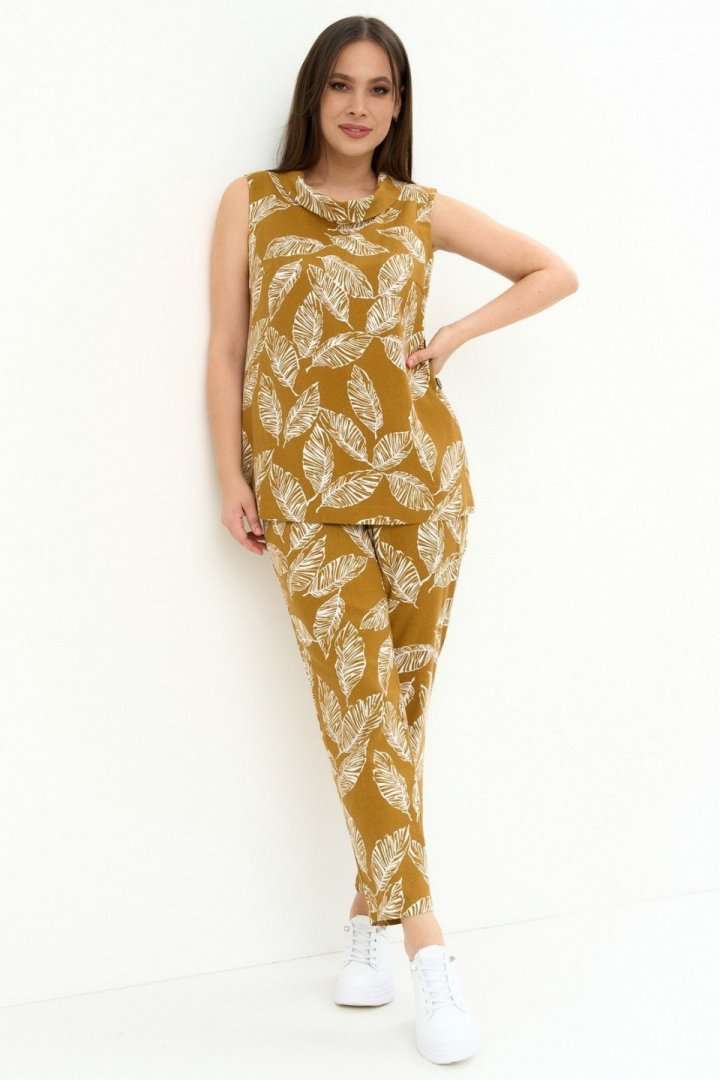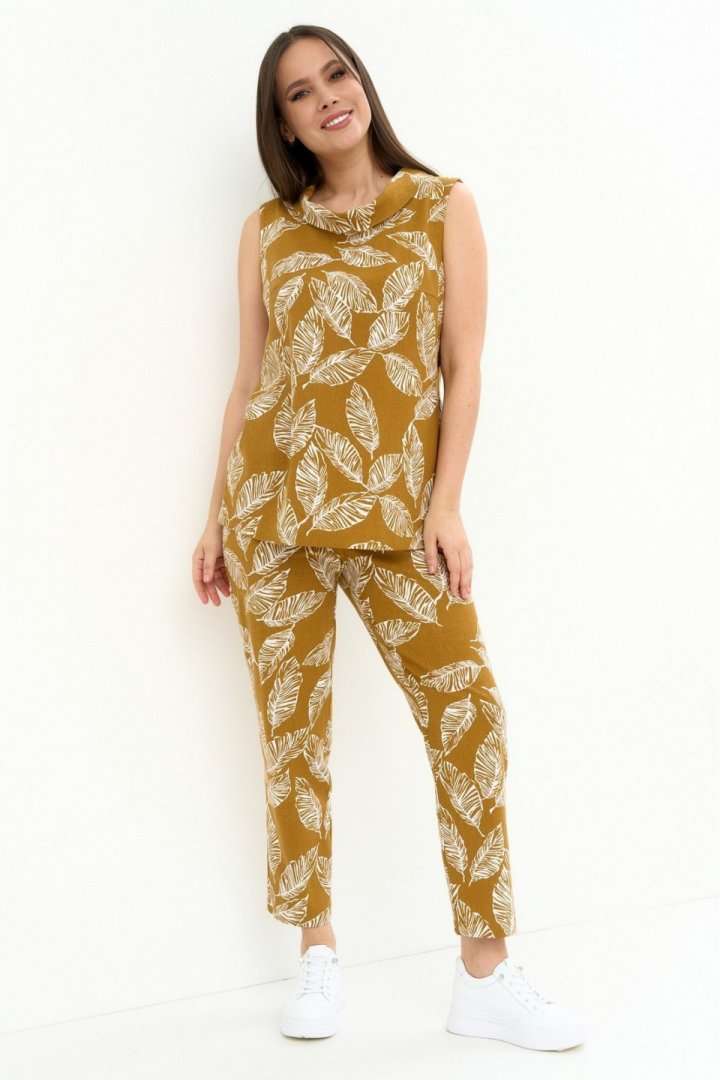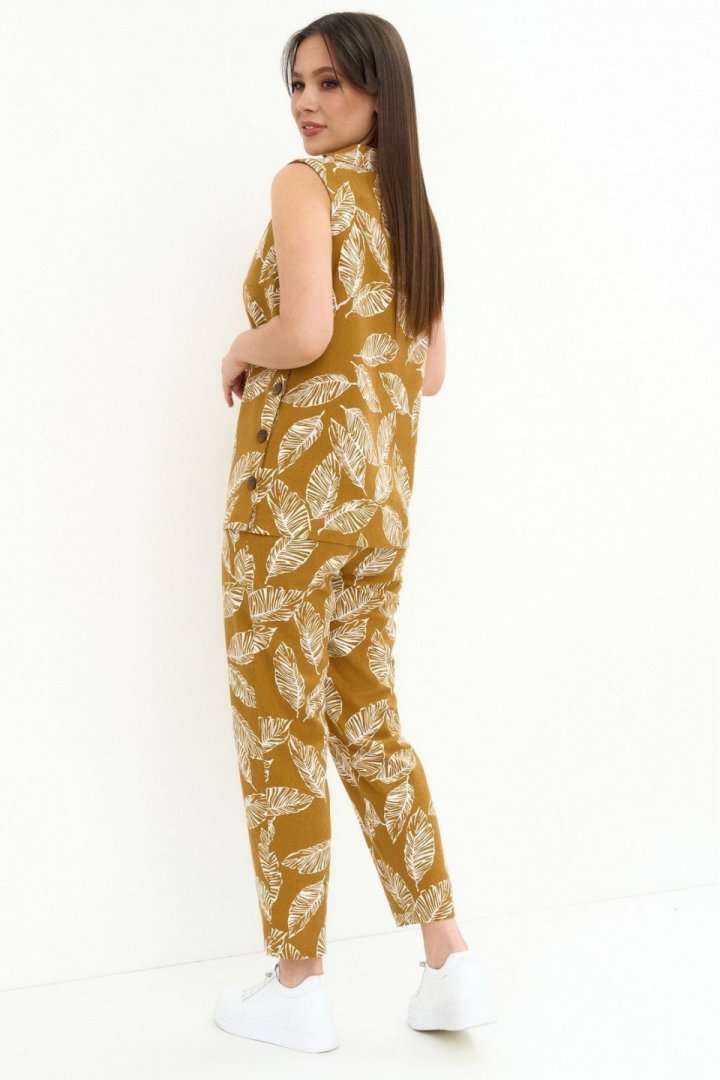 Легкий комфортный комплект из натуральной ткани, состоящий из блузы и брюк. Блуза свободного прямого кроя, без рукава и без застежки. Горловина обработана стойкой с отворотом. По левой стороне планка с пуговицами и петлями. Брюки прямого классического кроя, слегка заужены книзу, с притачным поясом, дополненным эластичной тесьмой. Посадка средняя. Застежка на молнию и пришивную пуговицу. Дополнены боковыми карманами. Длина блузы от плечевого шва 70см. Длина брюк по боковому шву 95см.