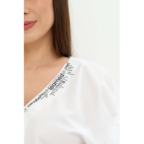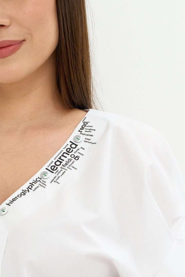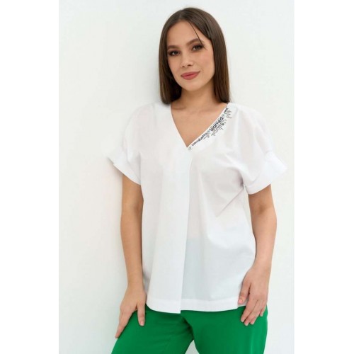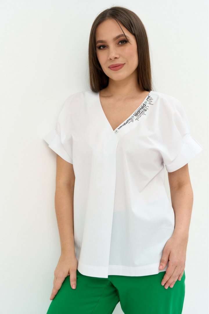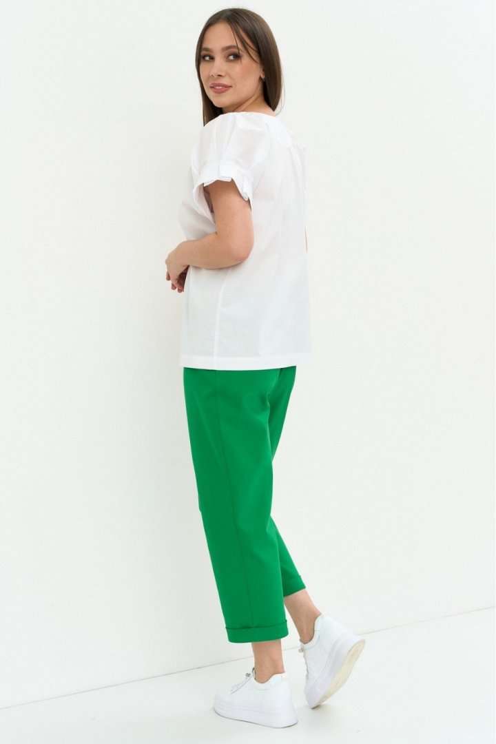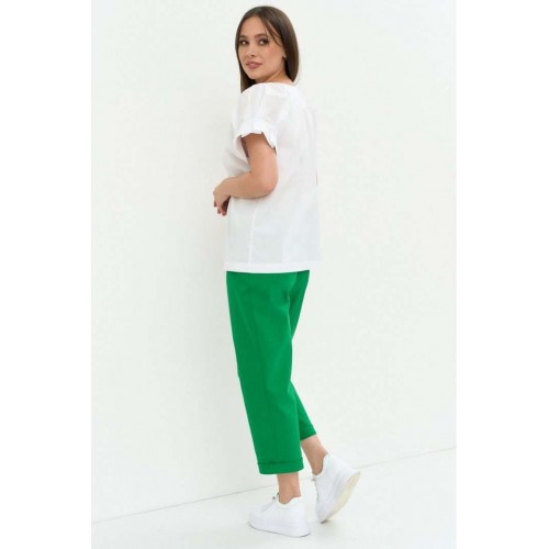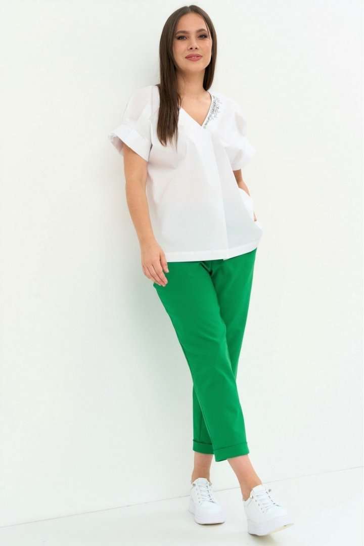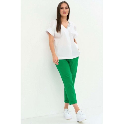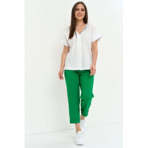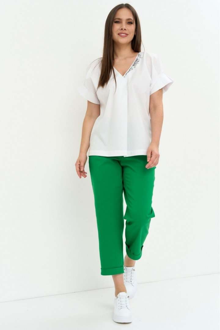 Стильный легкий комплект из блузы и брюк. Легкая хлопковая блуза свободного кроя. Горловина V-образная, дополнена термо аппликацией. Рукав цельнокроеный. Для придания объема дополнен декоративными защипами. Брюки прямого кроя, слегка заужены к низу. Дополнены боковыми карманами. Пояс притачной, дополнен эластичной тесьмой. Брюки с застежкой на молнию и пришивную пуговицу. Длина блузы от плечевого шва 67см.