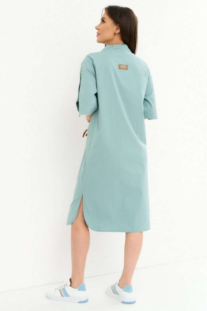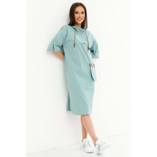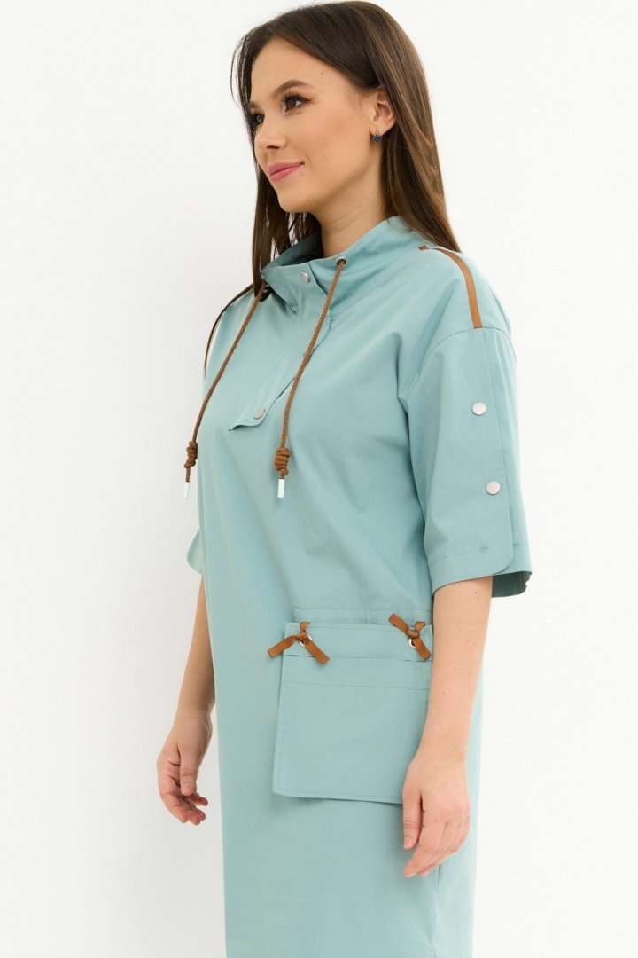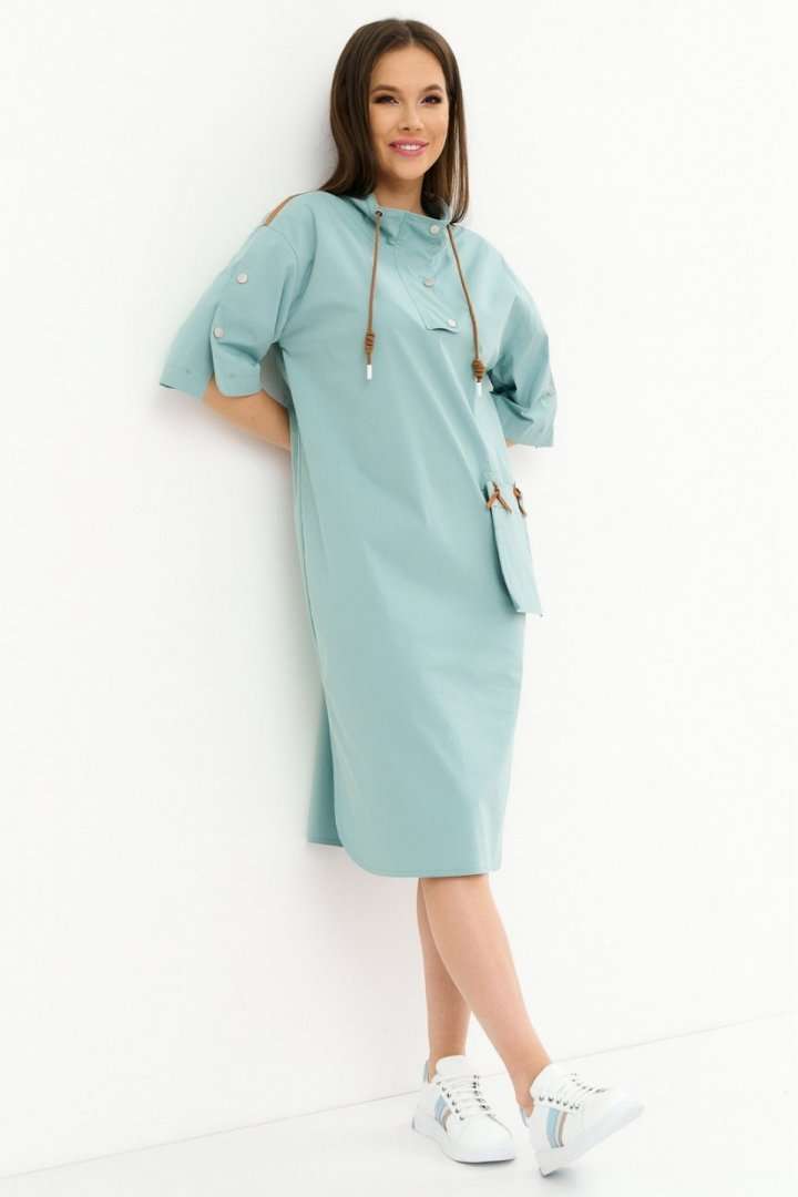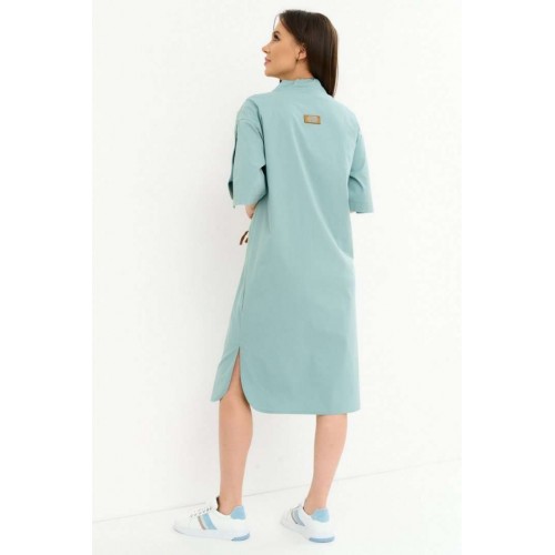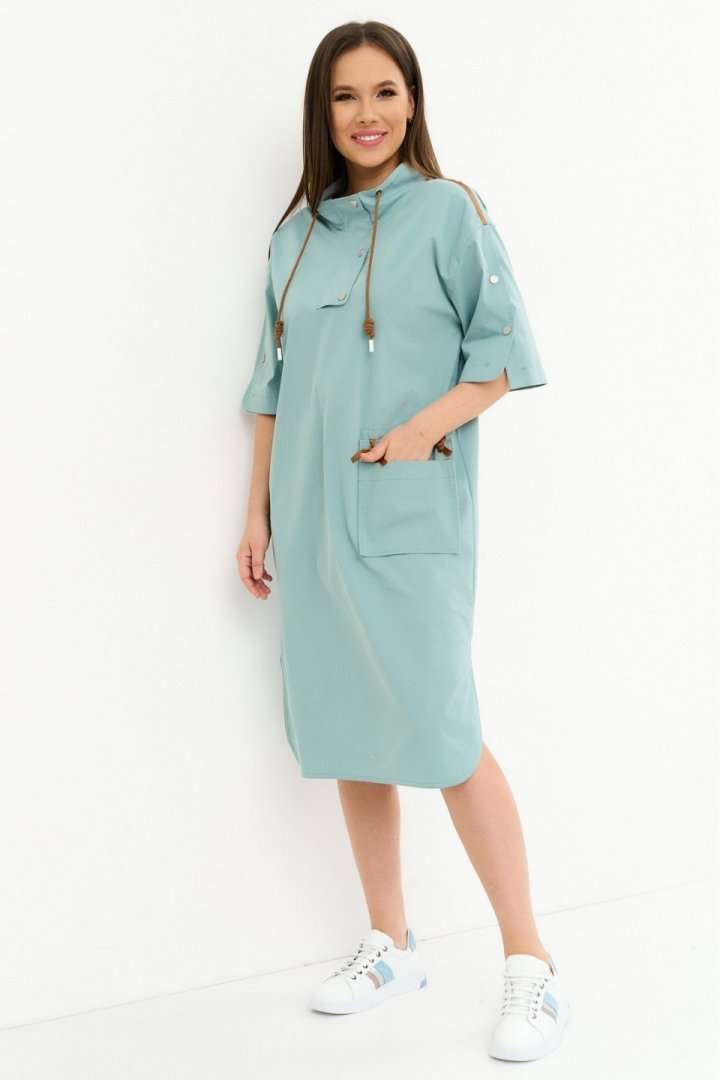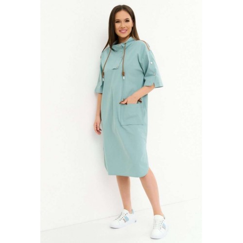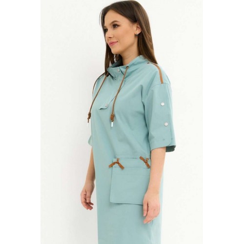 Стильное платье свободного кроя со спущенным рукавом. Дополнено воротником -стойкой со шнурком. Застежка по переду на металлические кнопки. Так же рукав дополнен декоративными аналогичными кнопками. Так же платье дополнено оригинальным элементом в виде функционального съемного кармана . Длина платья от плечевого шва110см. Длина рукава 35см.