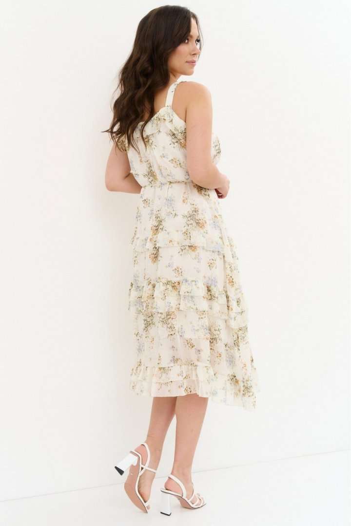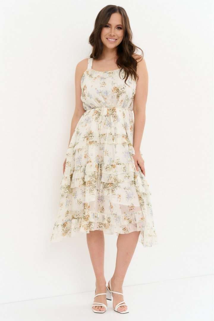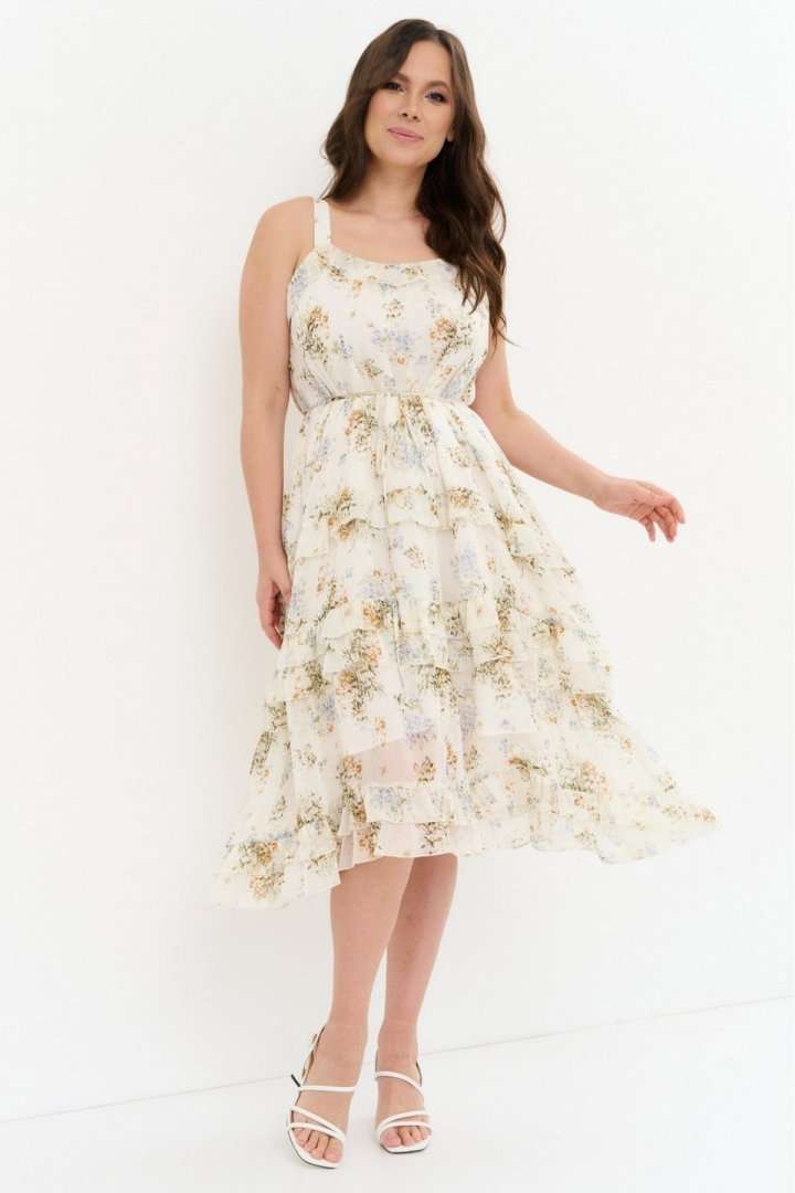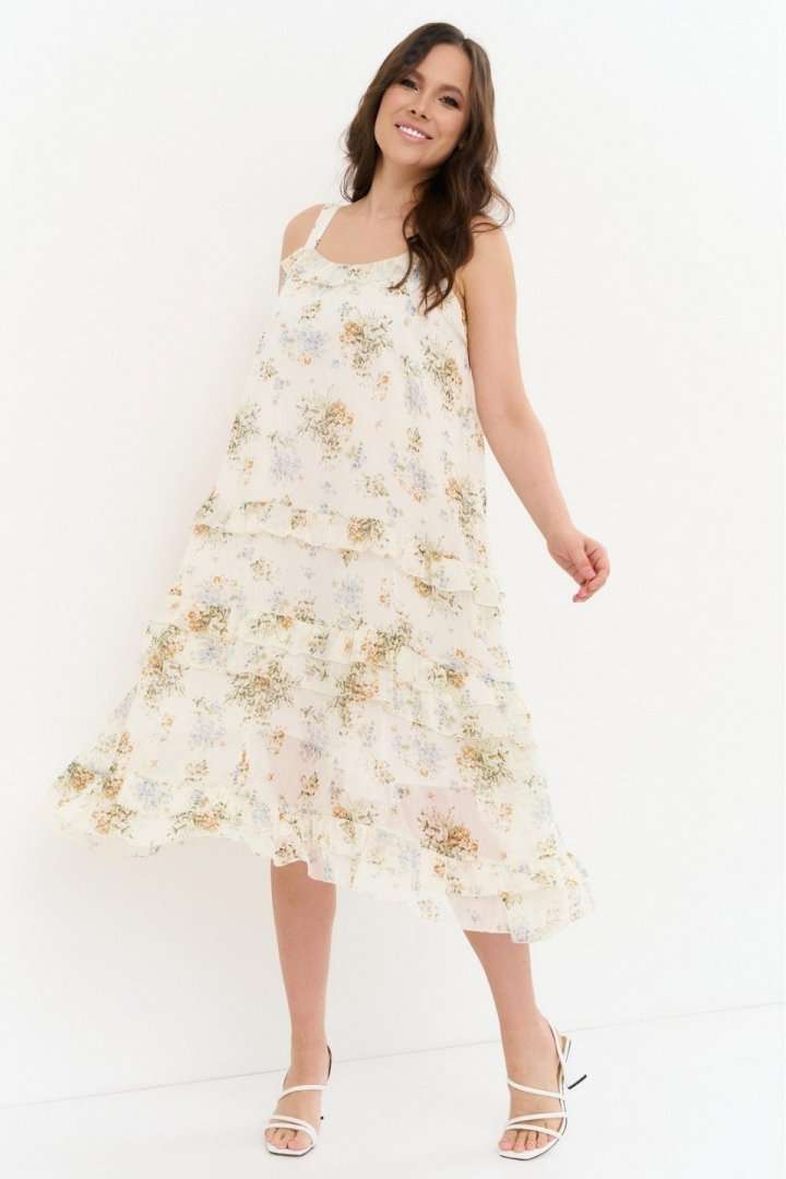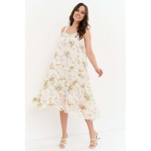 Легкий шифоновый сарафан свободного кроя, А-образного силуэта, на подкладке. Приталено за счет тонкого пояса, выполненного из основной ткани. По боковым швам платье длиннее Длина платья от плечевого шва включая бретели по боковому шву 107см , по переду и спинке короче на 7 см. Длина бретели от плечевого шва 12см.