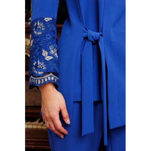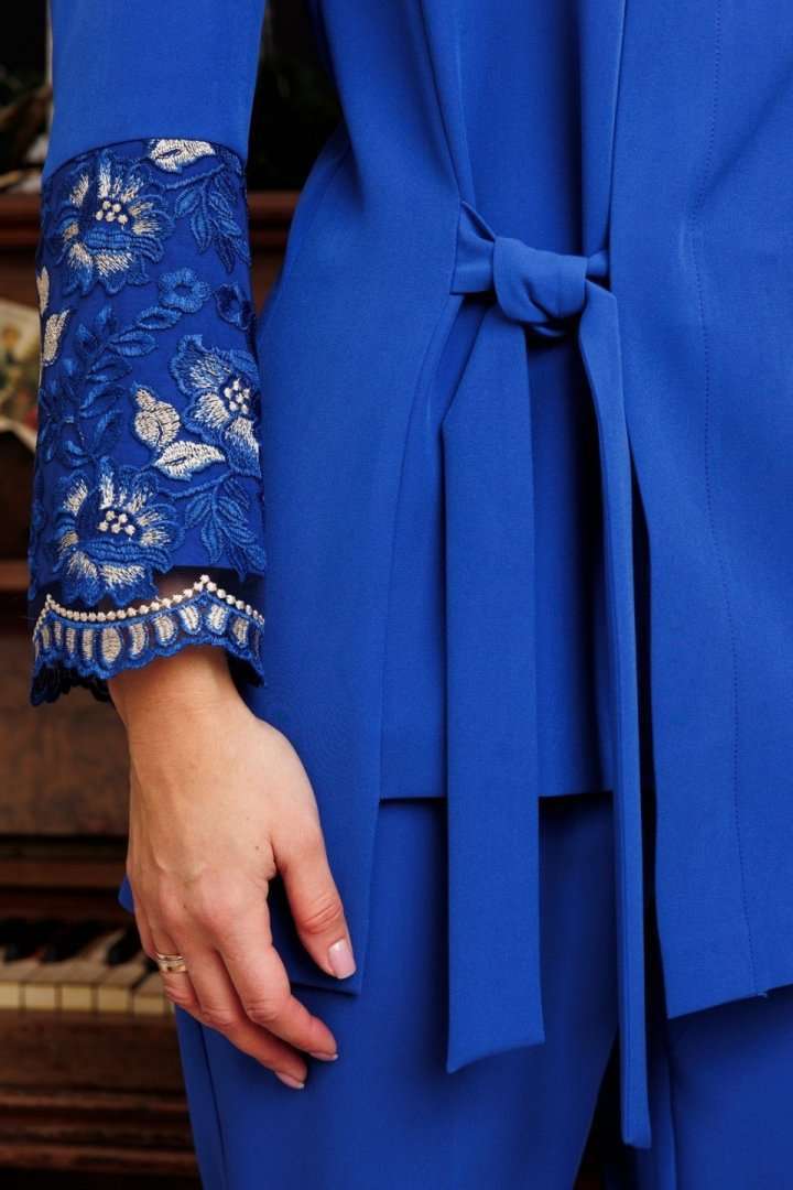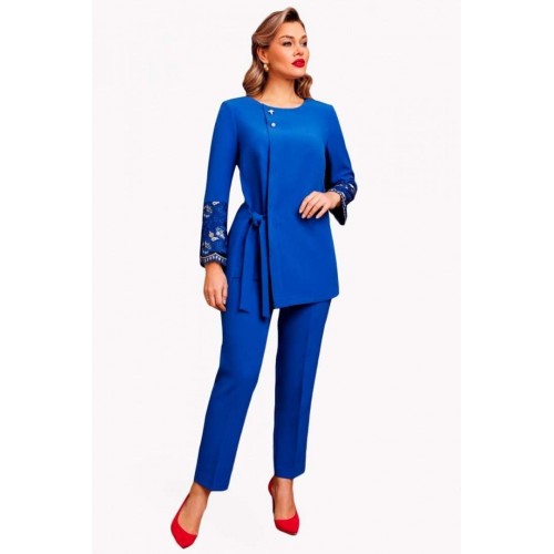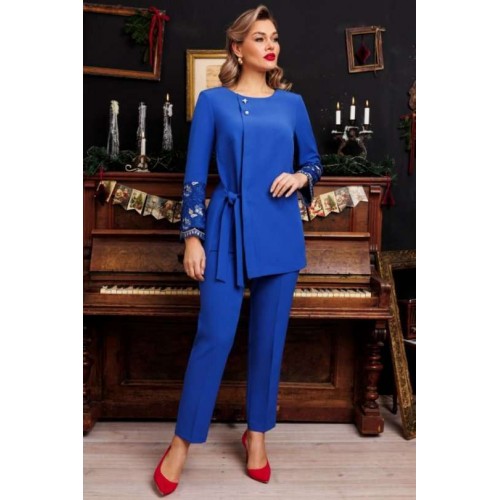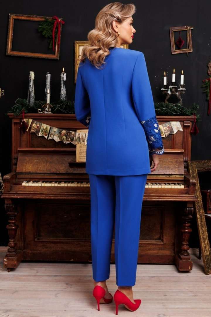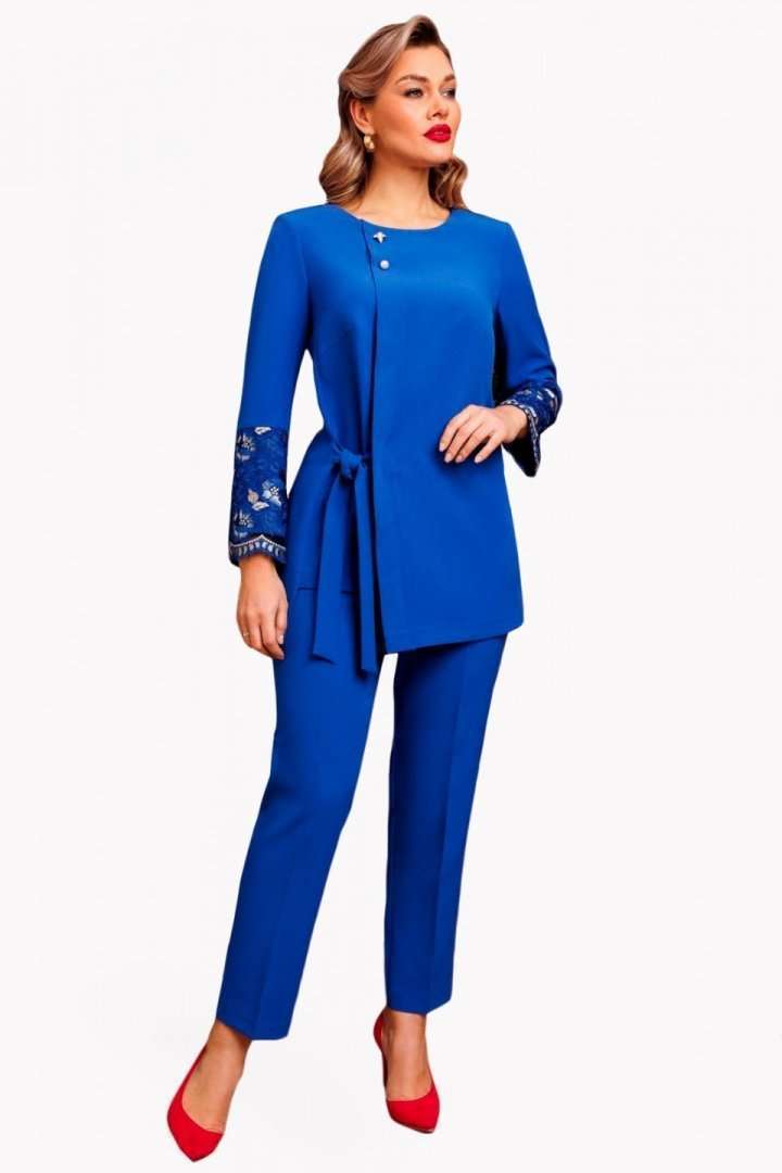 Костюм женский двухпредметный, состоящий из блузона и брюк. Блузон полуприталенного силуэта выполнен, как и брюки, из текстильного полотна со стрейчем, длиной ниже бедер. По спинке блузона - талиевые вытачки и средний шов. По переду - нагрудные вытачки и цельнокроенная планка, смещенная в правую сторону, с притачными завязками ниже линии талии. Круглый вырез горловины. Рукав двухшовный втачной, длинный, нижняя часть которого отрезная, с двухслойной широкой манжетой, верхняя часть выполнена из кружева. Брюки слегка заужены к низу, на притачном поясе.