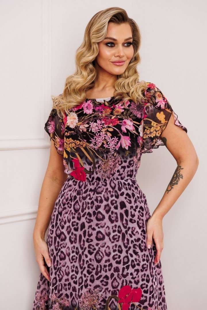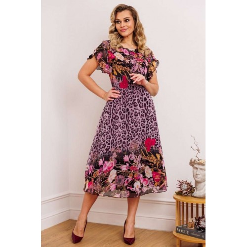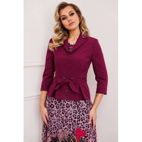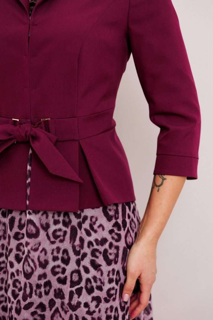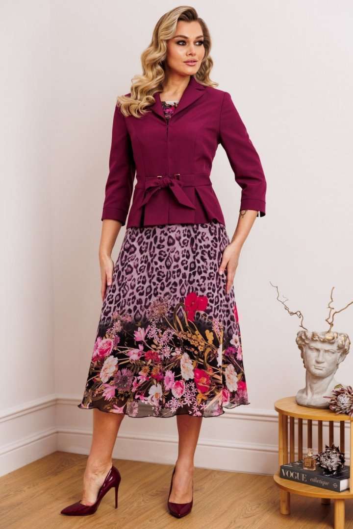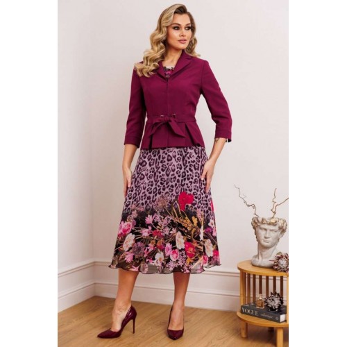 Женственный комплект с ультрамодными принтами. Состоит из жакета и платья. Жакет приталенного силуэта с застежкой встык на декоративные крючки. Воротник пиджачного типа. По переду вертикальные рельефы из проймы. В области талии отрезная планка, переходящая в пояс-завязку через декоративные рамки. По низу переда и спинки фигурная баска со складками. Рукава втачные двухшовные, с манжетой по низу из отделочного материала. Платье приталенное, отрезное по линии талии. Юбка расширенная к низу. Лиф с нагрудными вытачками. Горловина круглой формы. Рукав короткий, втачной. Длина жакета: 63 см длина рукава жакета: 48 см длина платья: 117 см длина рукава платья: 22 см