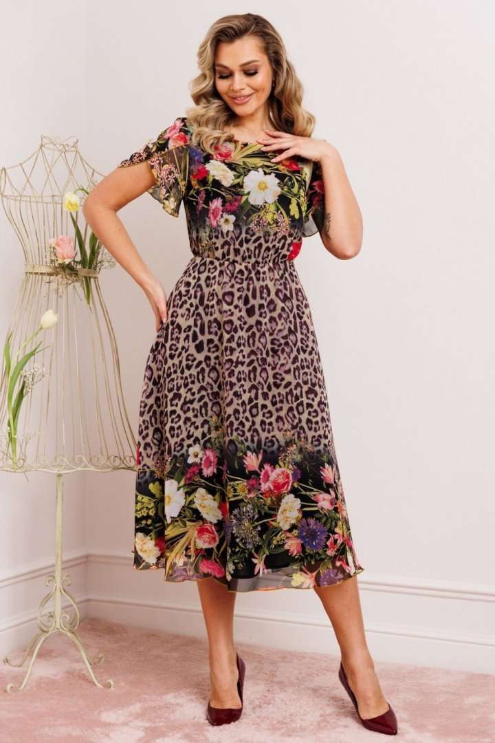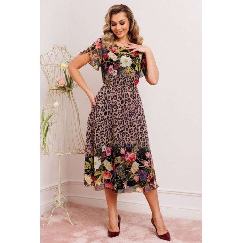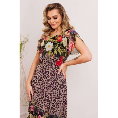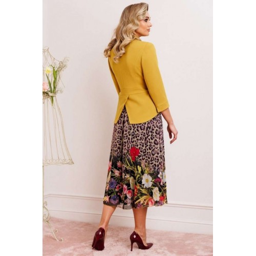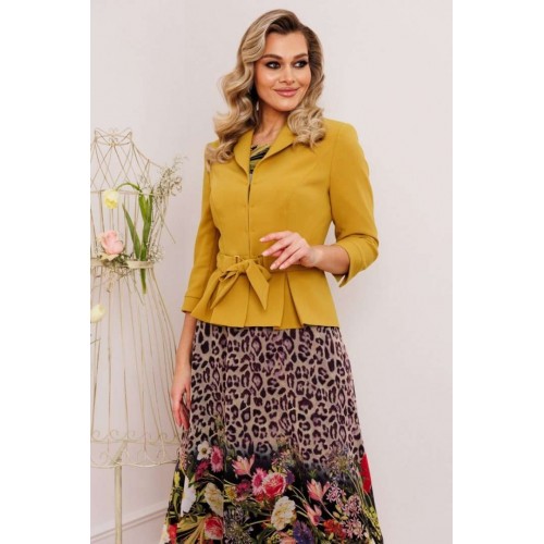 Женственный комплект с ультрамодными принтами. Состоит из жакета и платья. Жакет приталенного силуэта с застежкой встык на декоративные крючки. Воротник пиджачного типа. По переду вертикальные рельефы из проймы. В области талии отрезная планка, переходящая в пояс-завязку через декоративные рамки. По низу переда и спинки фигурная баска со складками. Рукава втачные двухшовные, с манжетой по низу из отделочного материала. Платье приталенное, отрезное по линии талии. Юбка расширенная к низу. Лиф с нагрудными вытачками. Горловина круглой формы. Рукав короткий, втачной. Длина жакета: 63 см длина рукава жакета: 48 см длина платья: 117 см длина рукава платья: 22 см