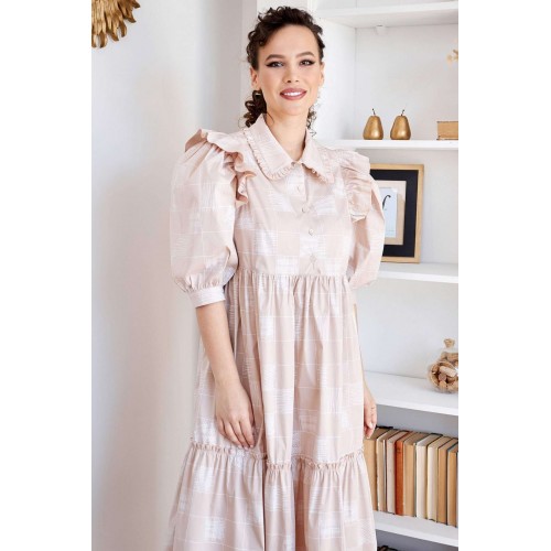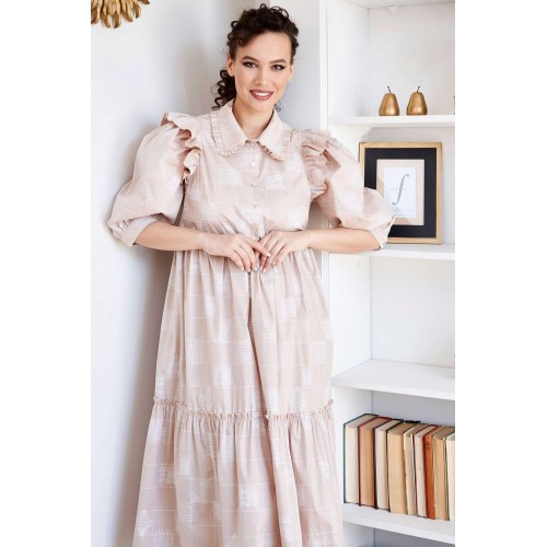 Стильное воздушное платье для ярких весенне-летних будней. Модные объемные рукава, большое количество оборок придают романтичное звучание модели. По переду платья нагрудные вытачки. Застежка на 5 пуговиц от подреза доверху. Воротник стояче-отложной с оборкой по краю. Рукав втачной, одношовный, на притачной манжете, с застежкой на одну пуговицу. Платье декорировано оборками в виде крылышек. К арманы в боковых швах. длина по спинке: 117 см длина рукава: 44 см