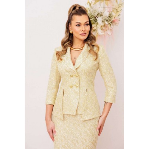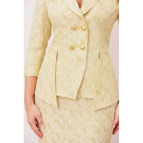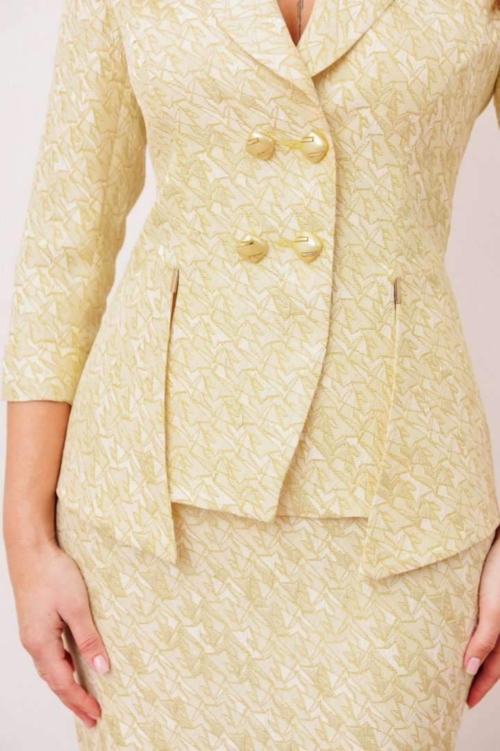Что сделает комплимент Вашей фигуре? Правильный силуэт! Костюм от бренда Мода-Юрс подчеркнет все изгибы и достоинства Вашей фигуры. Жакет полуприлегающего силуэта с отрезной баской фигурной формы и воротником "шалька". Перед с рельефами, выходящими из проймы. Спинка со средним швом. Рукав втачной, двухшовный. Юбка прямая, зауженная к низу, сзади со средним швом, переходящим в шлицу. Застежка на тесьму-молнию. Пояс притачной, по бокам с резинками. Жакет и юбка на подкладке.