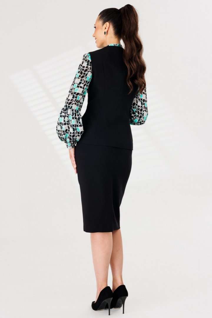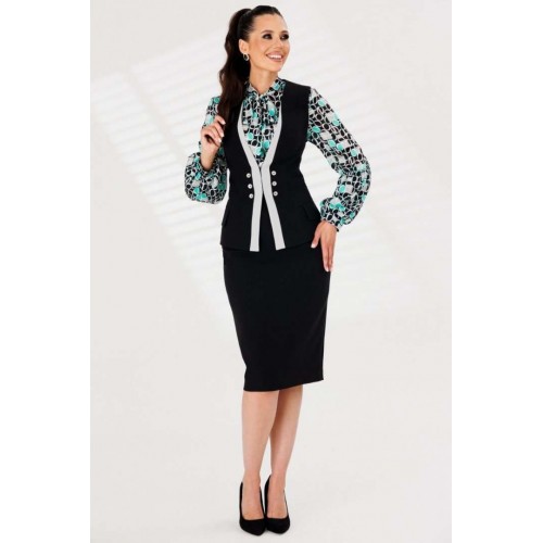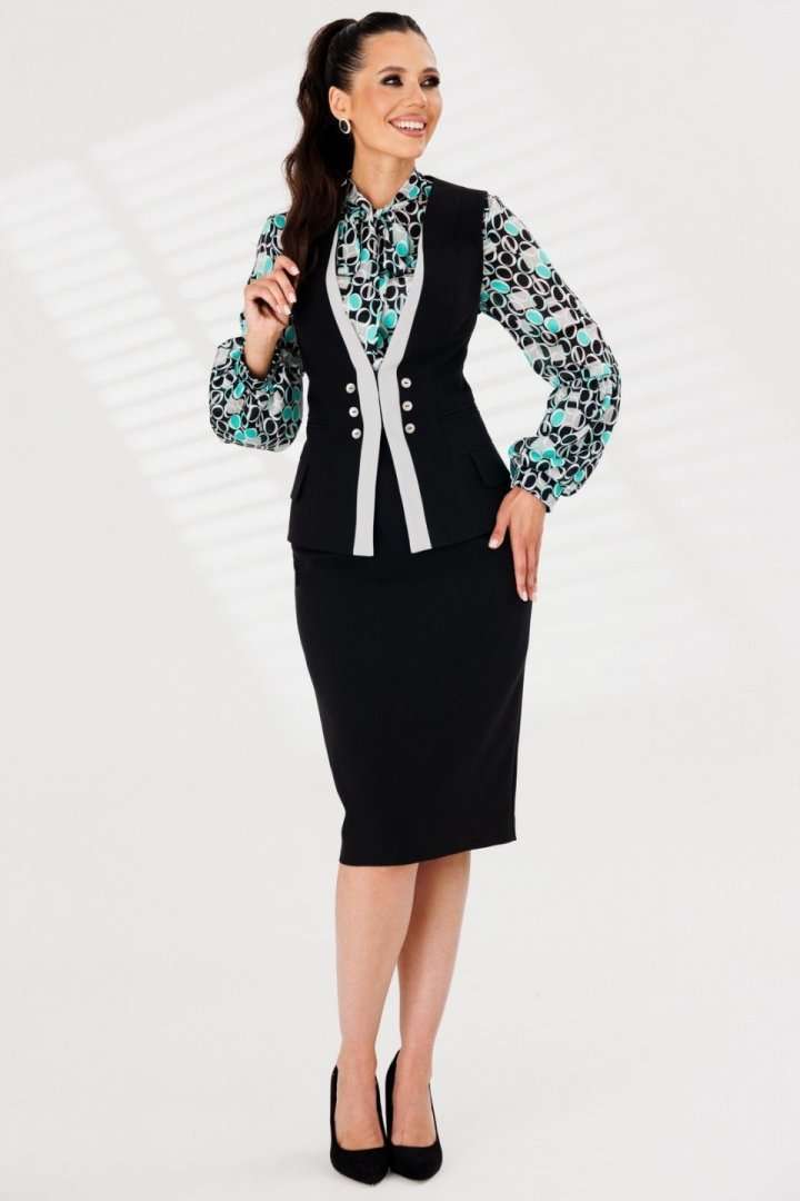 Дизайнеры бренда "Мода-Юрс" нашли интересное сочетание блузы с жилетом и юбкой комфортной длины. Получился идеальный образ для тех, кто предпочитает классический стиль! Жилет полуприлегающего силуэта с рельефами. На полочках обработаны карманы с рамками. Перед и спинка с рельефами. Спинка со средним швом. Борта жилета с притачными планками контрастного цвета. Застежка на пришивные крючки. Жилет на подкладке. Юбка прямая, зауженная к низу на притачном поясе с резинками по бокам. Застежка на тесьму молнию в среднем шве. Юбка на подкладке. Блуза прямого силуэта по переду с нагрудными вытачками, выходящими из боковых швов. Рукава втачные, снизу на притачной манжете с резинкой. Воротник-стойка, переходящая в бант. Длина юбки: 70 см длина жилета: 61 см