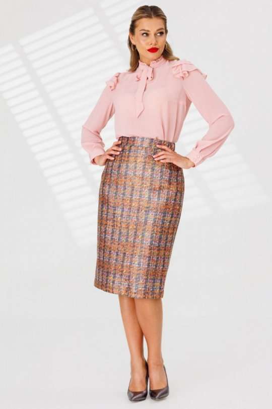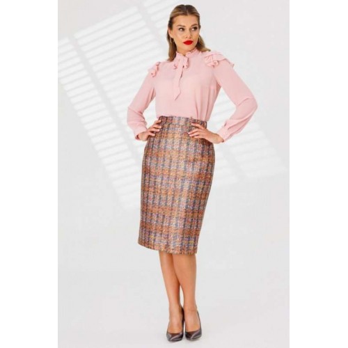 Состав: Жакет: ПЭ 62%, вискоза 33%, спандекс 4% (костюмно-плательное полотно). Юбка: ПЭ 92%, люрекс 8%. Блуза: ПЭ 100% (шифон)