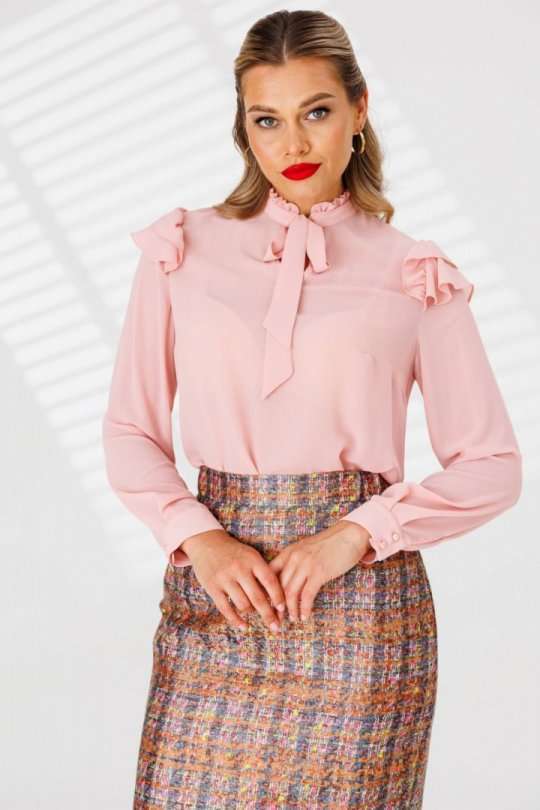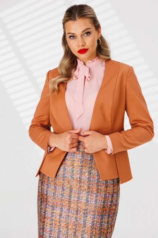 Стильный, трехпредметный костюм от бренда МОДА-ЮРС, состоящий из жакета, блузы и юбки. Жакет полуприлегающего силуэта, отрезной по линии талии, спереди со шлицами. Спинка с талиевыми вытачками и средним швом. Рукав втачной, двухшовный. Застежка центральная на петли-пуговицы. Юбка прямая, зауженная к низу, сверху на притачном поясе. Застежка на тесьму-молнию в среднем шве, который переходит в шлицу. Юбка на подкладке. Блуза прямого силуэта, в боковых швах с разрезами. По переду с нагрудными вытачками, выходящими из бокового шва. Рукав втачной, одношовный, снизу на притачной манжете. Застежка на петли-пуговицы. Главным акцентом блузы является воротник-стойка, переходящий в бант. длина спинки жакета: 63 см длина рукава: 61 см длина юбки по боковому шву: 70 см
