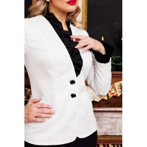 Один из самых элегантных образов в арсенале бренда МОДА-ЮРС. Жакет выполнен из фактурного материала в сочетании с однотоном. Декором и главным акцентом данного комплекта является съемная рюша по линии горловины и низу рукава. Жакет полуприлегающего силуэта с рельефами по переду и спинке. Рукав втачной, двухшовный. Спинка со средним швом. Застежка центральная на петли-пуговицы. Юбка прямая, зауженная к низу, на притачном поясе, по бокам с резинками. Застежка на тесьму-молнию в среднем шве, который переходит в шлицу. Костюм на подкладке. длина жакета: 66 см длина юбки: 69,5 см