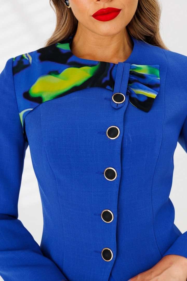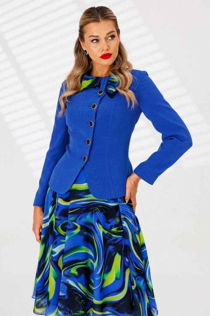 Мягкие линии, яркие оттенки в эффектном образе от бренда "МОДА-ЮРС". Шифоновая юбка и однотонный жакет с акцентной кокеткой станет неотъемлемым спутником для Ваших выходов. Жакет полуприлегающего силуэта с рельефами по переду и спинке. Рукав втачной, двухшовный. Спинка со средним швом. Застежка смещенная на петли-пуговицы. Юбка А-силуэта на притачном поясе, по бокам с резинками. Застежка на тесьму-молнию в боковом шве. Костюм на подкладке. Длина спинки жакета: 60 см длина рукава: 61 см длина юбки по боковому шву: 67 см