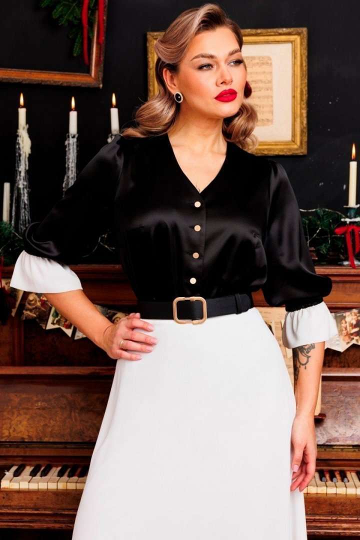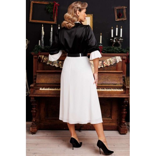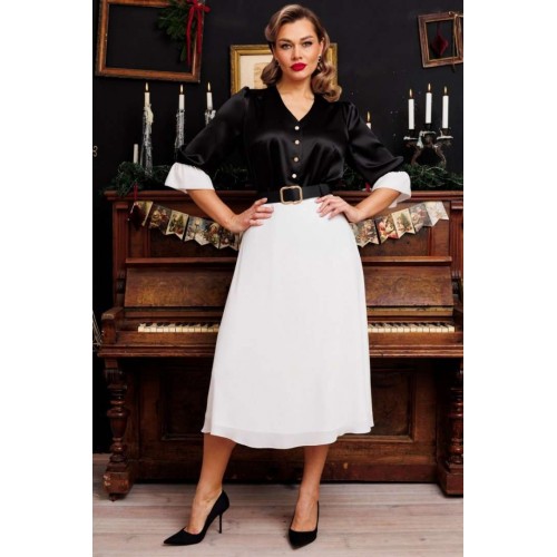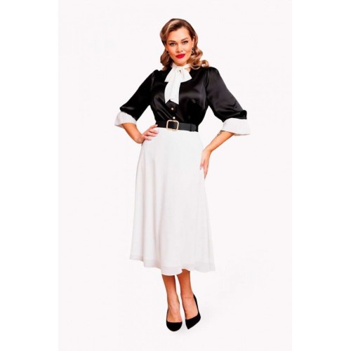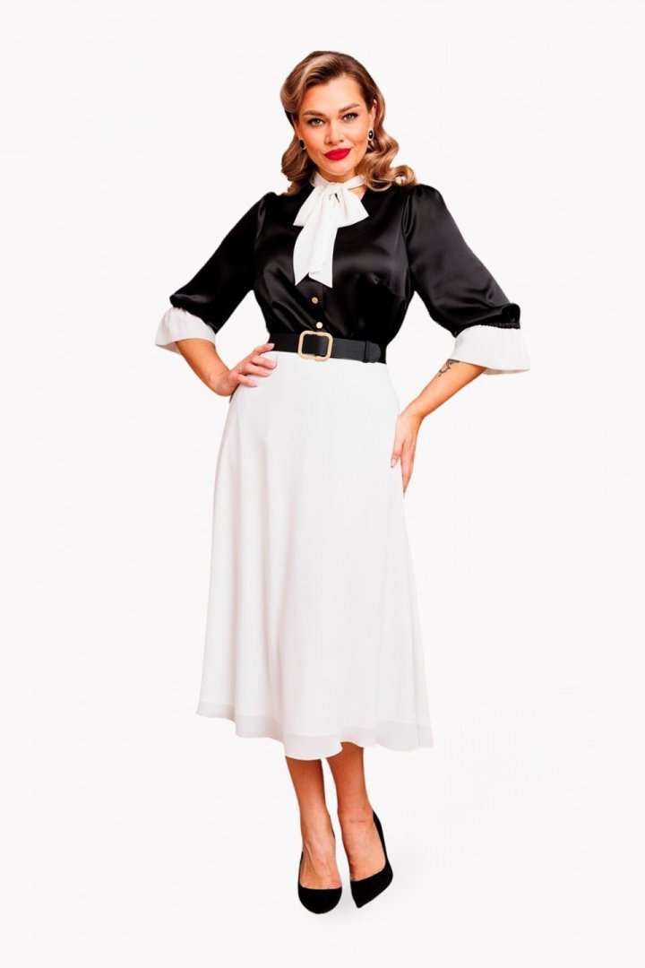 Женственный, изящный, уникальный комплект! Состоит из блузы и юбки. Главным акцентом и декором является съемный шарф, который завязывается в форме банта. Блуза прямого силуэта с нагрудной вытачкой, выходящей из бокового шва. Рукав втачной, одношовный, по низу с притачным воланом контрастного цвета. Вырез горловины V-образной формы. Застежка на петли-пуговицы. Юбка А-силуэта на притачном поясе, по бокам с резинками. Юбка на подкладке. Комплект дополнен съемным ремнем, что позволяет регулировать ширину по линии талии.
