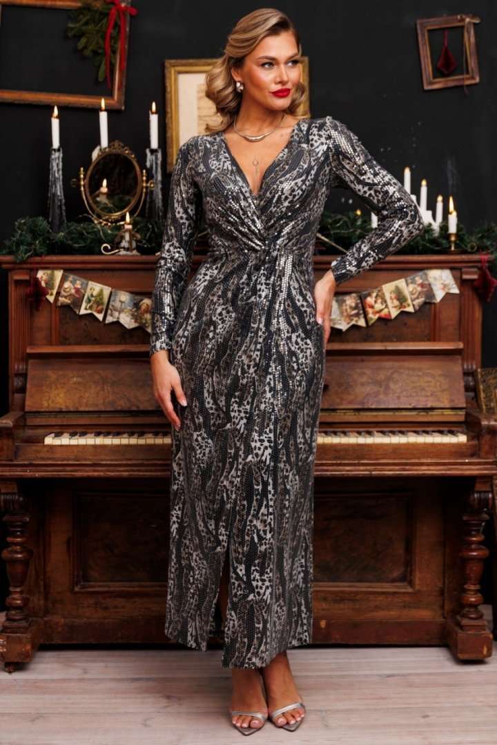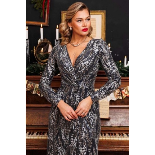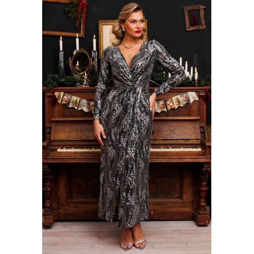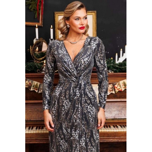 Блеск софитов, огни салютов, игривые пузырьки в бокале - и Ваше сияние обеспечено нашим вечерним платьем с пайетками и принтом под кожу рептилии. Это действительно озорно, игриво, празднично! И, как ни крути, приковывает взгляды! Представленное платье приталенного силуэта. Спинка с талиевыми вытачками. Перед отрезной по линии талии. Лиф с эффектным V-образным вырезом и узлом в области талии. Юбка на запах. Рукав полуреглан, присборенный на резинку в нижней части (по шву). Платье на подкладке. Материал платья - тонкий трикотаж с пайетками. Хорошо тянется.