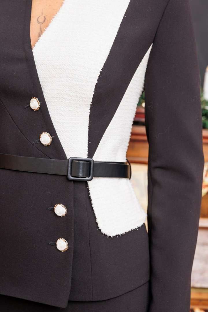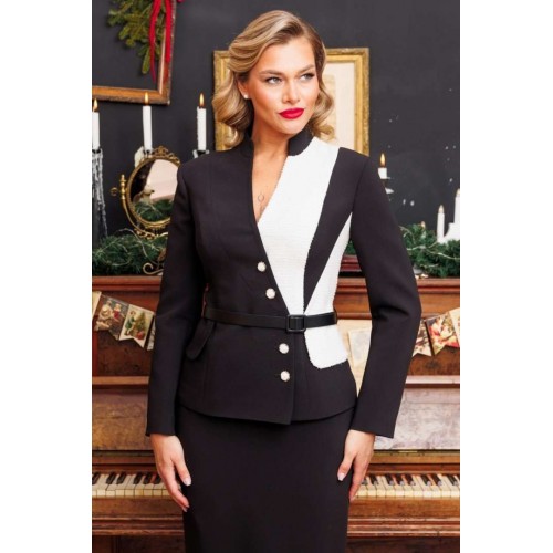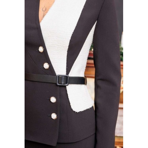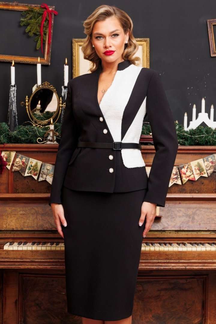 Если Вы хотите выглядеть шикарно на работе, учебе или любой важной встрече, выбирайте для себя костюм от бренда "Мода-Юрс" с идеальной посадкой. Строгий и одновременно утонченный дуэт из приталенного жакета и юбки-карандаш. Жакет выполнен из однотонного черного текстиля в сочетании с контрастным трикотажным полотном молочного цвета. Жакет с рельефами по переду и спинке. Спинка со средним швом. Рукава втачные, двухшовные. Воротник-стойка. Застежка на петли-пуговицы. Комплект дополнен съемным поясом, что позволяет регулировать ширину по линии талии. Юбка прямая, зауженная к низу, сверху на притачном поясе, по бокам с резинками. Застежка на тесьму-молнию в среднем шве, который переходит в шлицу. Комплект на подкладке. длина спинки: 61,5 см длина юбки: 70 см