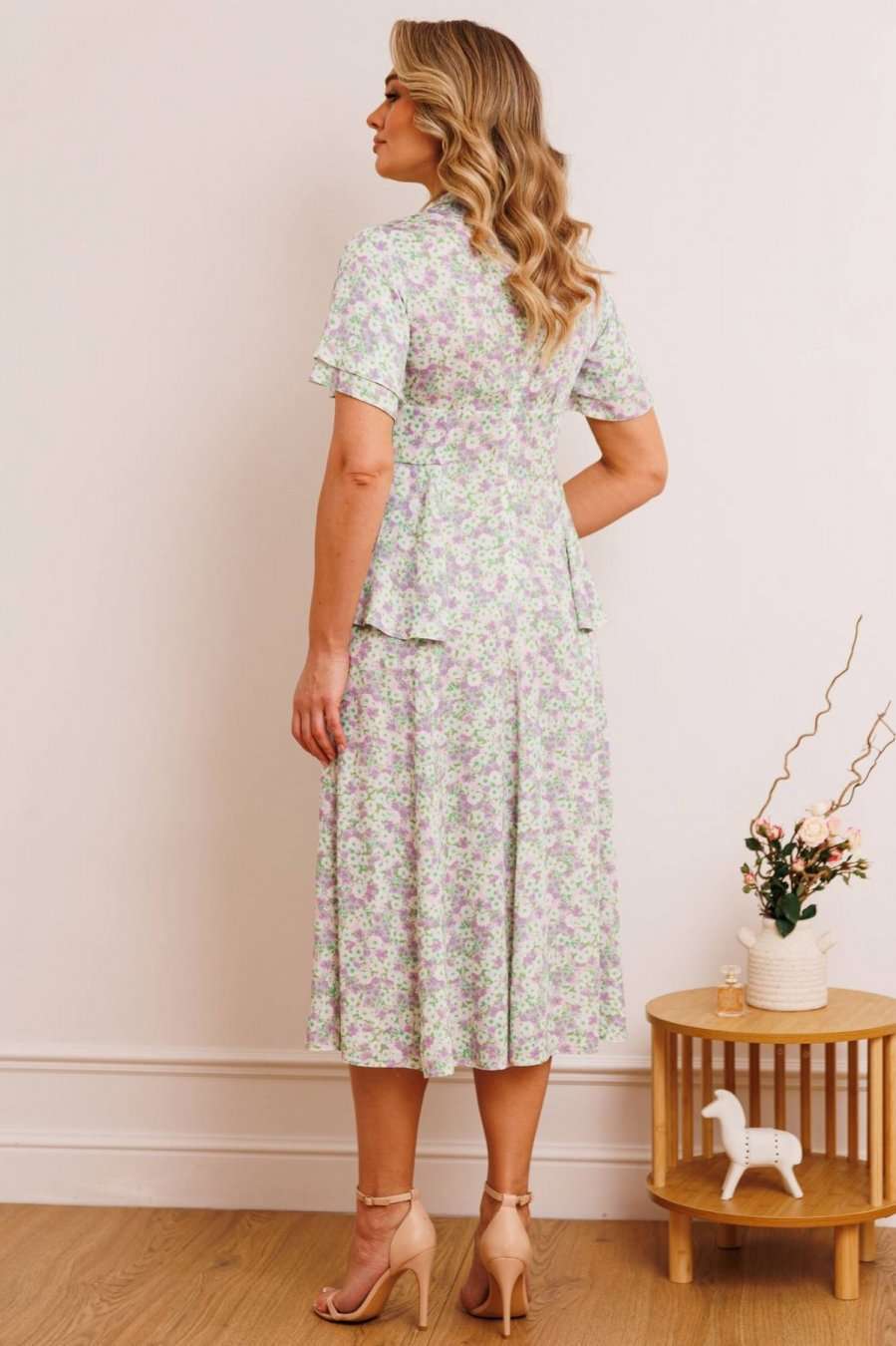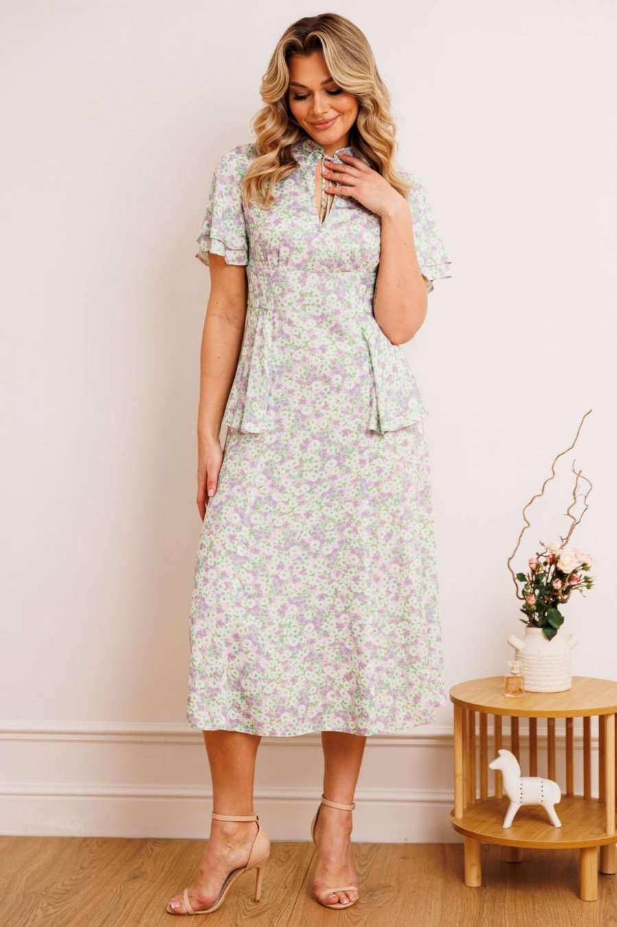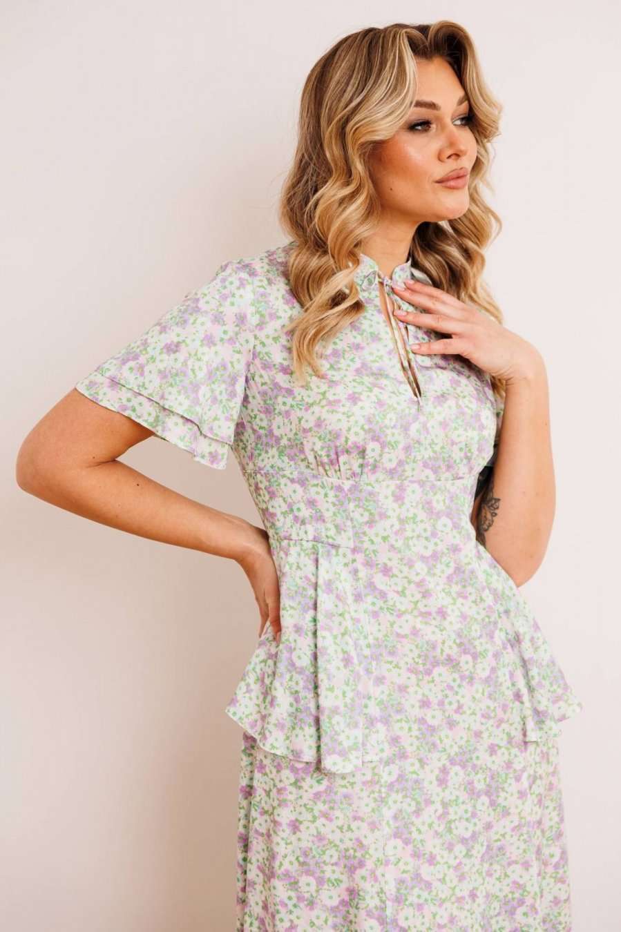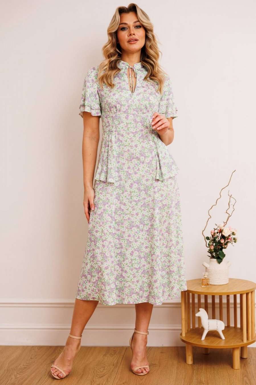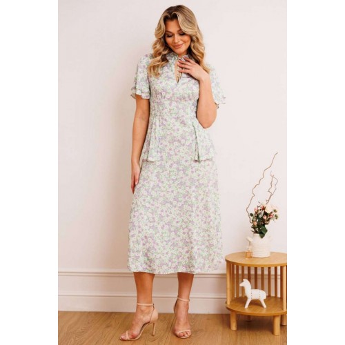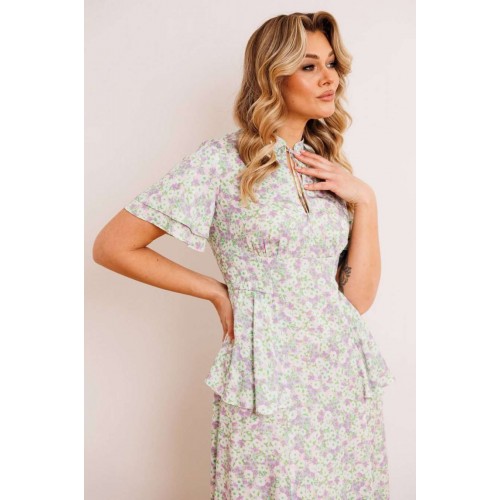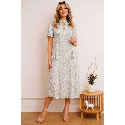 Платье из штапеля - прекрасный легкий вариант для жаркого лета. Платье приталенного силуэта, расширенное к низу. Отрезное по талии. По спинке молния в среднем шве. По переду небольшая сборка в области груди из подреза. В области бедер волан-баска из подреза, переходящий на спинку. Воротник - небольшая стойка с завязкой и вырезом капелькой. Рукав-волан двойной, разной длины. длина по спинке: 120 см рост: 164 см