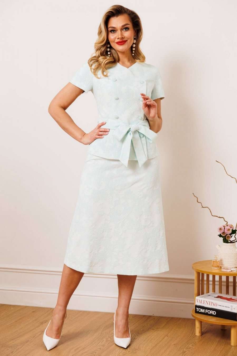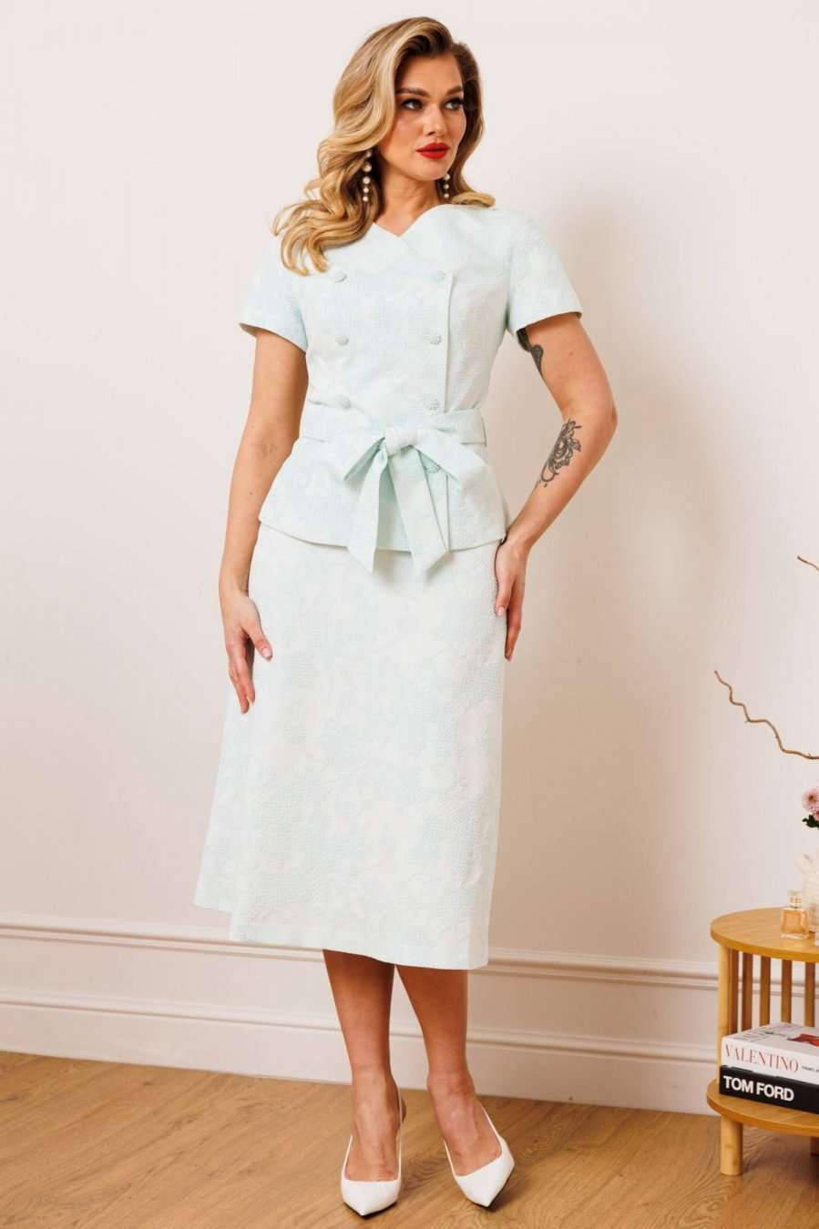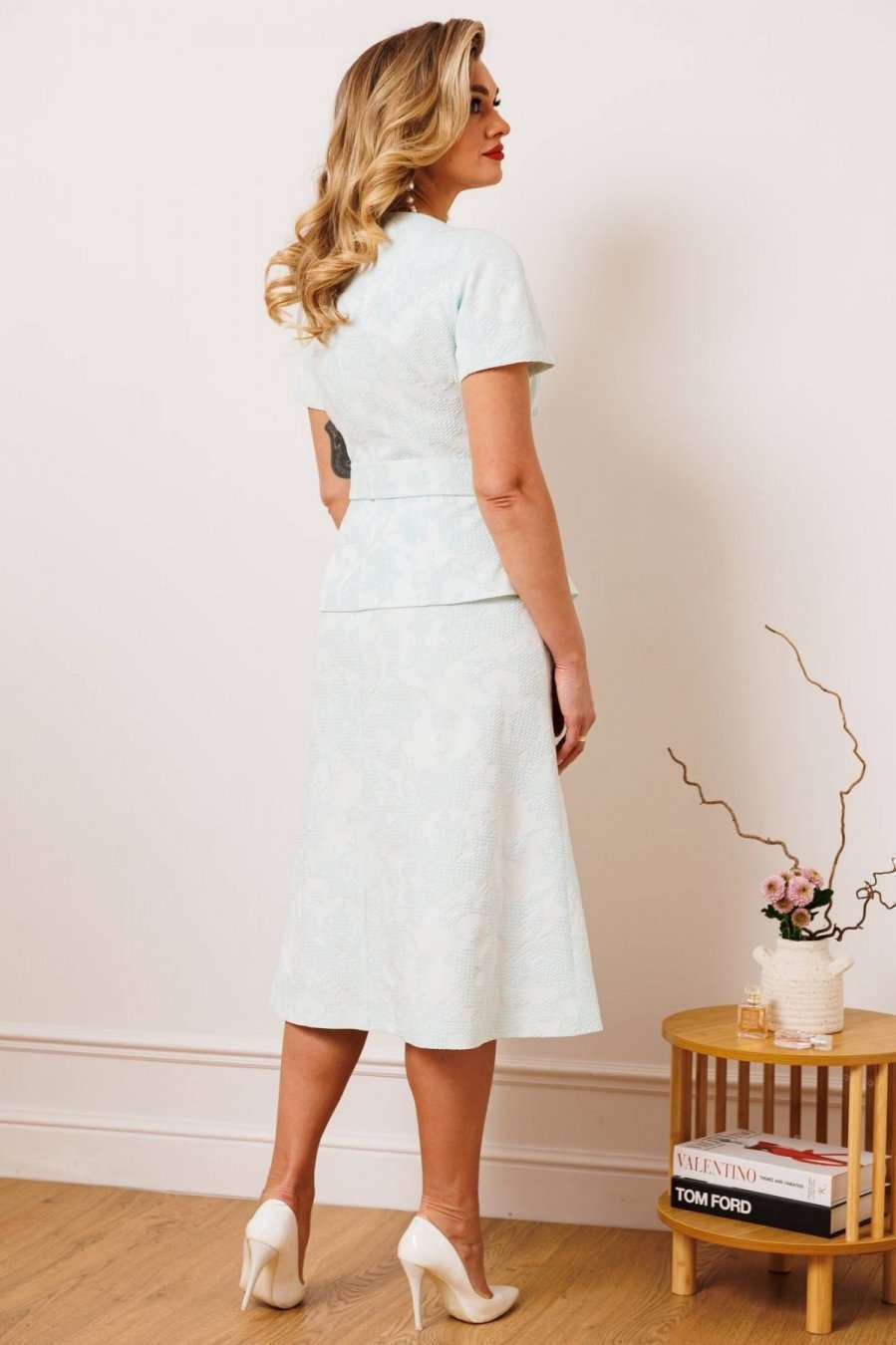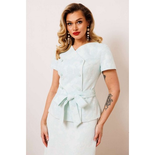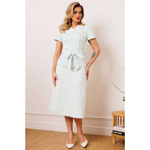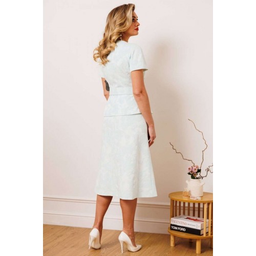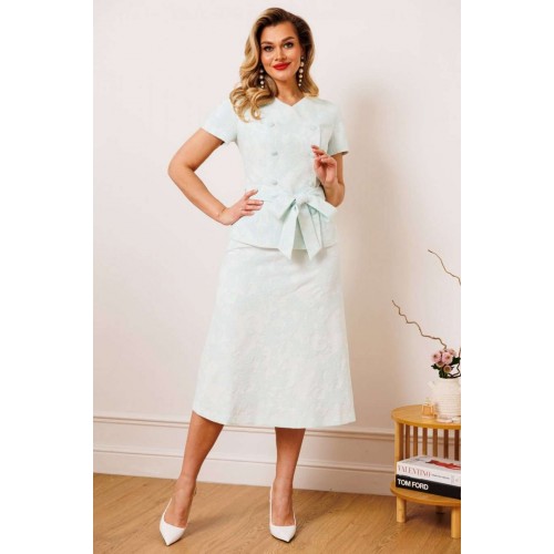 Двухпредметный комплект, состоящий из жакета с цельнокройным рукавом и юбки А-силуэта. Жакет полуприлегающего силуэта с фигурным вырезом горловины. Рукав цельнокройный. Перед и спинка с рельефами. Спинка со средним швом. Застежка двубортная на петли-пуговицы. Юбка А-силуэта, сверху на притачном поясе, с резинкой сзади. Застежка на тесьму-молнию в боковом шве. Комплект дополнен поясом, что позволяет регулировать ширину по линии талии. длина жакета: 59,5 см длина юбки: 77 см