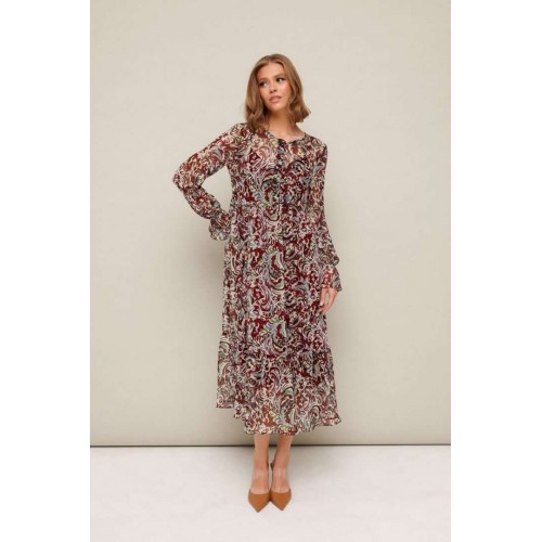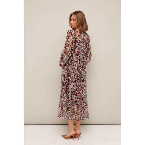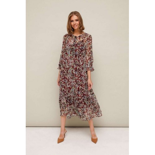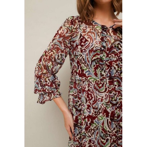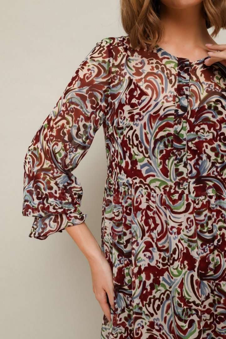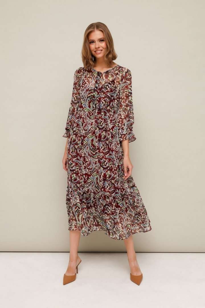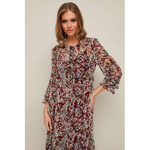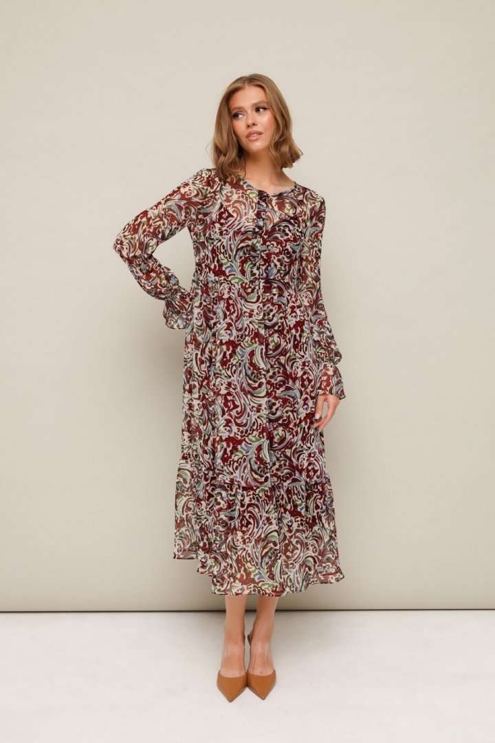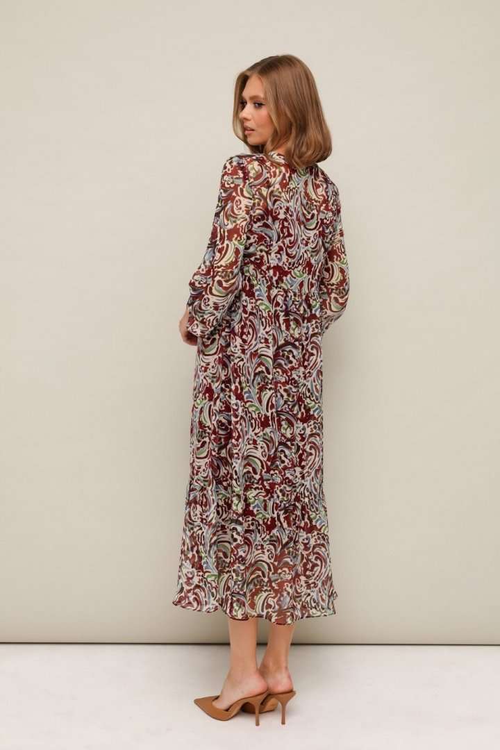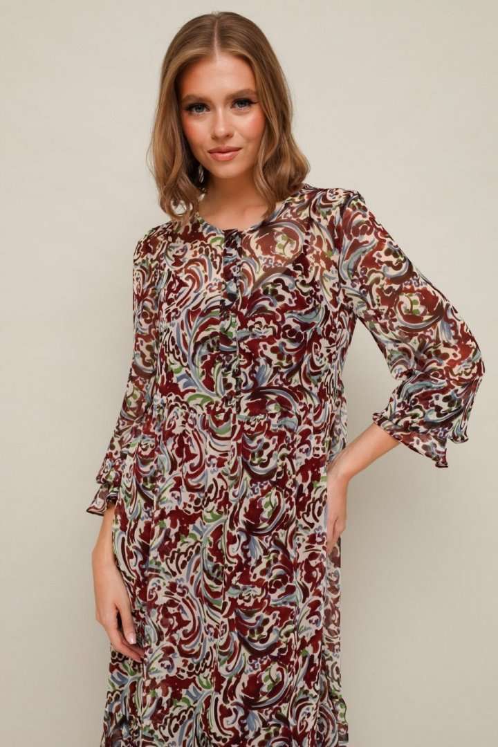 Платье из шифона с абстрактным принтом, отрезное выше линии талии. Горловина округлой формы. Лиф платья с застежкой на притачные планки с петлями и пуговицами. Нижняя часть платья с притачным воланом со сборкой. Рукава длинные втачные на резинке в области запястья. В комплекте прилагается нижнее платье-комбинация на регулируемых бретелях