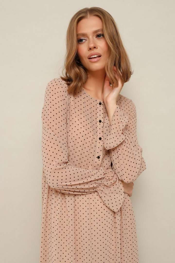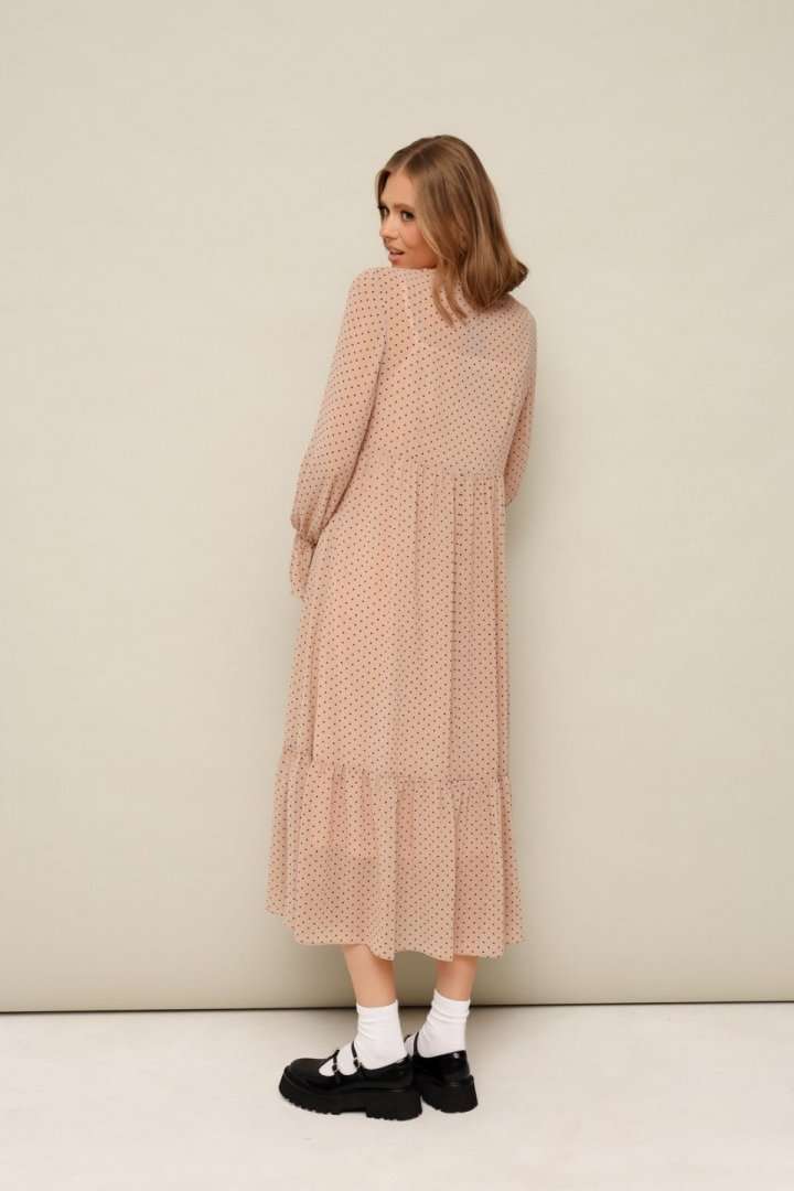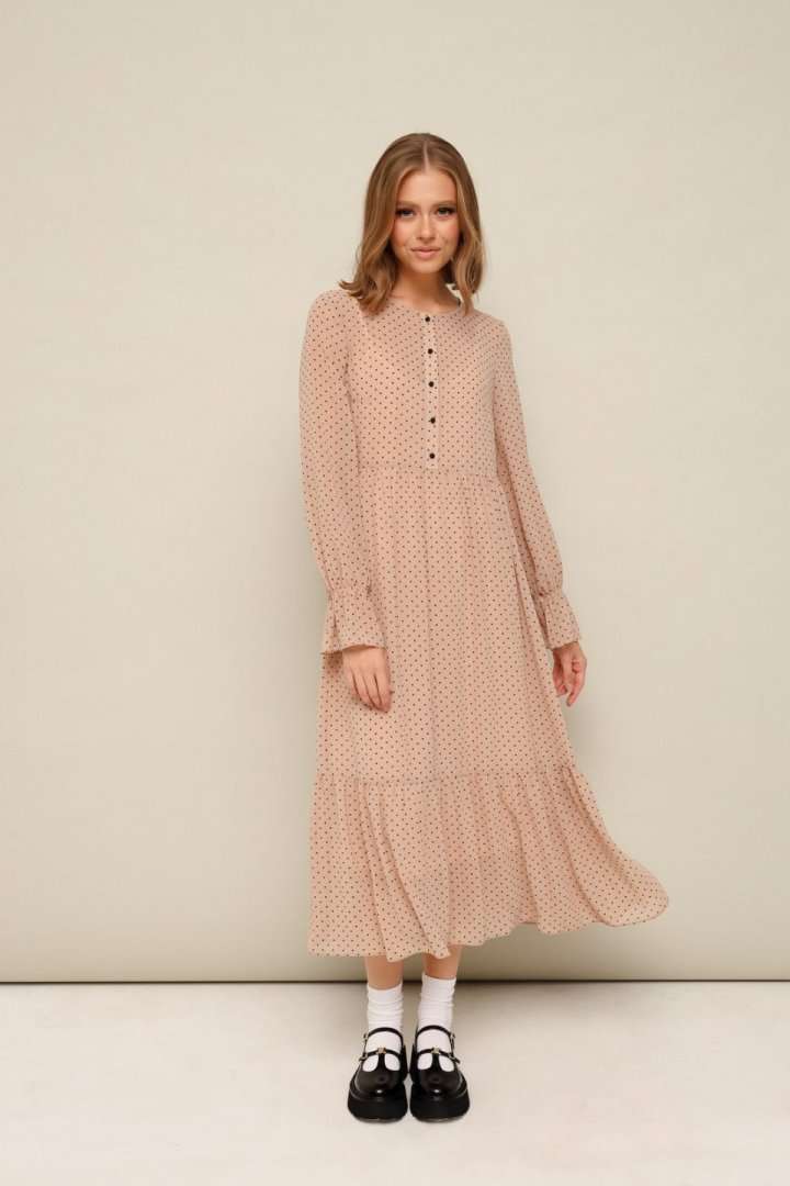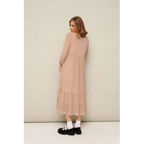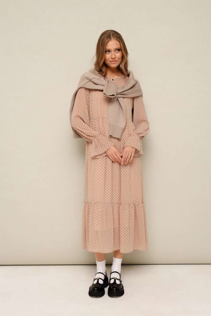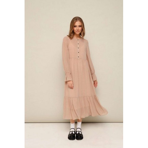 Платье из шифона с абстрактным принтом, отрезное выше линии талии. Горловина округлой формы. Лиф платья с застежкой на притачные планки с петлями и пуговицами. Нижняя часть платья с притачным воланом со сборкой. Рукава длинные втачные на резинке в области запястья. В комплекте прилагается нижнее платье-комбинация на регулируемых бретелях.