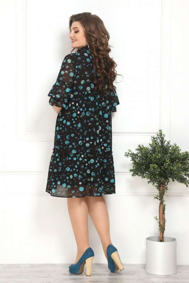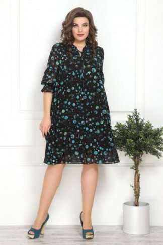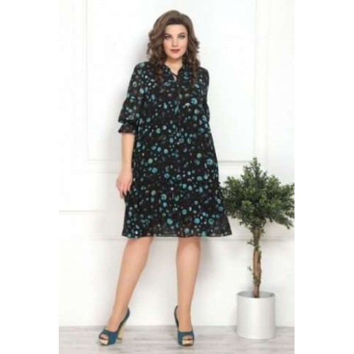 Платье женское, молодежного стиля, свободного силуэта. Горловина V-образного силуэта, на стойке со сборкой и завязывается на завязку. Лиф платья отрезной выше талии. Платье состоит из 2-х воланов со сборкой. Рукав 3/4, низ рукава так же с воланом на резинке. Платье на трикотажной подкладке. Длина изделия в 50р-97см, длина рукава в 50р-48см. 48 Обхват бюста - 96см, Обхват талии - 76-80см, Обхват бёдер - 104см. 50 Обхват бюста - 100см, Обхват талии - 80-84см, Обхват бёдер - 108см. 52 Обхват бюста - 104см, Обхват талии - 84-88см, Обхват бёдер - 112см. 54 Обхват бюста - 108см, Обхват талии - 88-92см, Обхват бёдер - 116см. 56 Обхват бюста - 112см, Обхват талии - 92-96см, Обхват бёдер - 120см. 58 Обхват бюста - 116см, Обхват талии - 96-100см, Обхват бёдер - 124см
