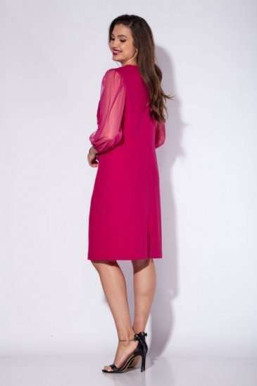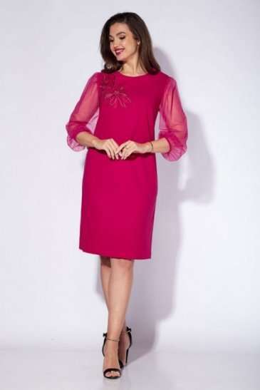 Платье женское, полуприлегающего силуэта с рукавом длиной 7/8. Рукав выполнен из отделочной ткани(сетка), фантазийной формы. По верху рукава сборка. Низ так же присобран на узкую резинку. По переду нагрудные и талевые вытачки. Перед платья, сверху задекорирован вышивкой. Вырез горловины круглой формы. По спинке средний шов и талевые вытачки. Застежка в шве на потайную "молнию". По низу разрез. Длина платья по спинке 48-50 р. - 93 см, 52-56 р. - 96 см.