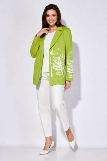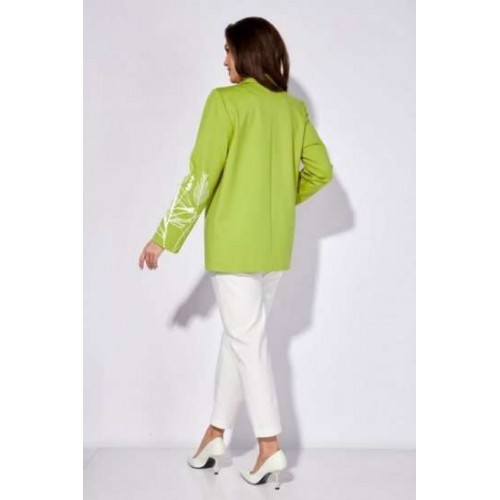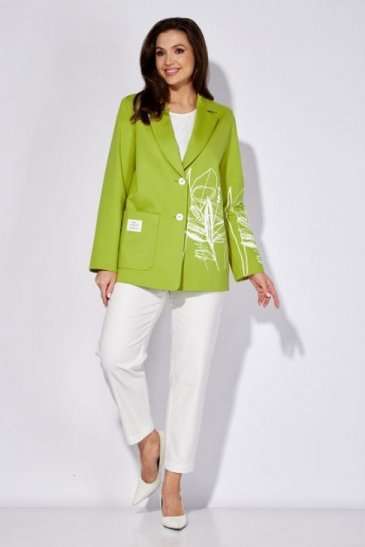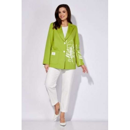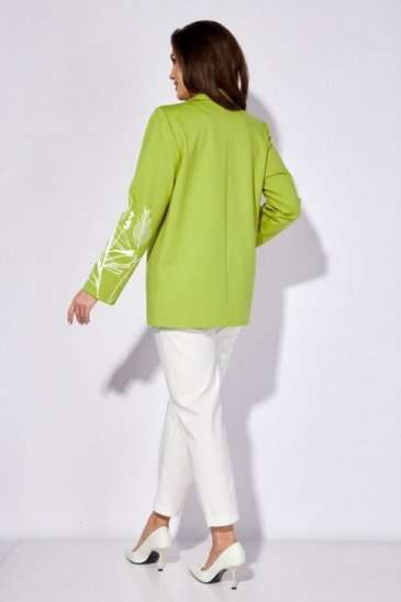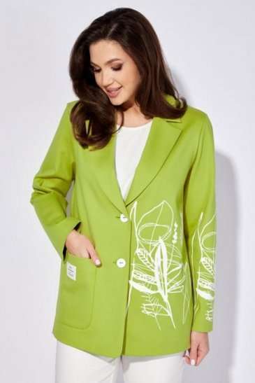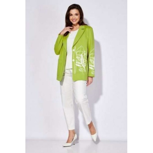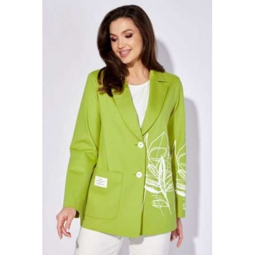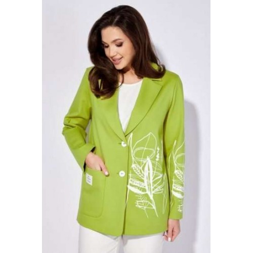 Жакет женский, облегченный, выполнен из трикотажного полотна, без подкладки, прямого силуэта с длинным втачным рукавом. Воротник пиджачного типа с лацканами. Застежка однобортная на петли и пуговицы. Левая полочка и рукав акцентированы ярким принтом. На правой полочке накладной карман с декоративной нашивкой. Спинка со средним швом.