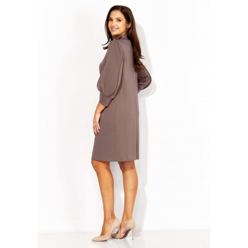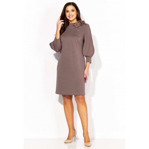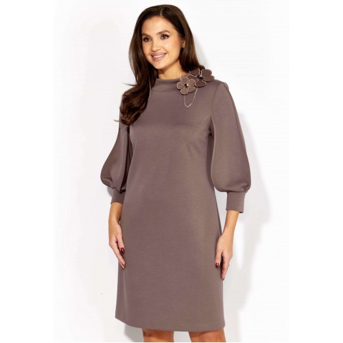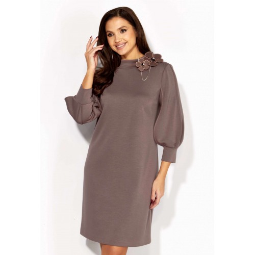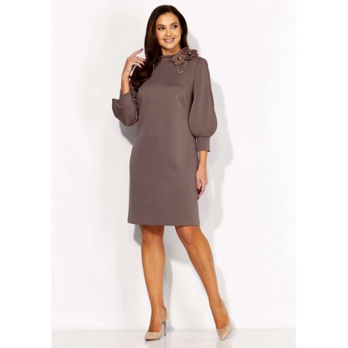 Платье женское, А-силуэта с втачным рукавом, длинной 3/4. Рукав фантазийной формы, типа "фонарик" состоящий из четырех деталей. Швы рукава отстрочены стройкой "на ребро" По переду нагрудные вытачки из пройм. Горловина оформлена расширенной, мягкой строчкой. Декором служит съемное украшение.