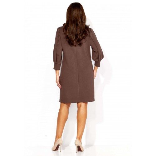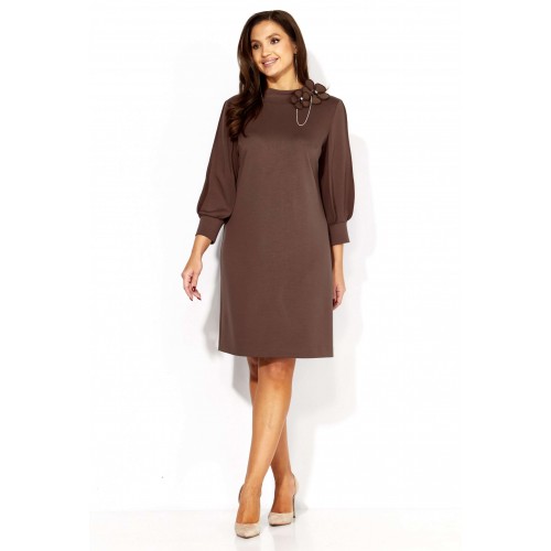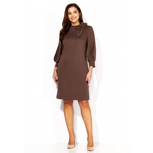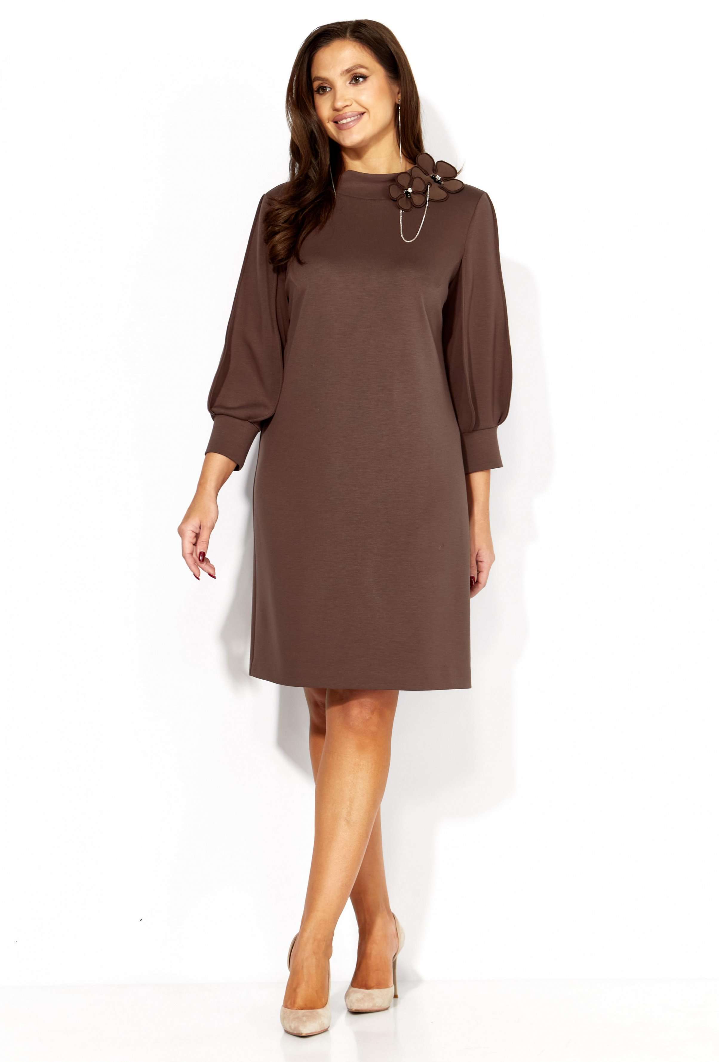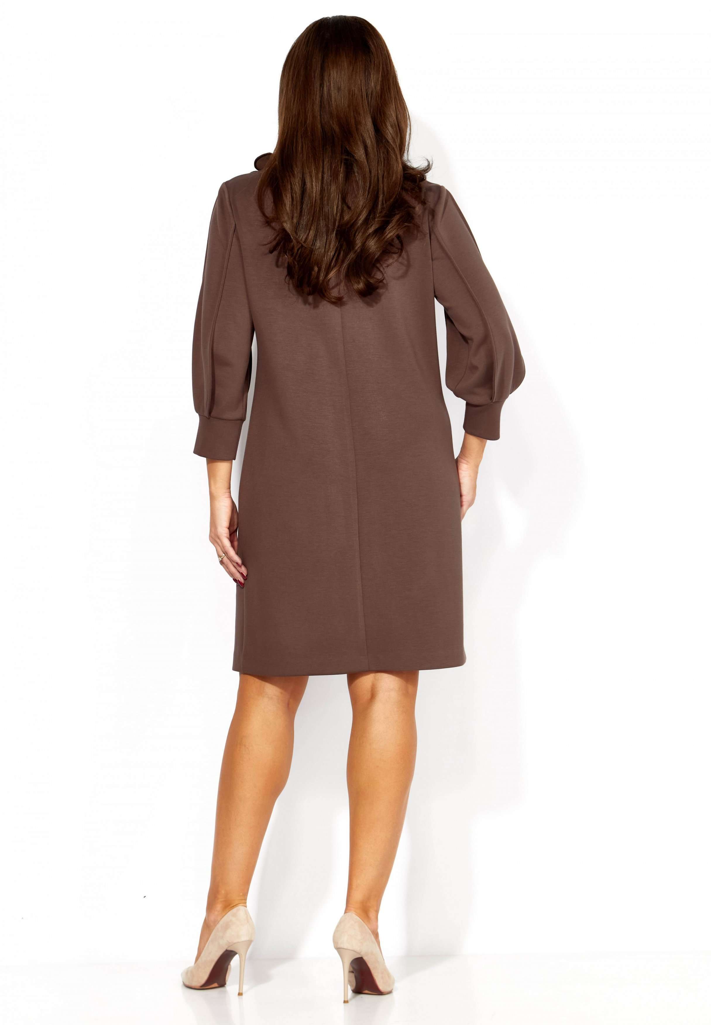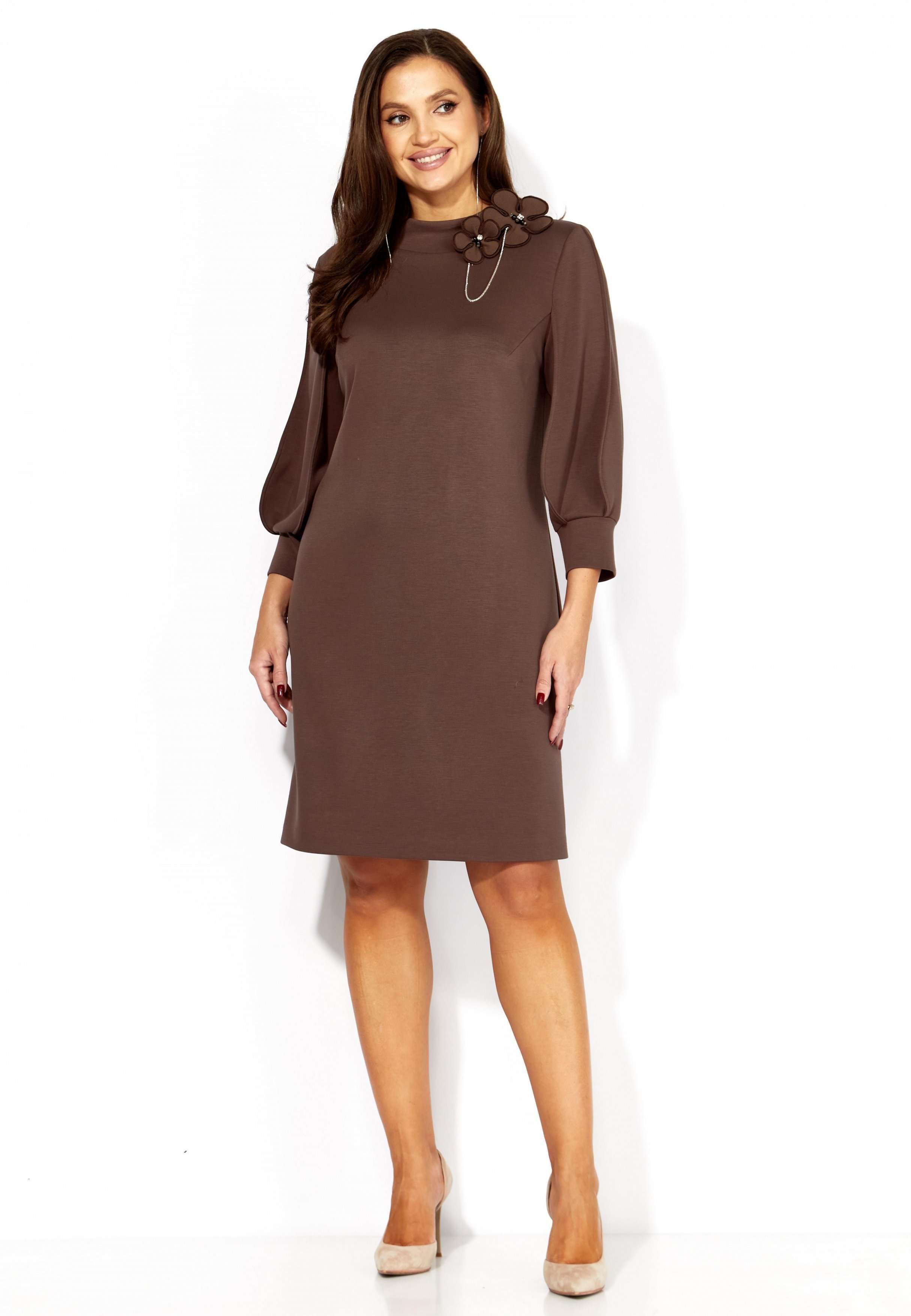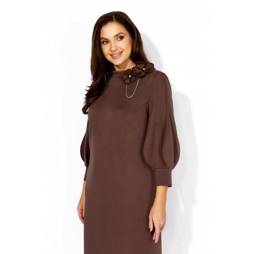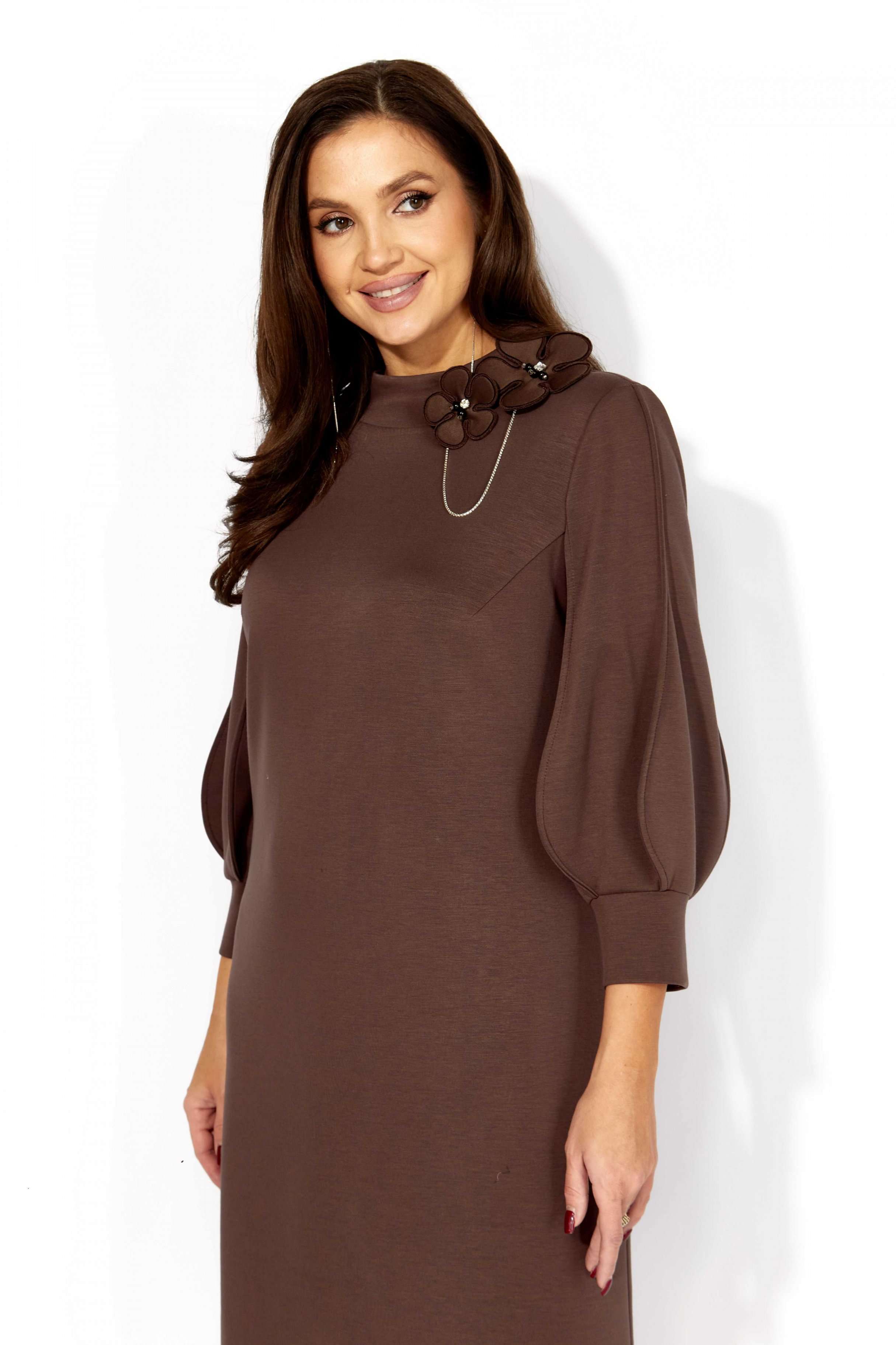 Платье женское, А-силуэта с втачным рукавом, длинной 3/4. Рукав фантазийной формы, типа "фонарик" состоящий из четырех деталей. Швы рукава отстрочены стройкой "на ребро" По переду нагрудные вытачки из пройм. Горловина оформлена расширенной, мягкой строчкой. Декором служит съемное украшение.