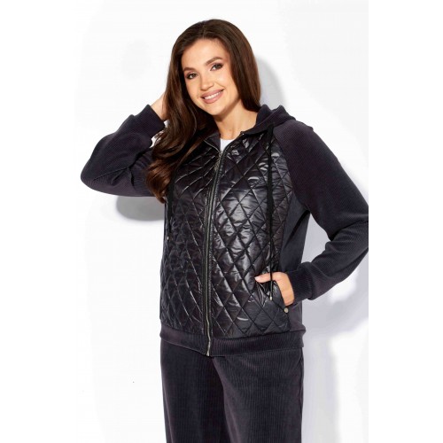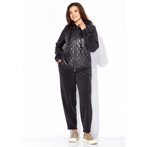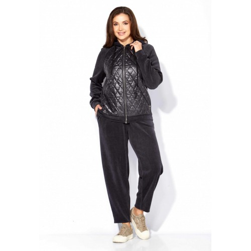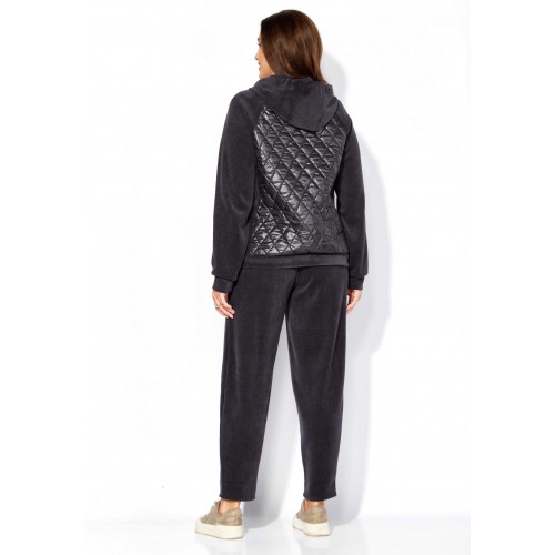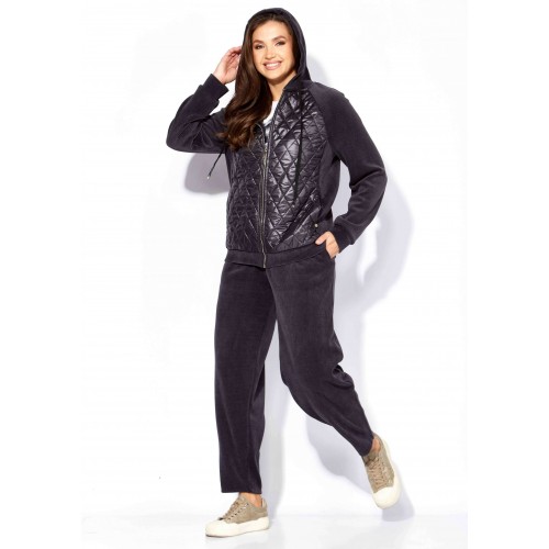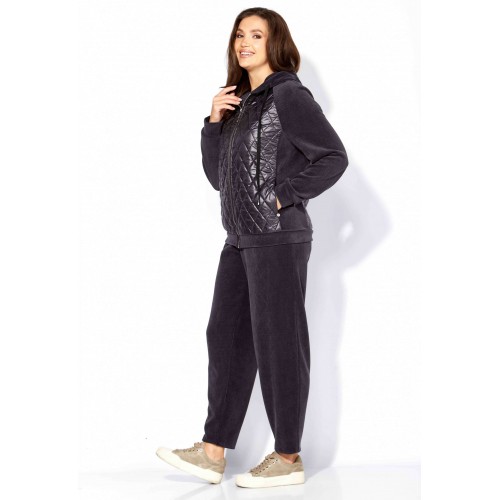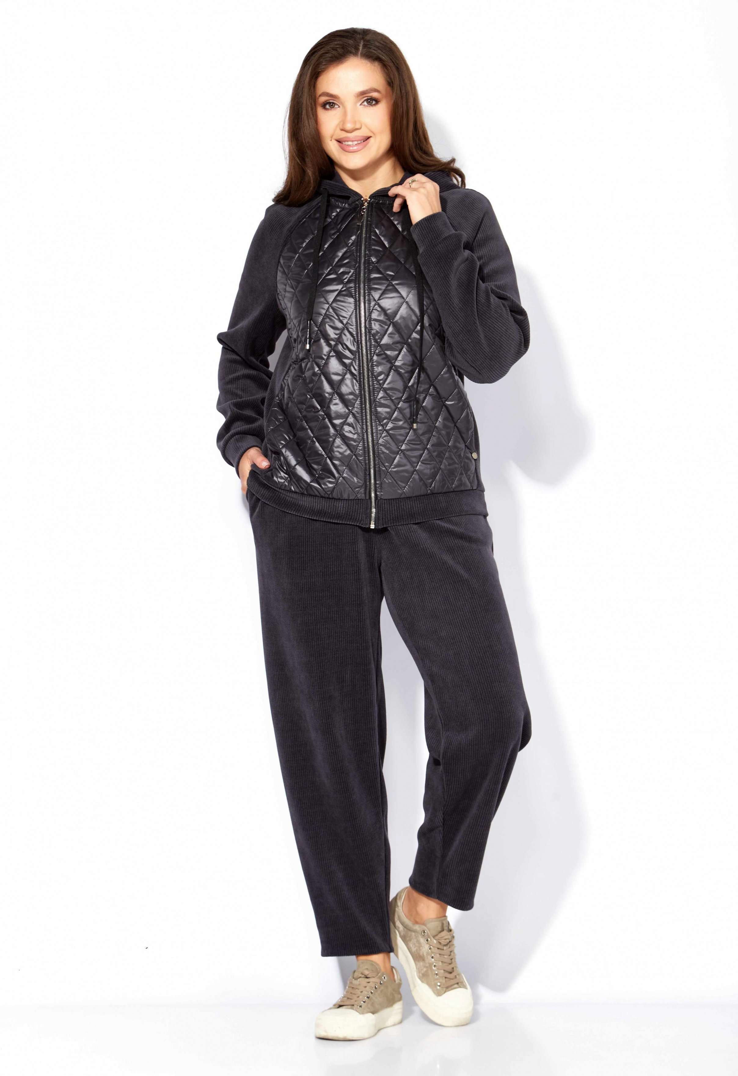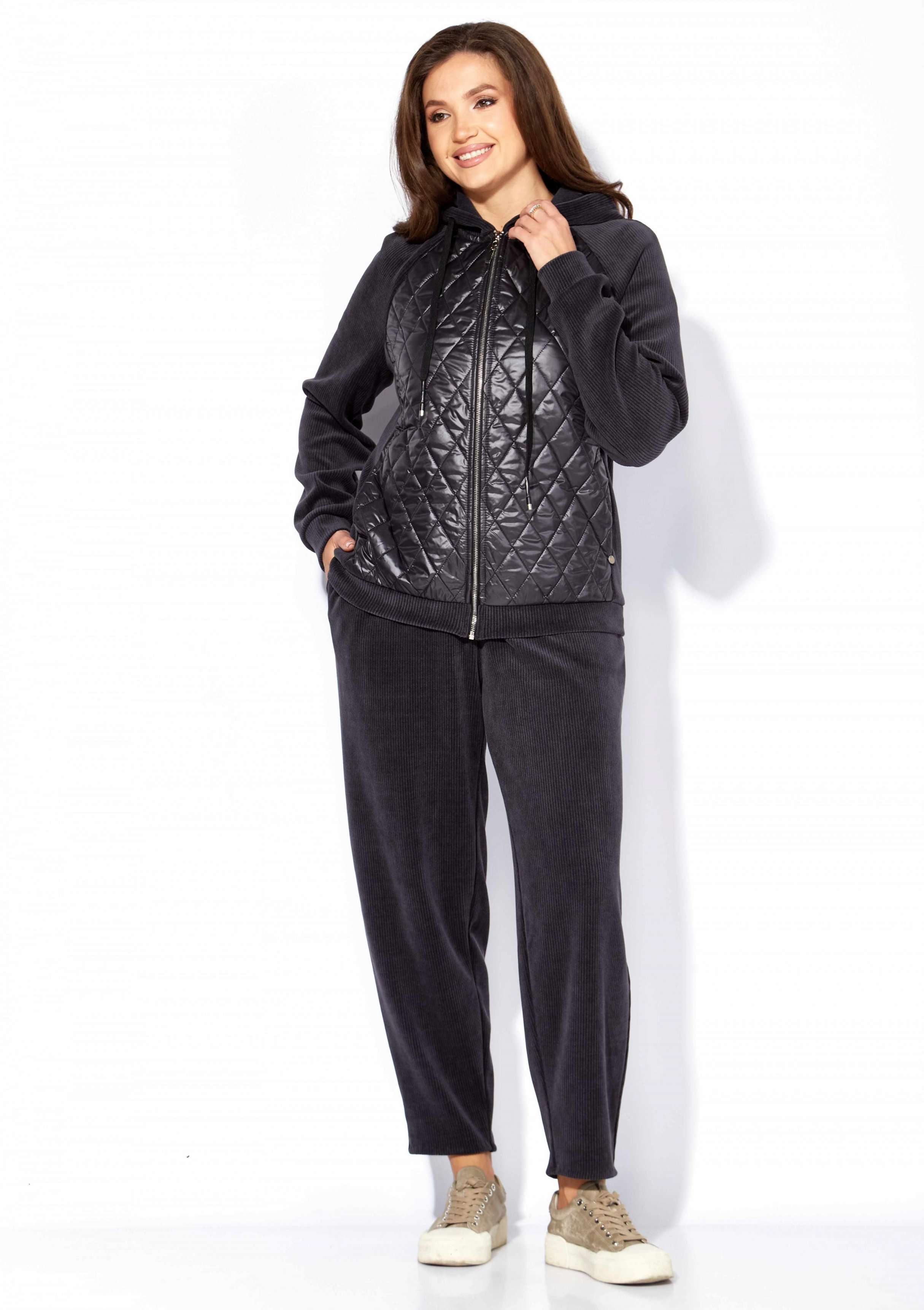 Комплект женский, 2хпредметный, состоящий из куртки и брюк. Куртка прямого силуэта с длинным рукавом. Рукав "реглан" с манжетой по низу. По переду и спинке рельефы из пройм. Спереди, в рельефах, карманы. Застежка центральная, на "молнию". Горловина оформлена капюшоном с кулисой по краю. Низ куртки на манжете. Центральные детали переда и спинки из стежки (плащевка на синтепоне.) Брюки-слаксы, объемные, к низу зауженные. Карманы в боковых швах. Сзади накладной карман с декоративной нашивкой. Пояс цельнокроеный, на резинке.