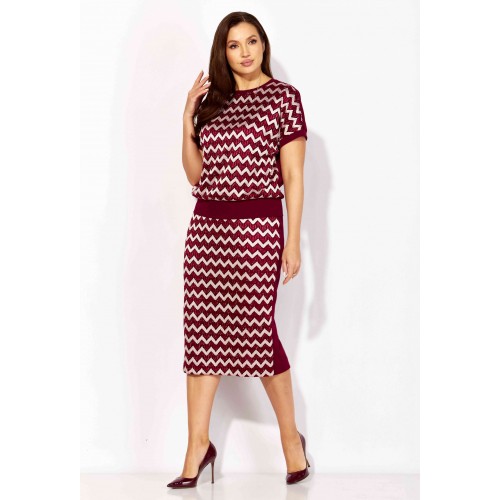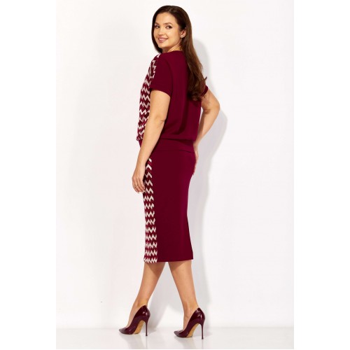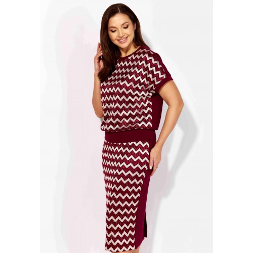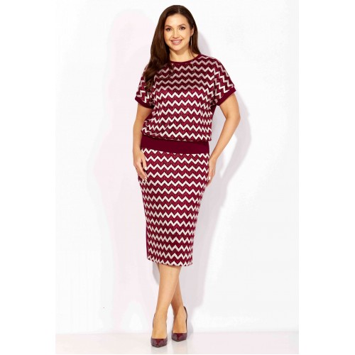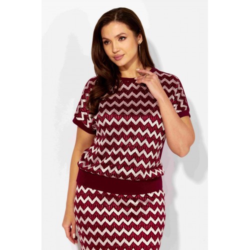 Комплект женский, 2х предметный, состоящий из блузы и юбки. Блуза прямого силуэта, с коротким цельнокроеным рукавом, снизу на манжете. Вырез горловины круглой формы. По низу рукавов и горловине подрезные бейки. Юбка прямая. Сзади средний шов и подрез снизу. Пояс на резинке(по переду отрезной, по спинке цельнокроеный) Перед блузы и юбки выполнен из полотна с паетками, спинка блузы и юбки из гладкого трикотажного полотна. По переду блузы и юбки трикотажная подкладка.