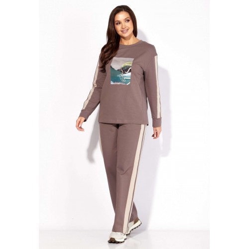 Комплект женский, 3-х предметный, состоящий из свитшота, брюк и жилета. Свитшот прямого силуэта с отрезными бочками. Рукав длинный, со спущенной линией плеча, снизу на манжете. Горловина круглой формы с подрезной бейкой. Перед задекорирован принтом. Брюки прямые с карманами в боковых швах. По низу небольшой разрез. Пояс притачной с резинкой (по центру гладкий). По бокам брюк и по центру рукавов втачные отделочные лампасы с контрастным кантом. Жилет выполнен из плащевки на синтепоне (vs100) на подкладке, прямого силуэта. По переду рельефы из пройм в боковой шов. В рельефах карманы с отделочными деталями в форме клапана. Застежка центральная на тесьму-молния. Горловина оформлена капюшоном со стойкой и кулисой. По спинке фигурные рельефы. Центральная часть с отделочной деталью и декоративной нашивкой. Низ жилета по спинке чуть длиннее.